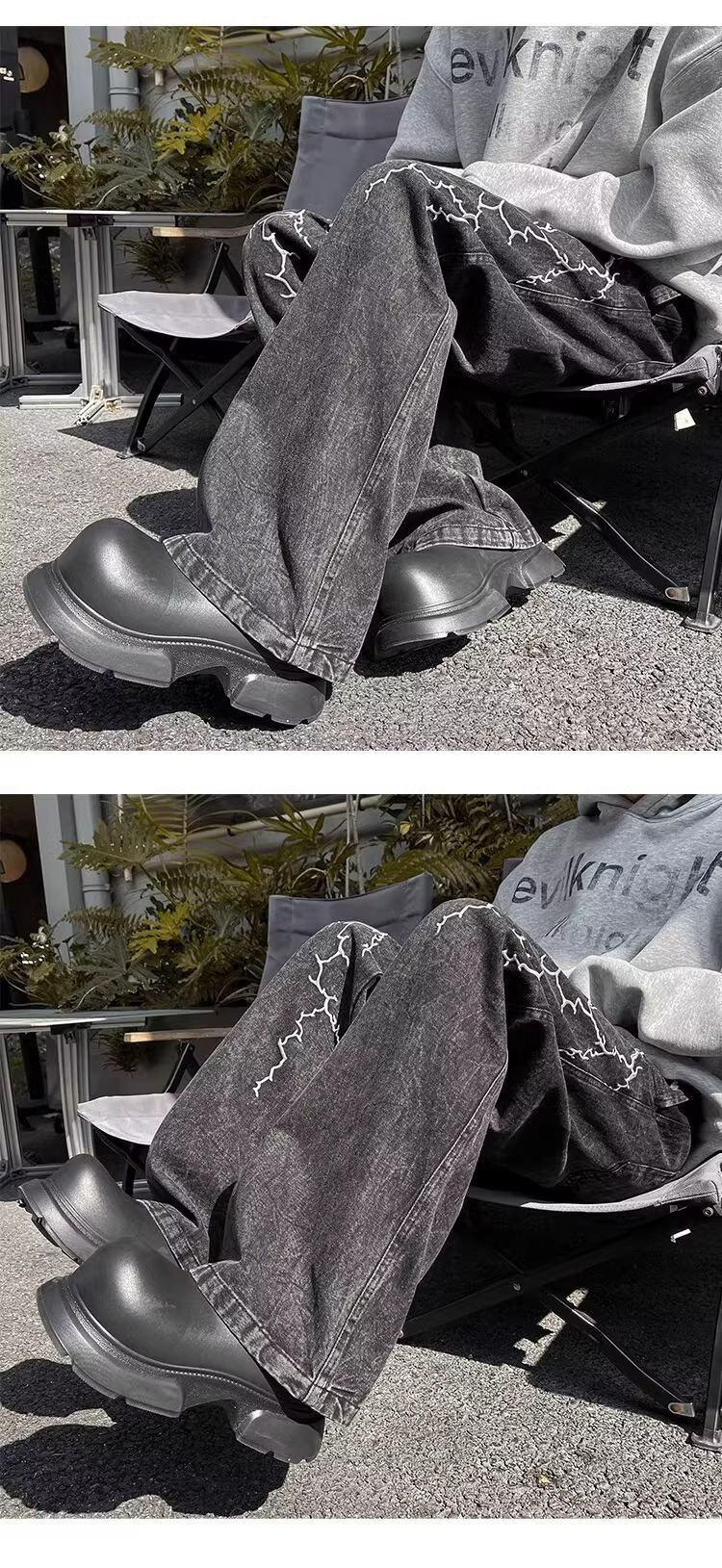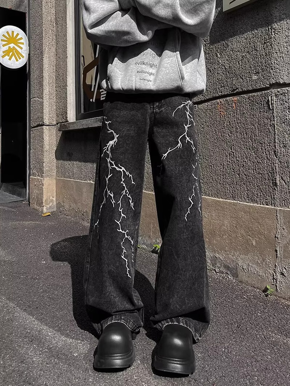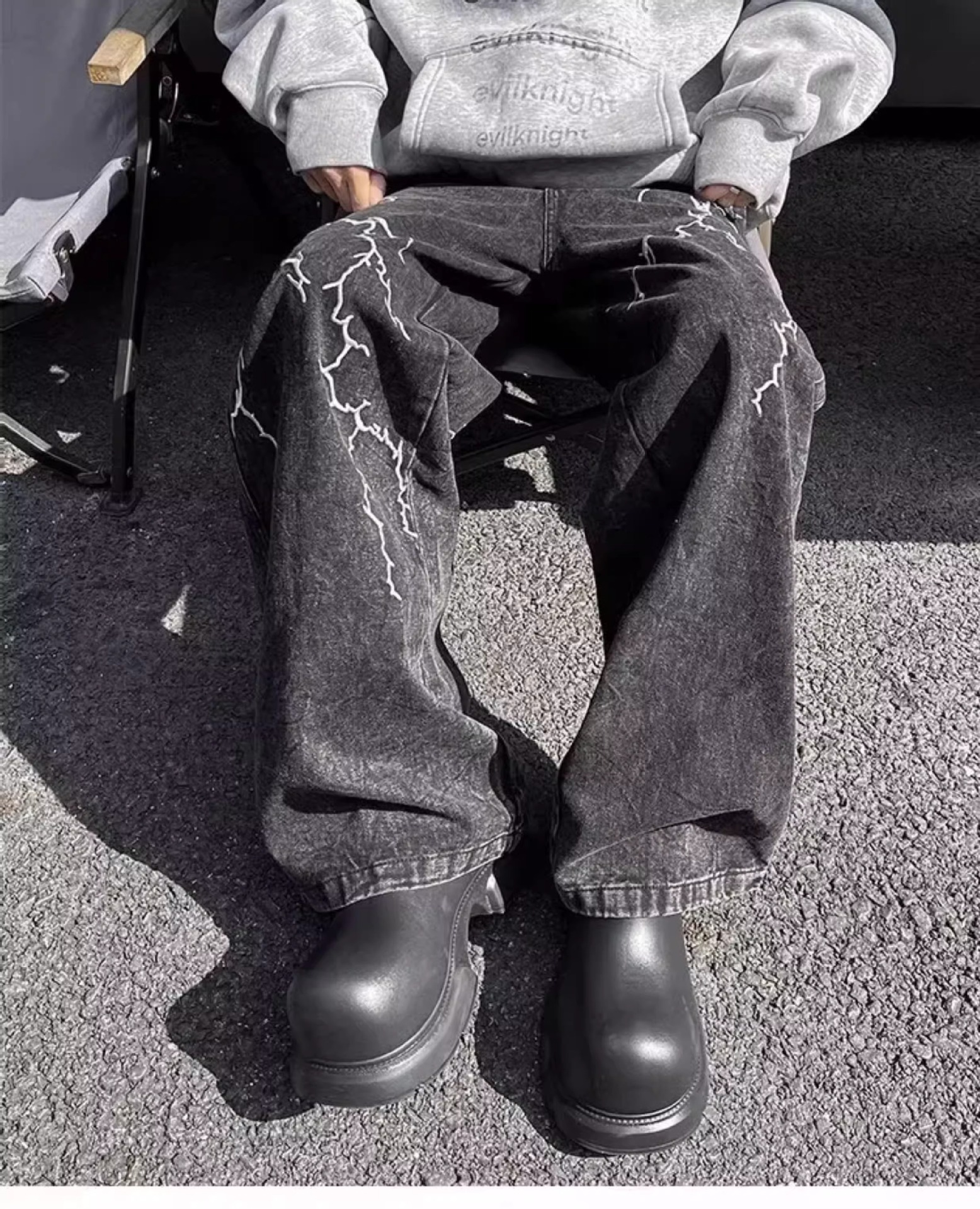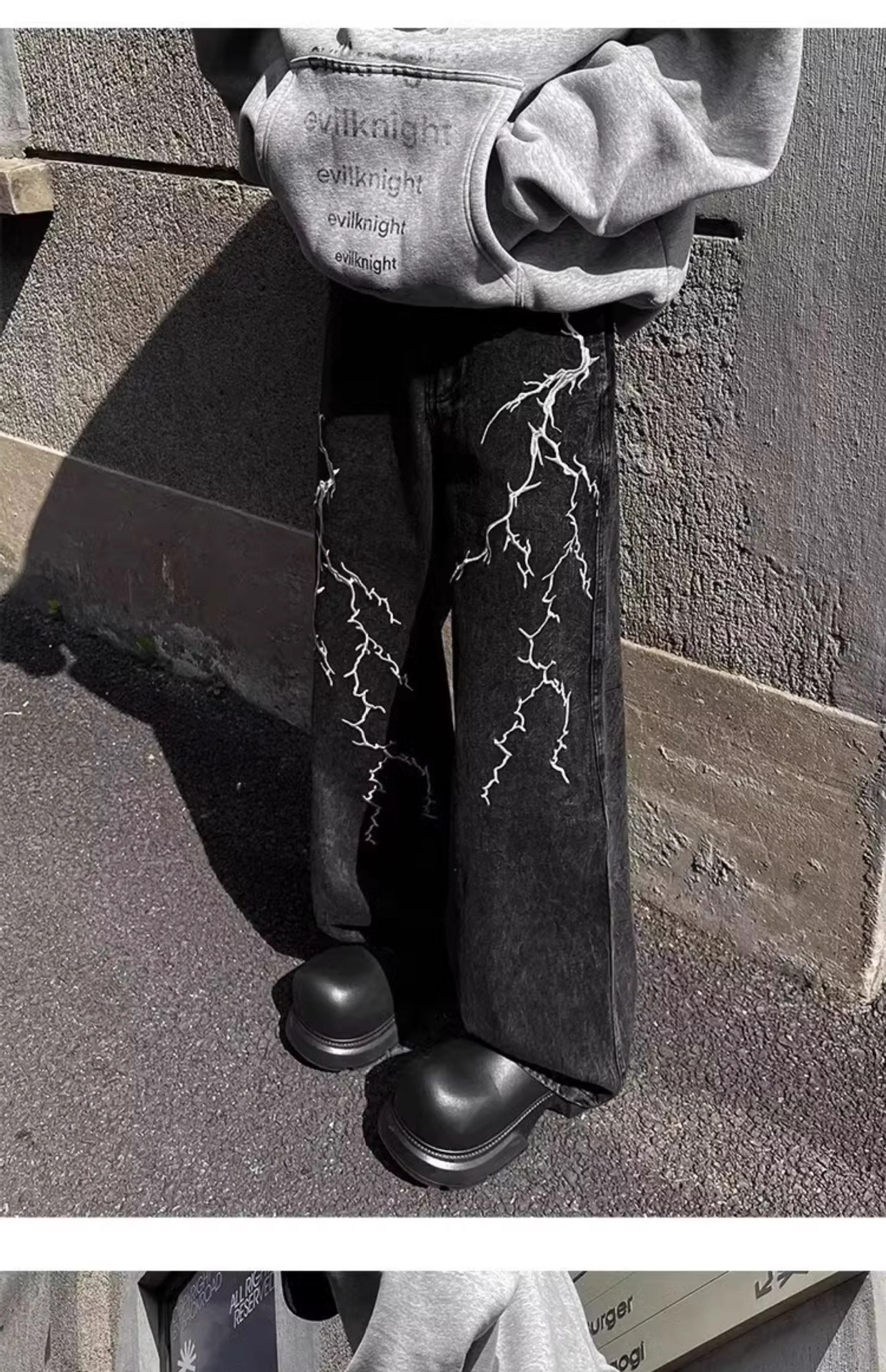 아메리칸 스타일 레트로 틈새 디자인 센스 번개 느슨한 청바지 남녀 캐주얼 스트리트 스트레이트 바지