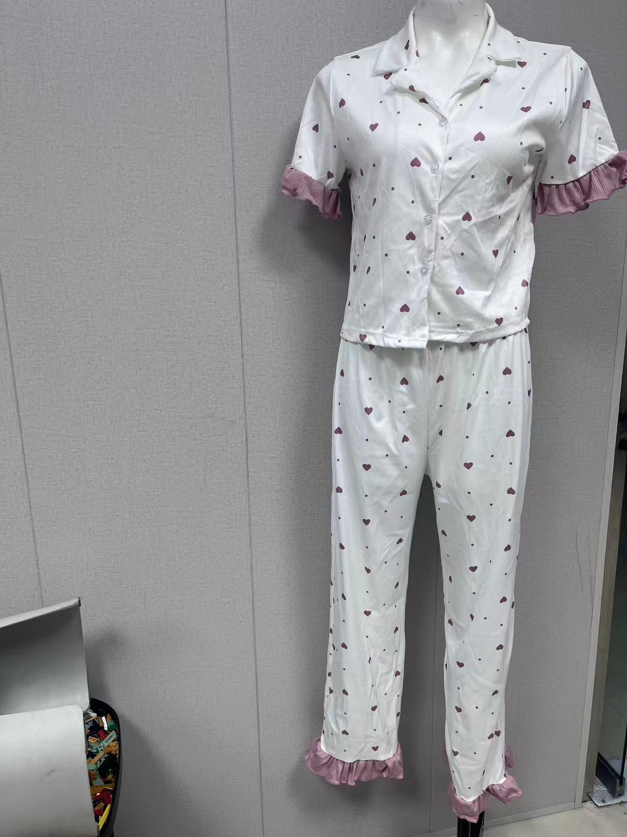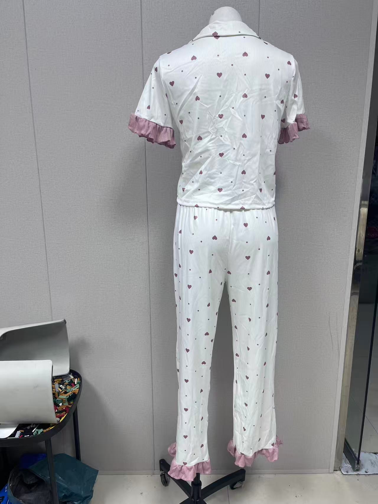 2025 새로운 사랑 인쇄 파자마 여성 세트 새로운 달콤한 레이스 옷깃 바지 홈 옷 투피스 세트