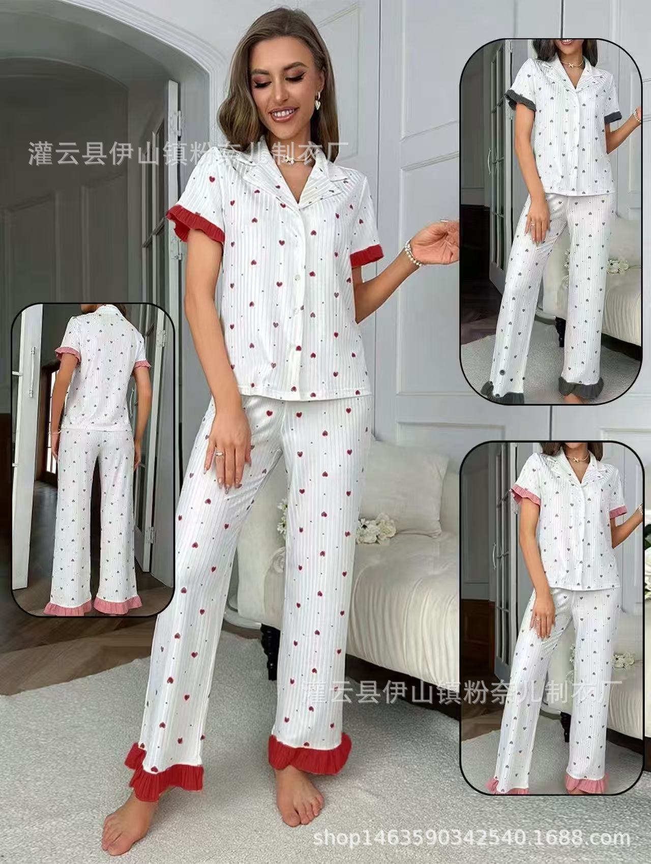 2025 새로운 사랑 인쇄 파자마 여성 세트 새로운 달콤한 레이스 옷깃 바지 홈 옷 투피스 세트스토어 가기