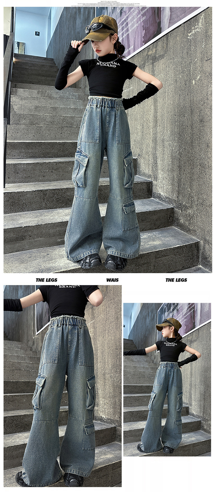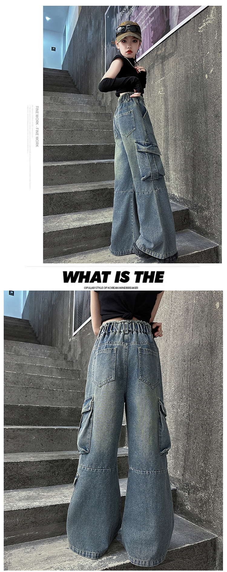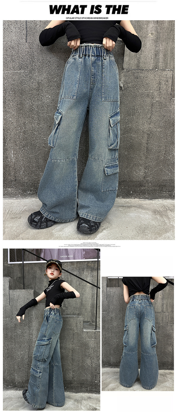 소녀 넓은 다리 도구 청바지 봄과 가을 새로운 어린이 유행 봄 큰 포켓 느슨한 복고풍 바지