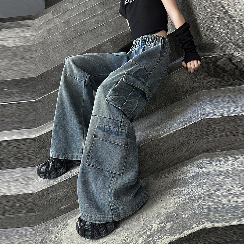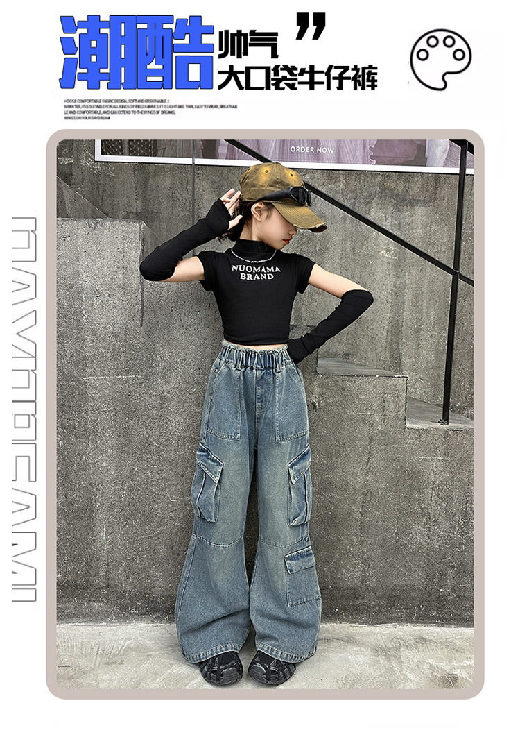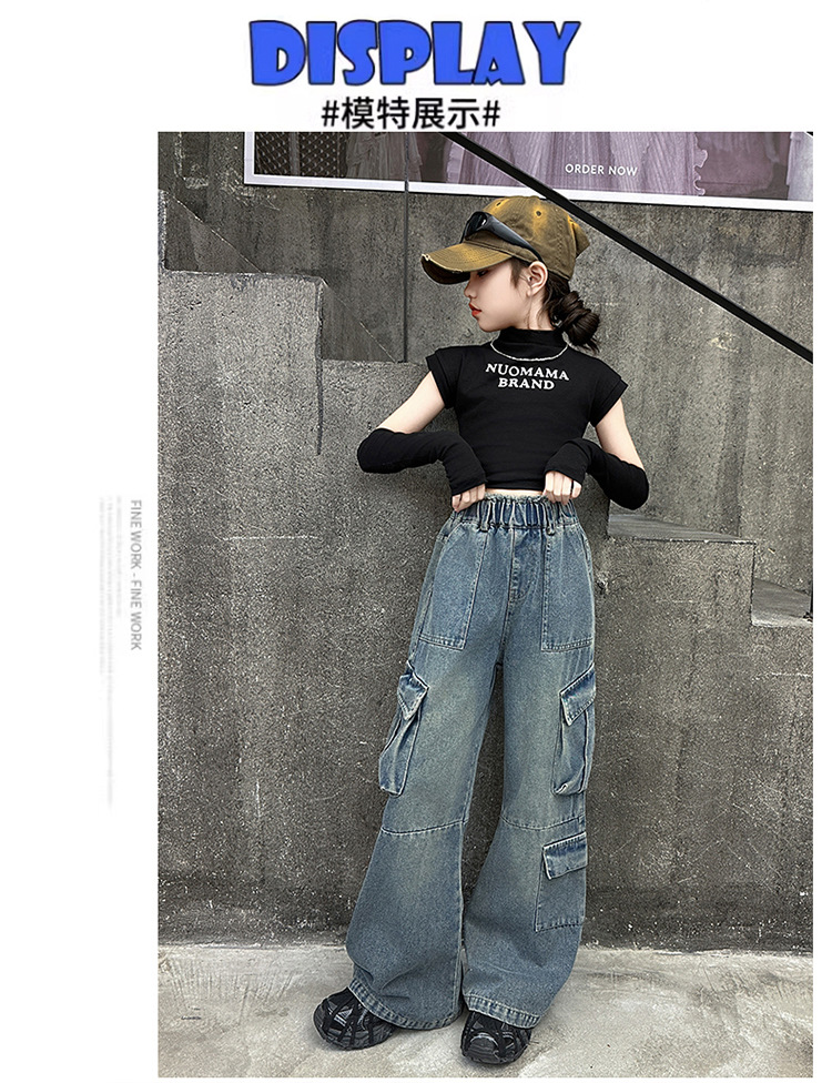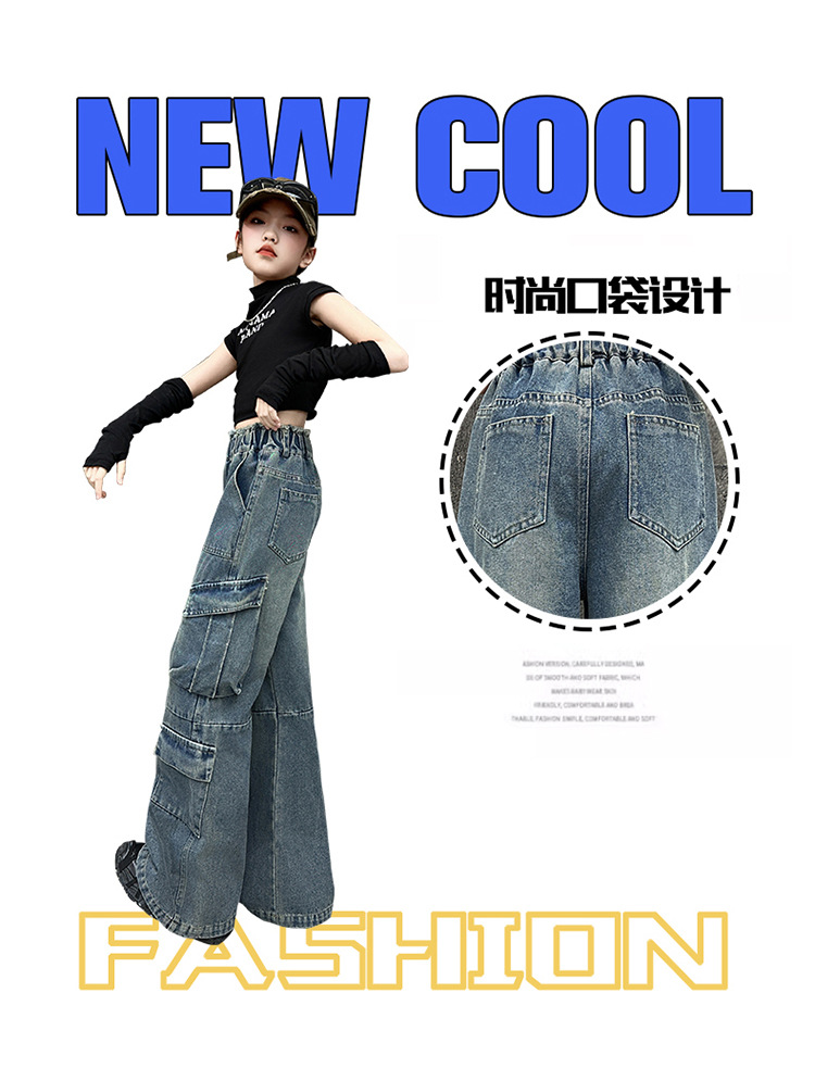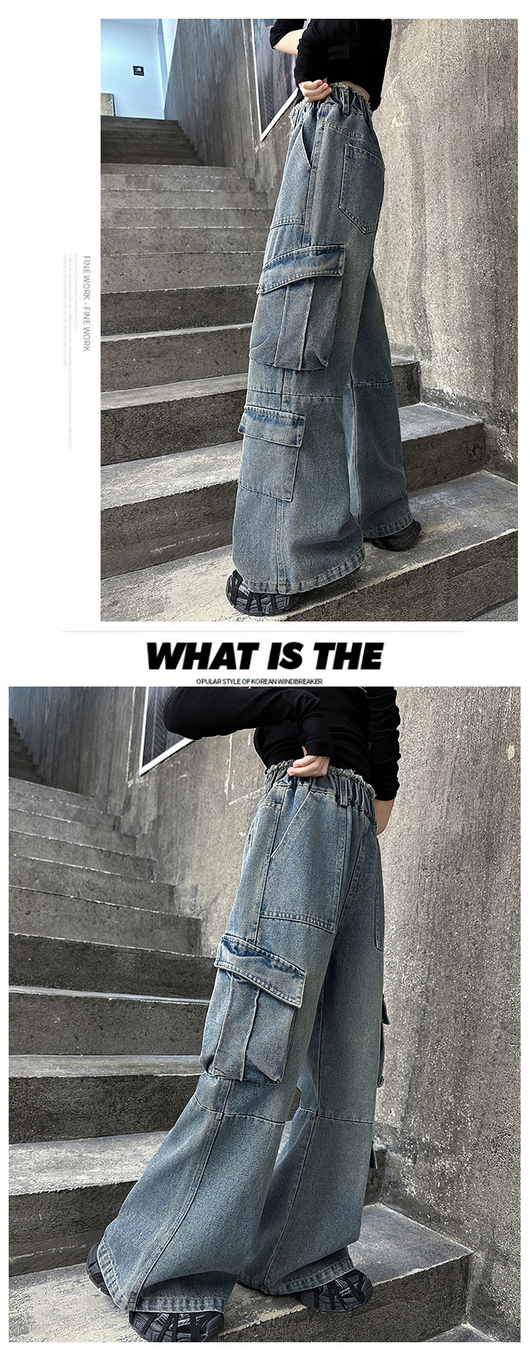 소녀 넓은 다리 도구 청바지 봄과 가을 새로운 어린이 유행 봄 큰 포켓 느슨한 복고풍 바지