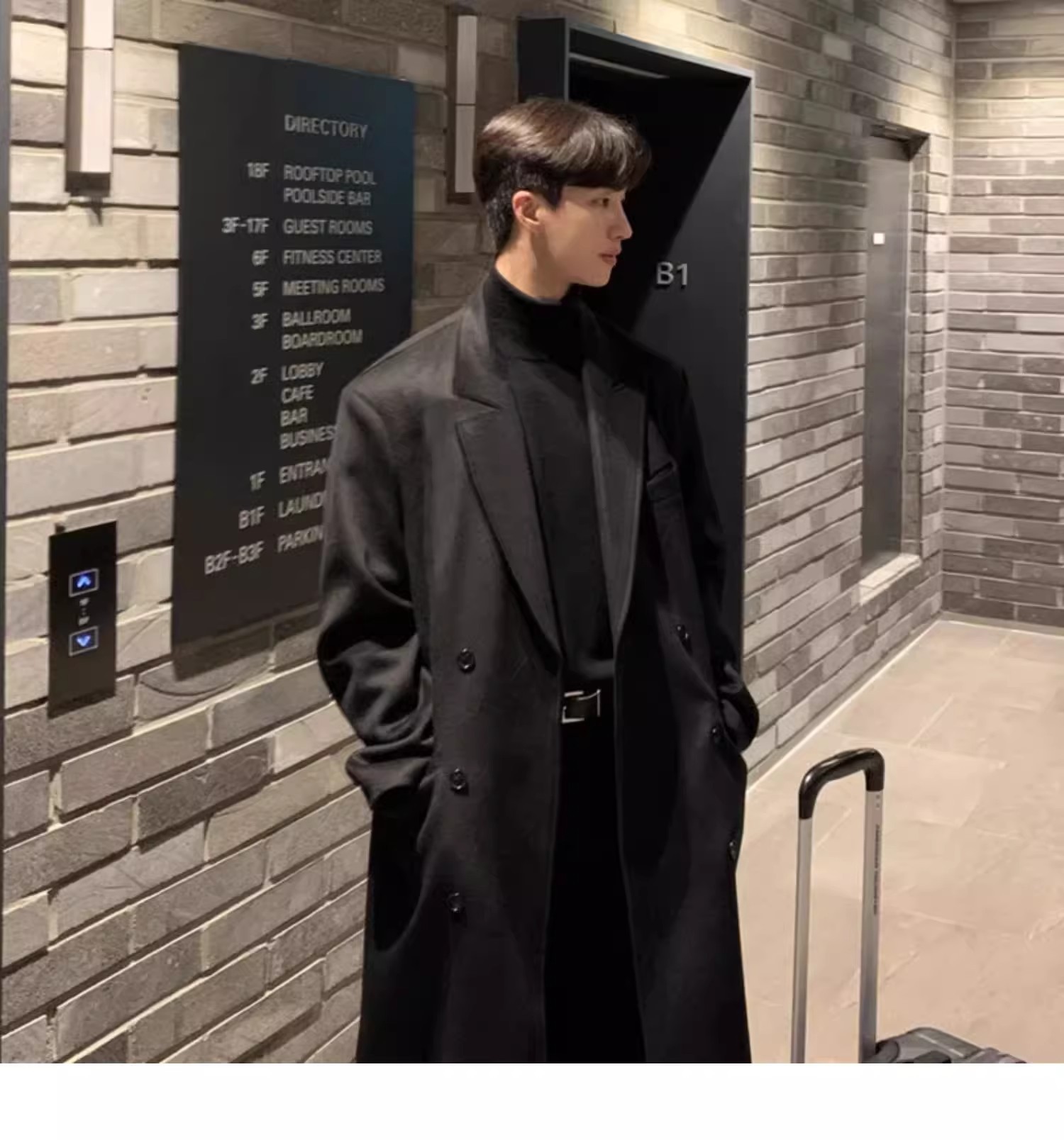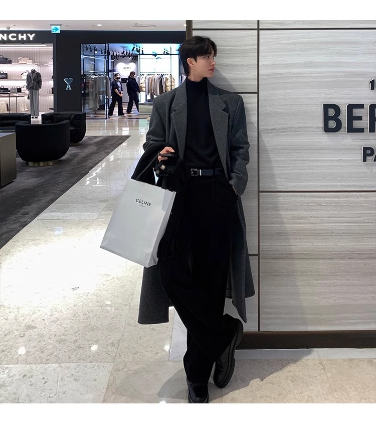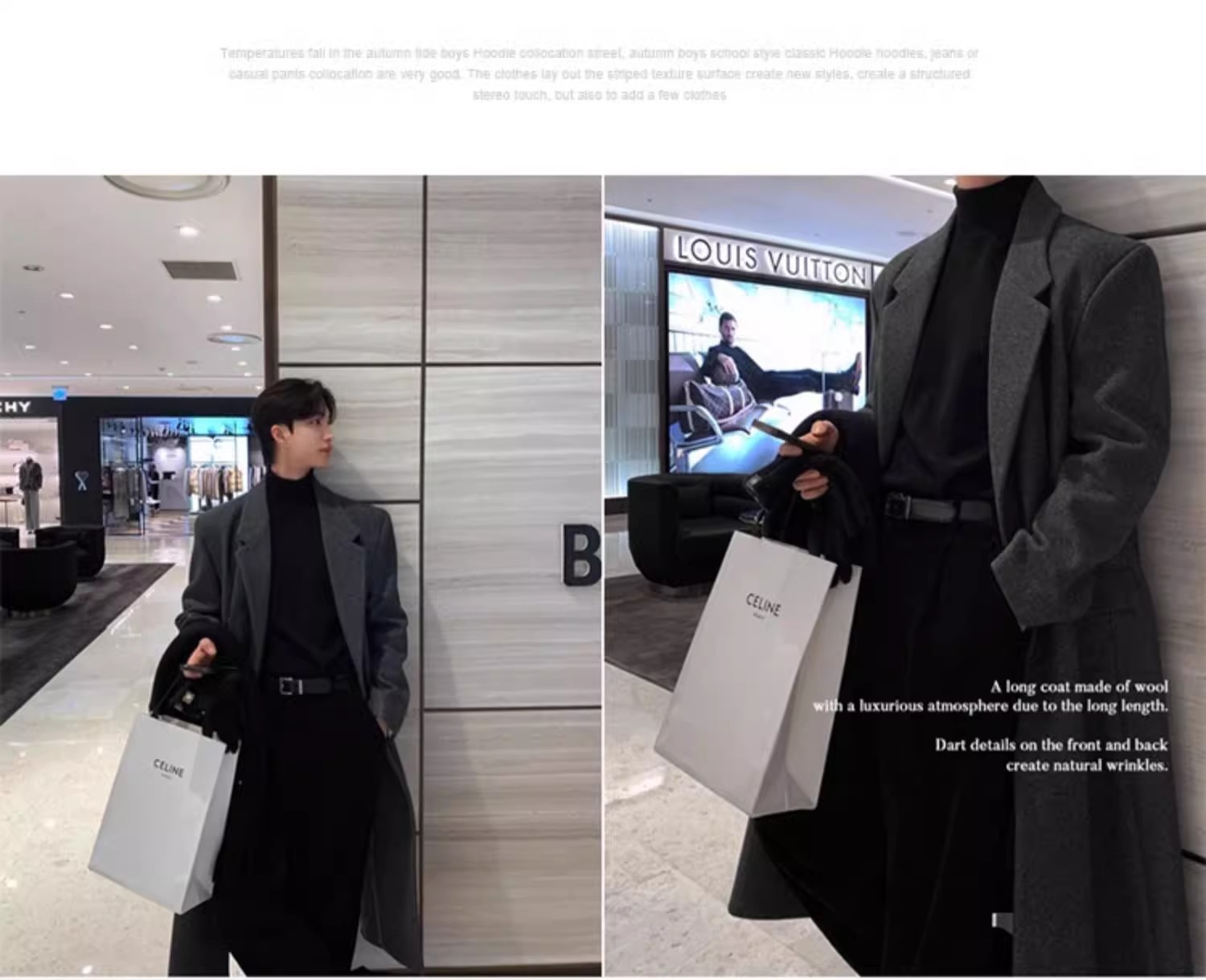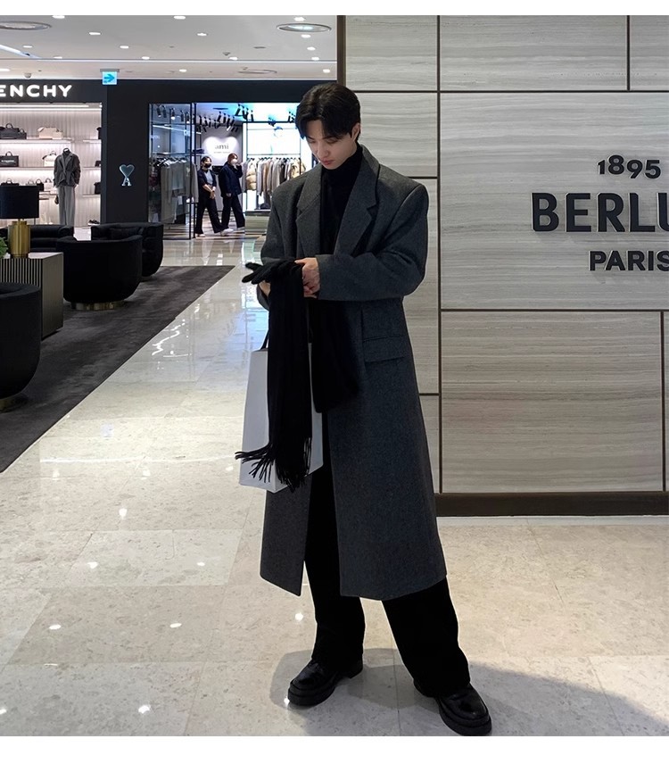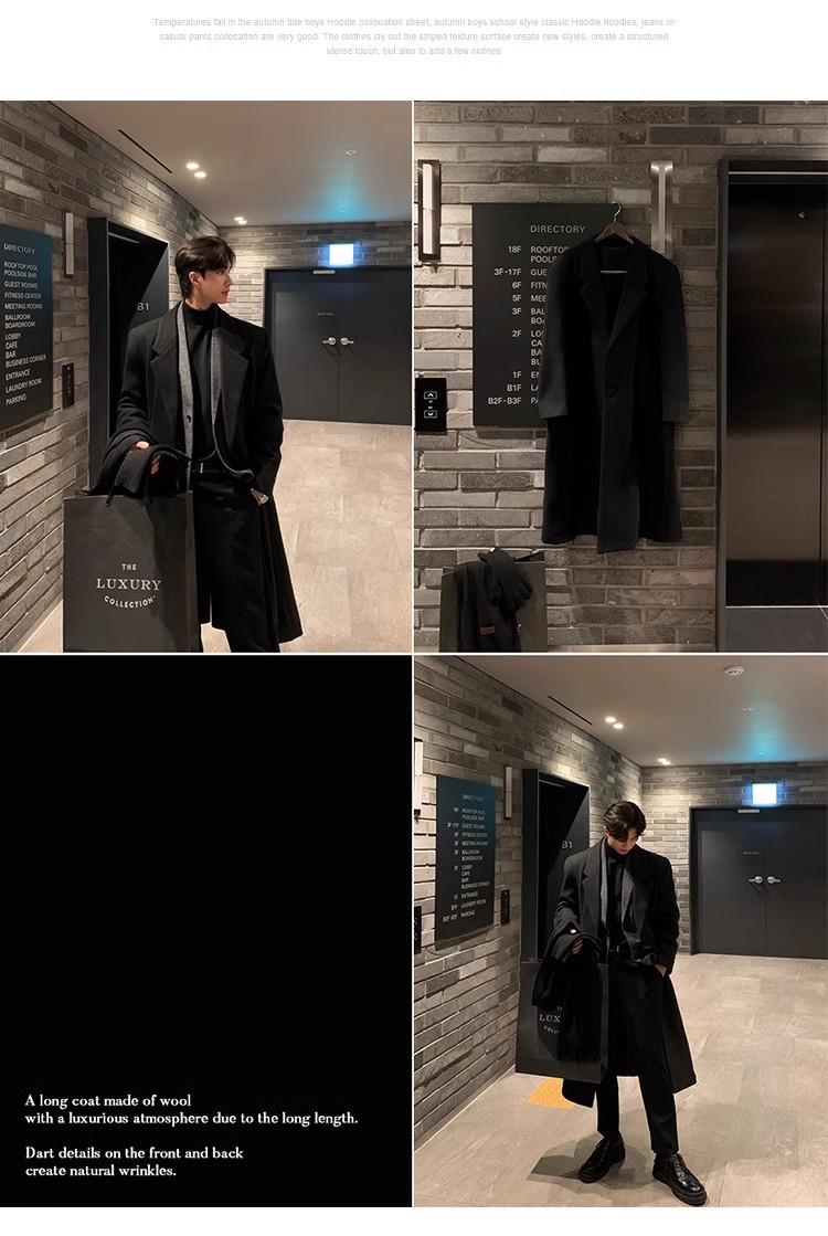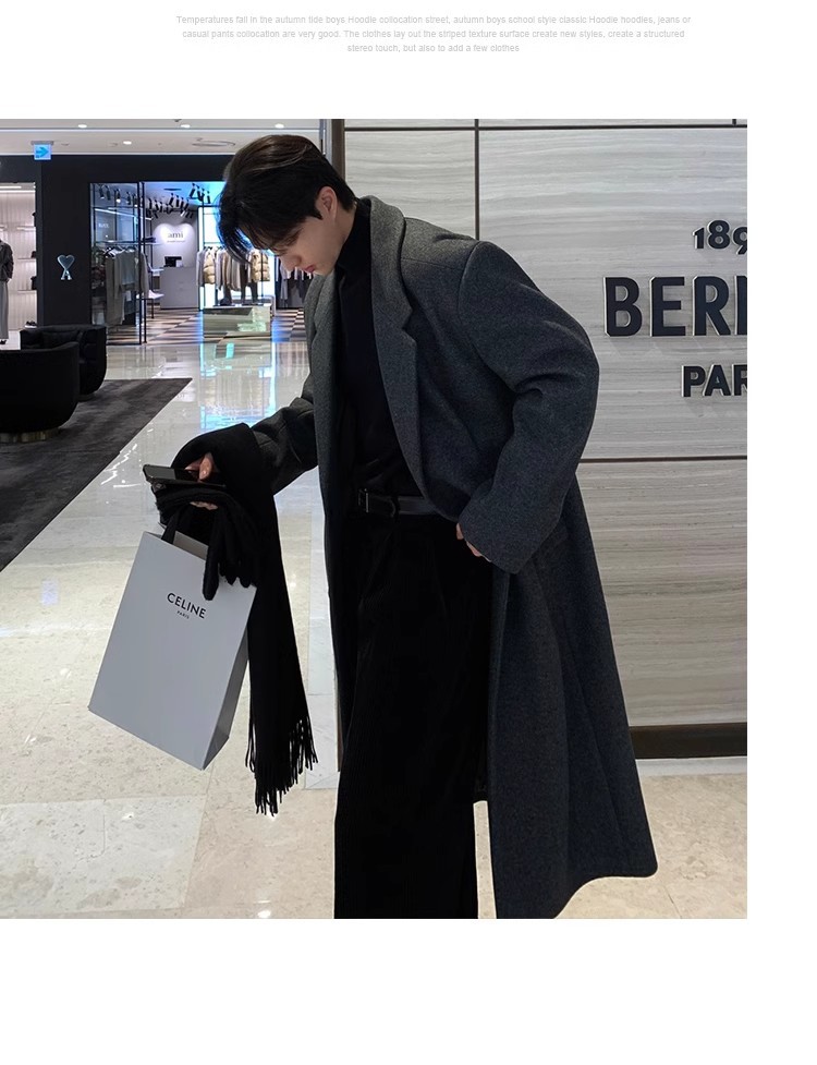 새로운 중간 길이의 모직 코트 남자의 가을과 겨울 두꺼운 한국 세트 모직 코트 느낌 Duffian 잘 생긴 무릎 위 트렌치 코트스토어 가기
