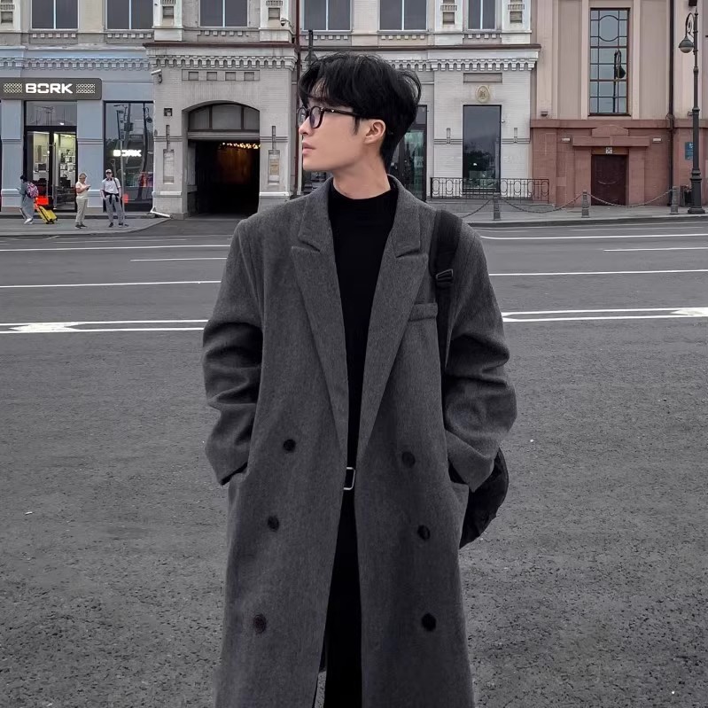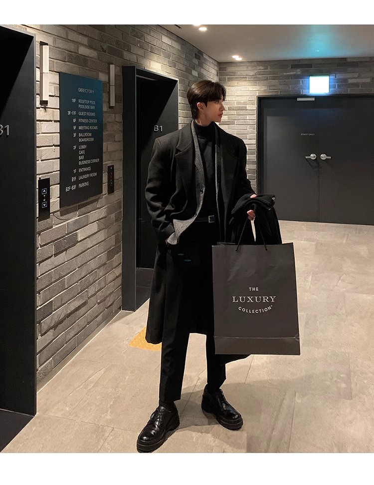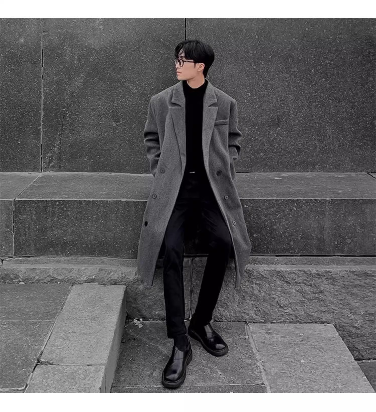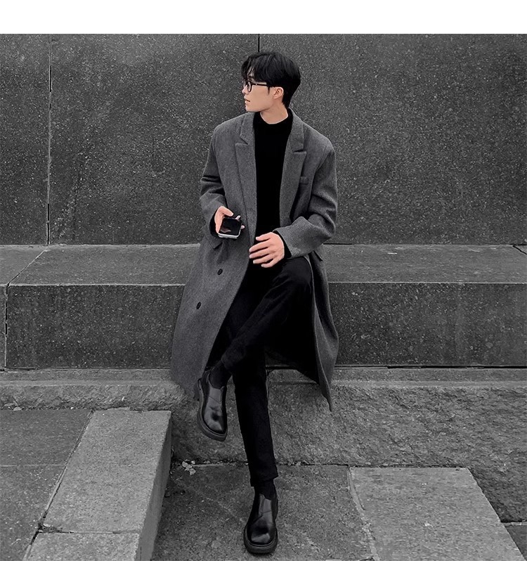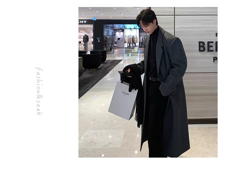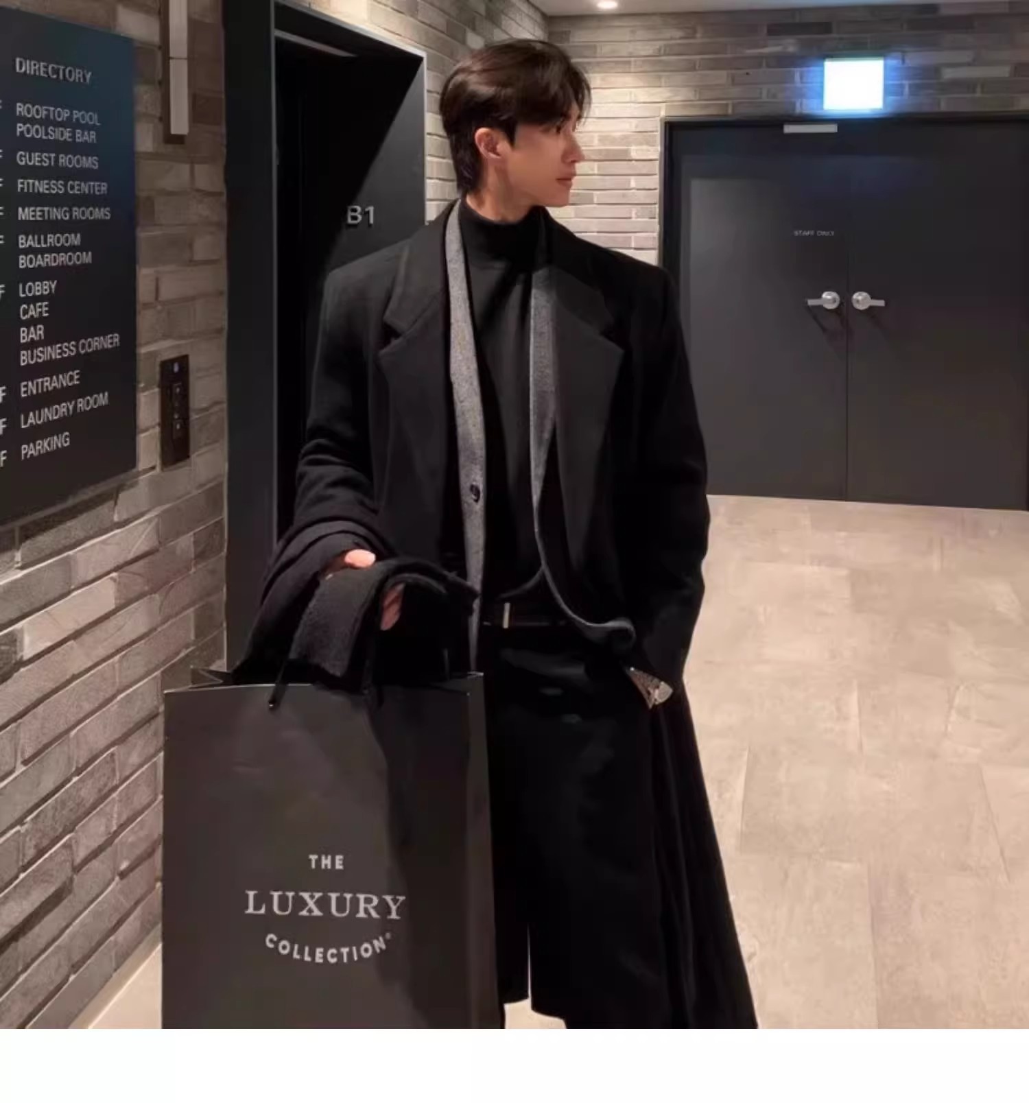 새로운 중간 길이의 모직 코트 남자의 가을과 겨울 두꺼운 한국 세트 모직 코트 느낌 Duffian 잘 생긴 무릎 위 트렌치 코트스토어 가기