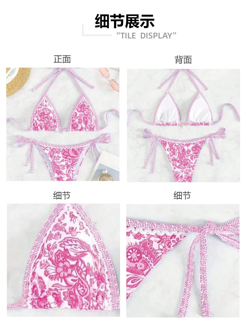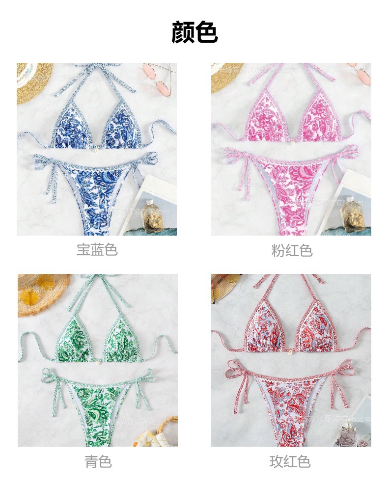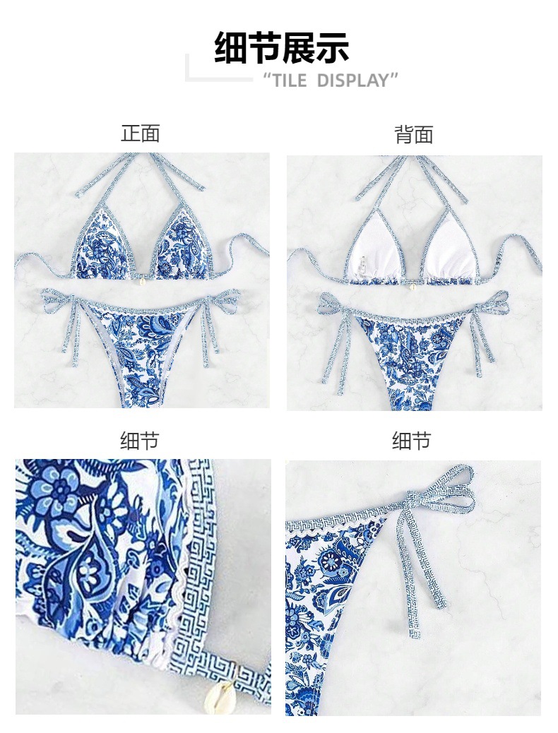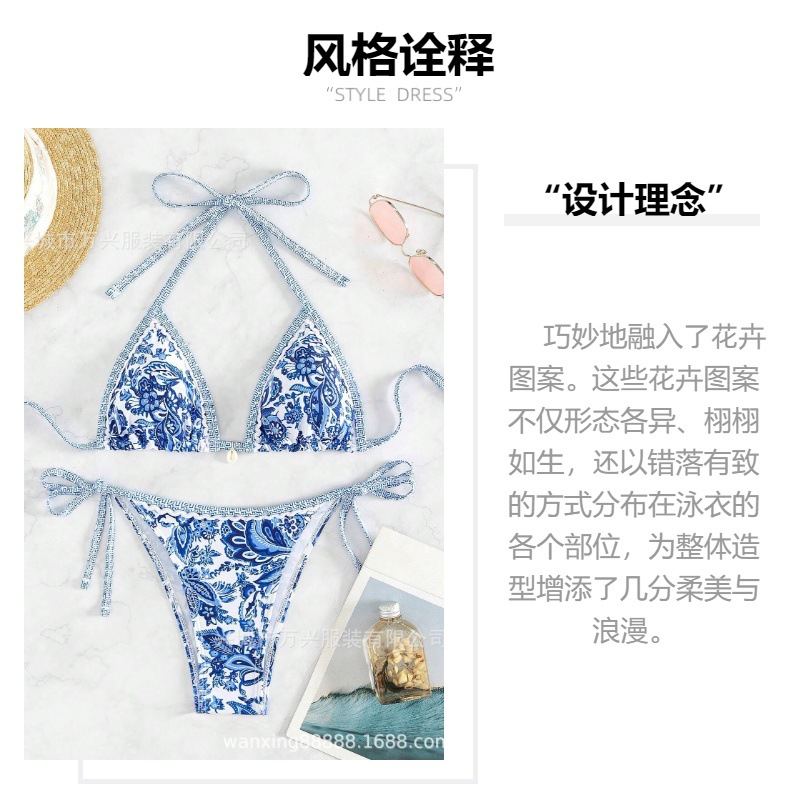 여성 수영복 2025 신상품 유럽 및 미국 인기 청화백자 프린트 끈 묶는 섹시 비키니 분리형 해외판스토어 가기