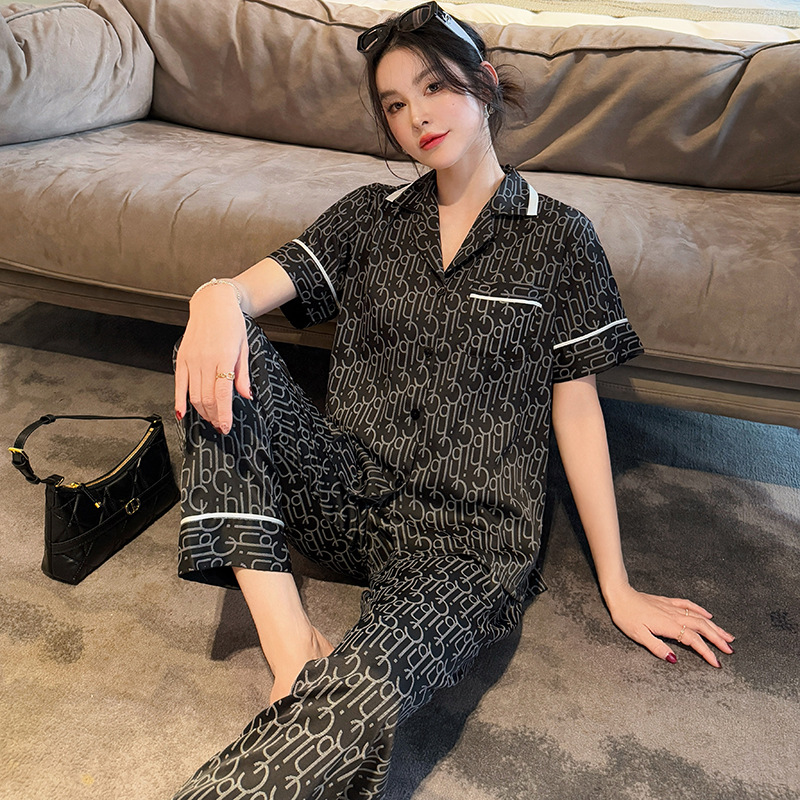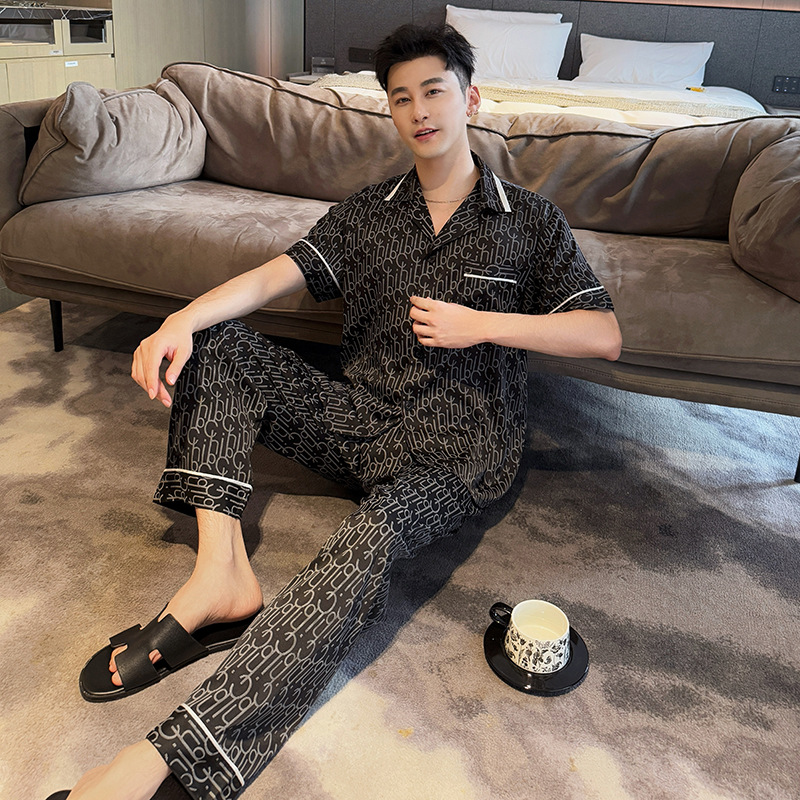 아이스 실크 커플 파자마 여성의 봄 새로운 카디건 반팔 바지 세트 사이버 축하 편지 인쇄 남성 홈 옷스토어 가기