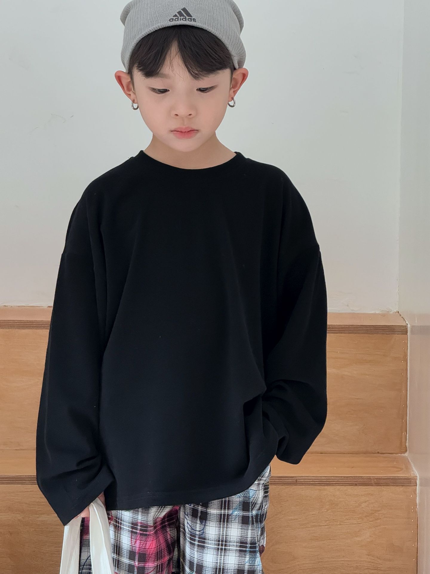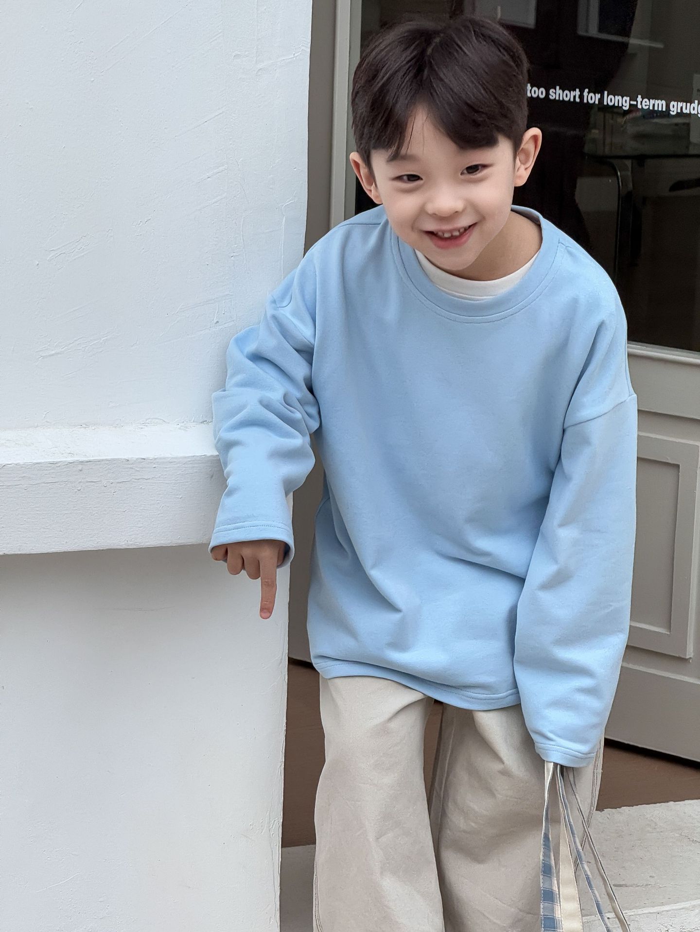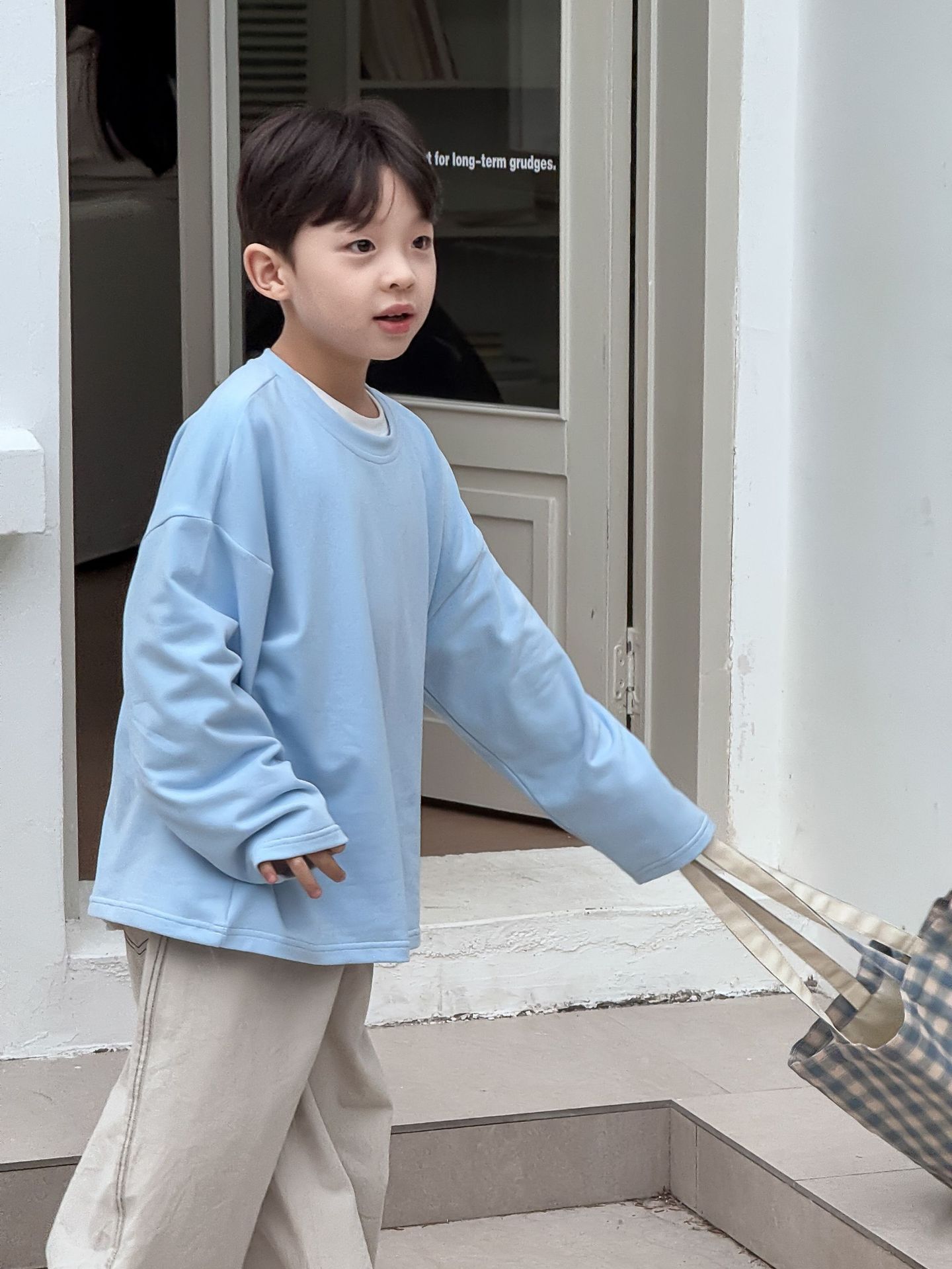 소년과 어린이를위한 25 봄 새로운 아동복 4 색 부드러운 피부 친화적 인 라벨 탄성 단색 느슨한 긴팔 티셔츠스토어 가기