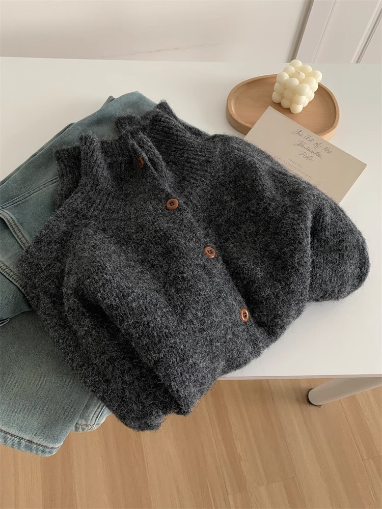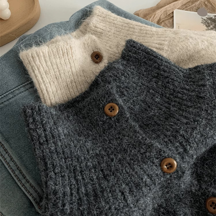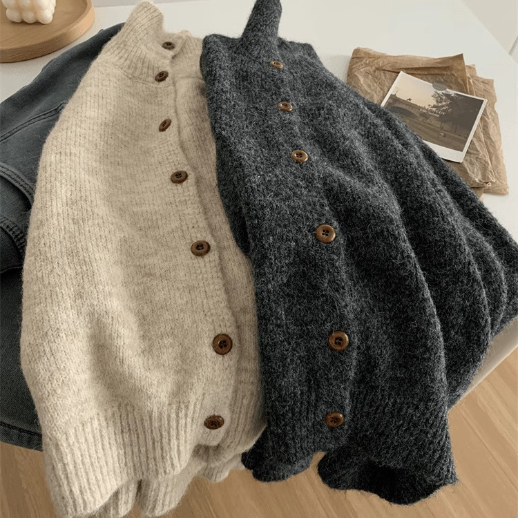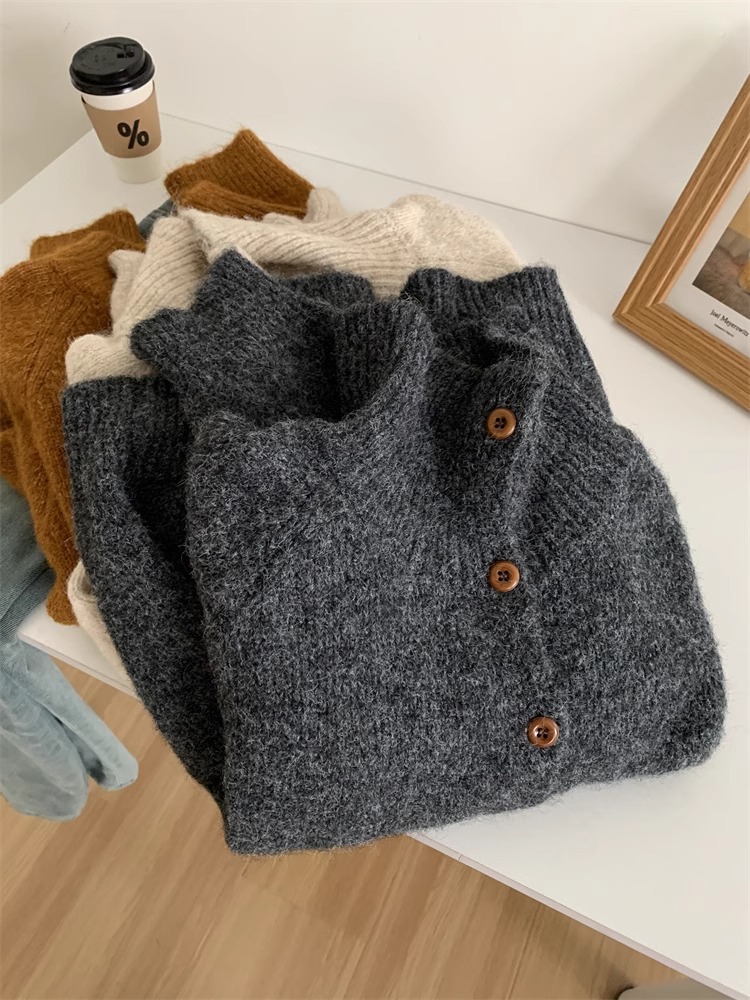 하이 엔드 칼라 니트 카디건 재킷 최고의 여성 가을 및 겨울 소프트 왁스 그레이 게으른 그레이 내부 높은 칼라 버튼 스웨터