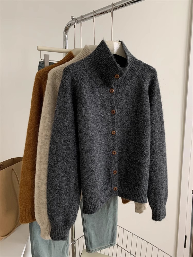 하이 엔드 칼라 니트 카디건 재킷 최고의 여성 가을 및 겨울 소프트 왁스 그레이 게으른 그레이 내부 높은 칼라 버튼 스웨터스토어 가기
