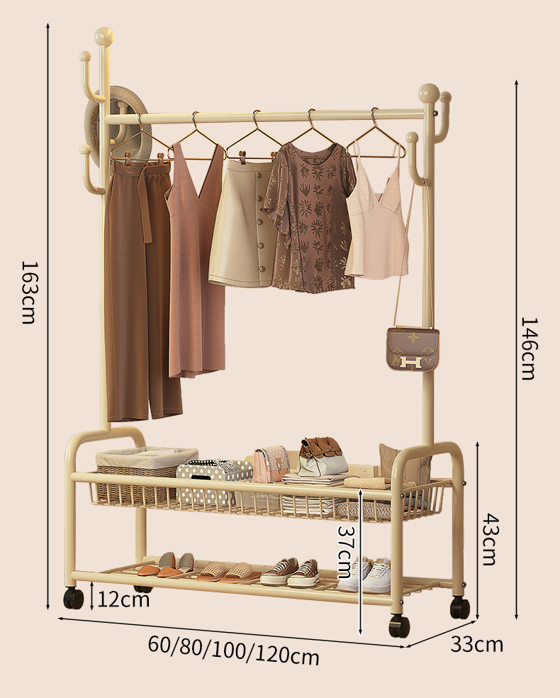 • 120cm 더블 레이어 메쉬 바스켓 - 크림 화이트 + 후크 6개 + 금속 범용 휠