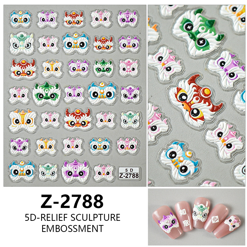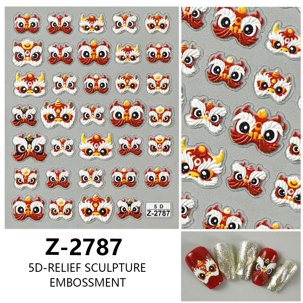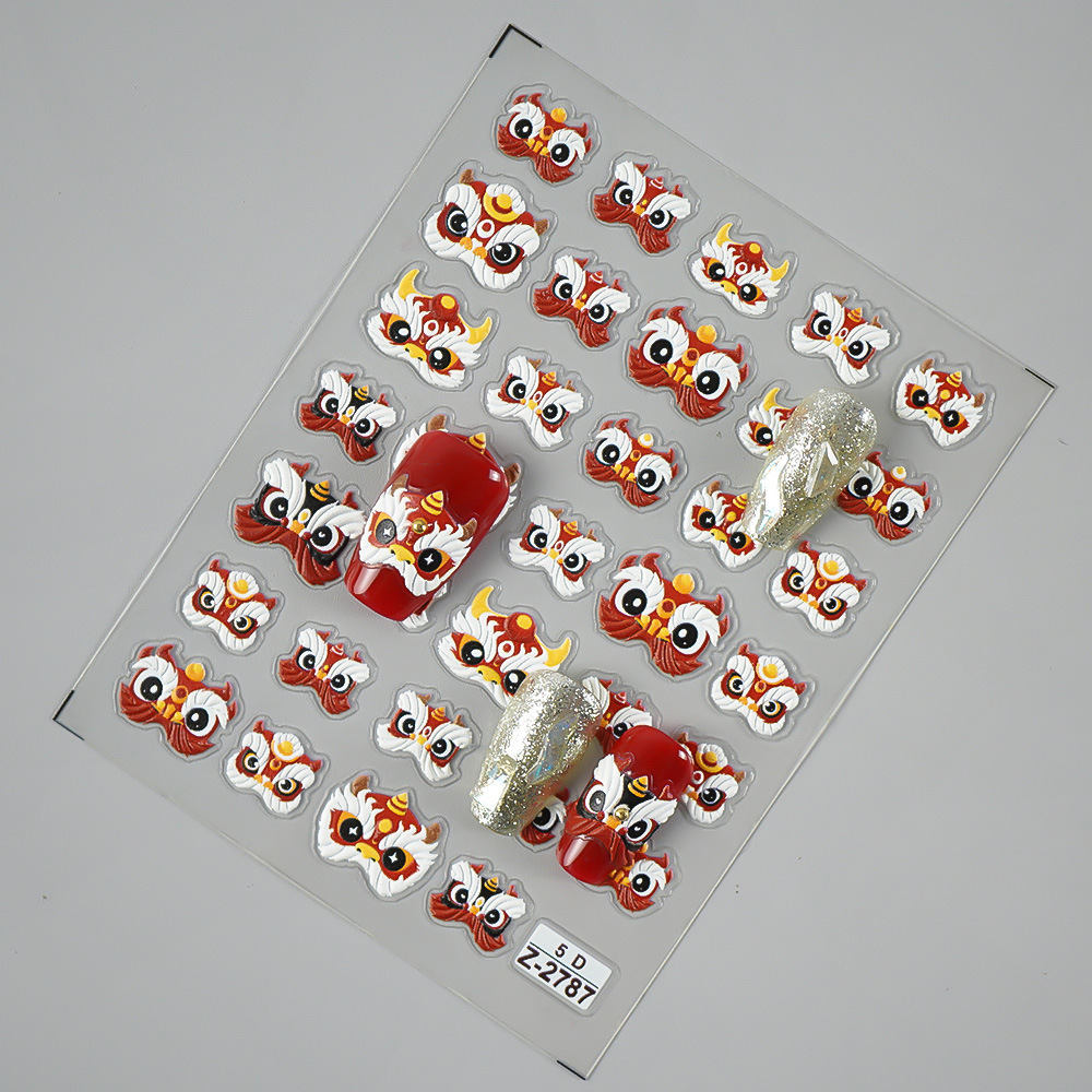 Redanco 새로운 5D 릴리프 그물 빨간 네일 스티커 새해 사자 춤 3 차원 접착 네일 스티커 Z-2787