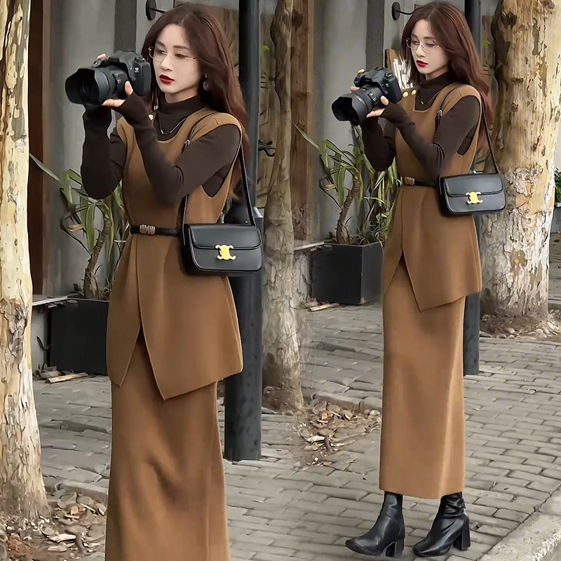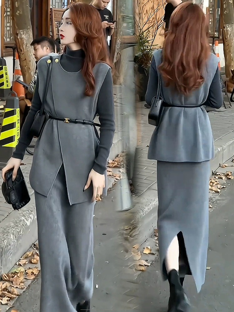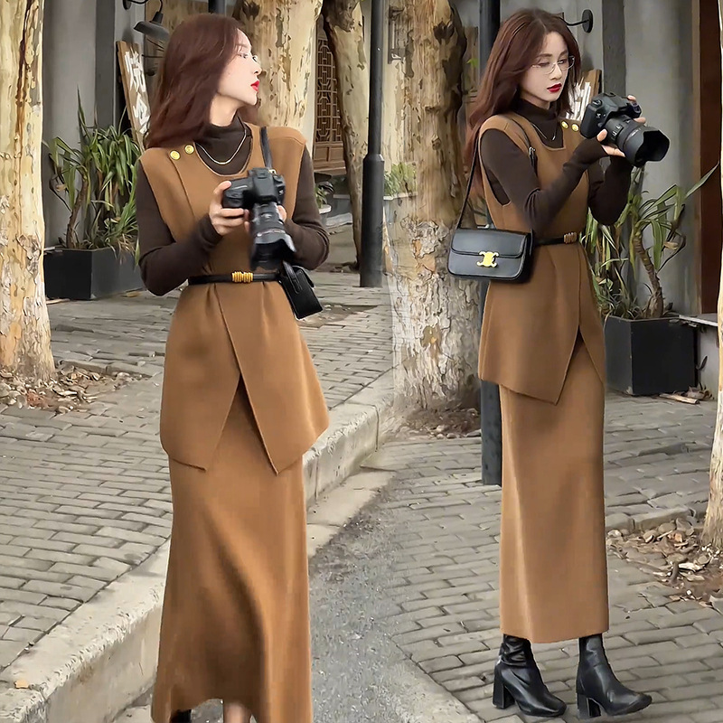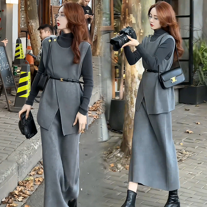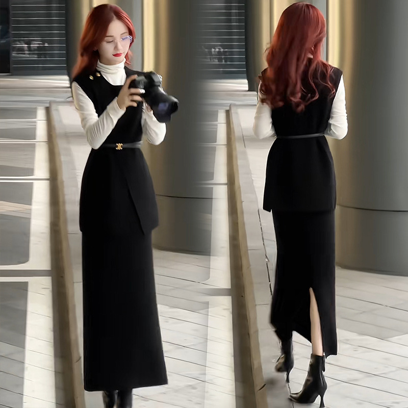 패션 원피스 세트 여성 2025 봄 새로운 세련된 슬림 조끼베이스 셔츠 3 조각 세트 치마스토어 가기