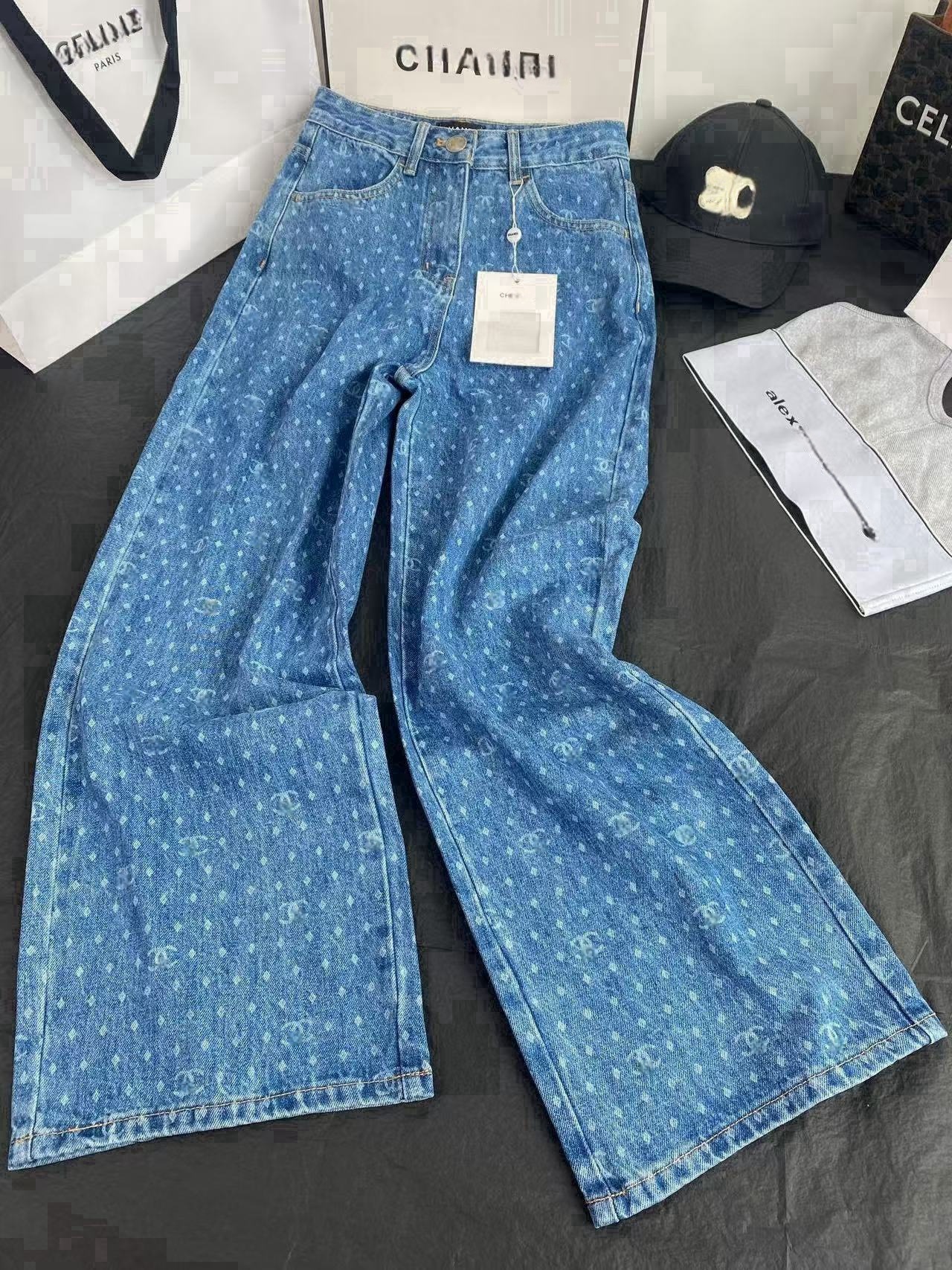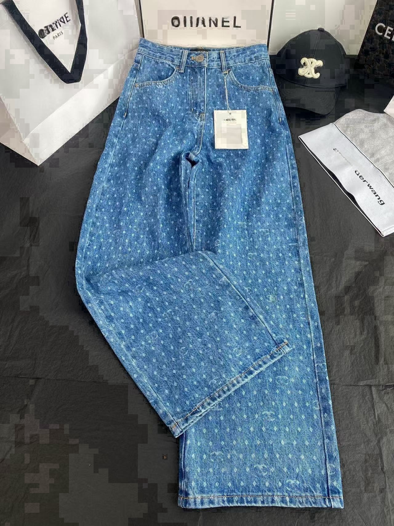 Nanyou 하이 엔드 여성 의류 수정 작은 향기로운 스타일 25 새로운 풀 라인 인쇄 로고 웨이브 포인트 넓은 다리 느슨한 스트레이트 청바지