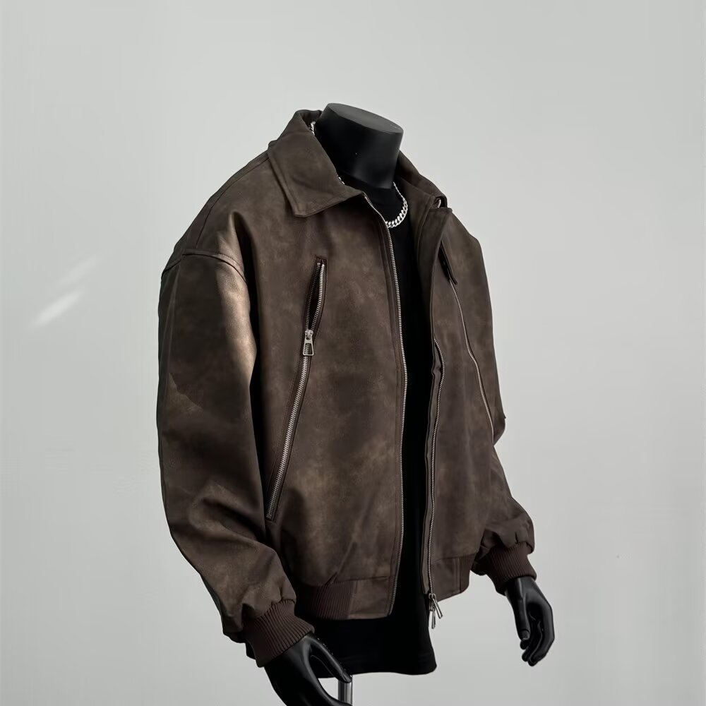 아메리칸 스타일 레트로 지퍼 트렌디 한 브랜드 가죽 자켓 바이커 세트 남성 가을 및 겨울 디자인 센스 플루타니아 잘 생긴 올매치 캐주얼 루즈 아우터
