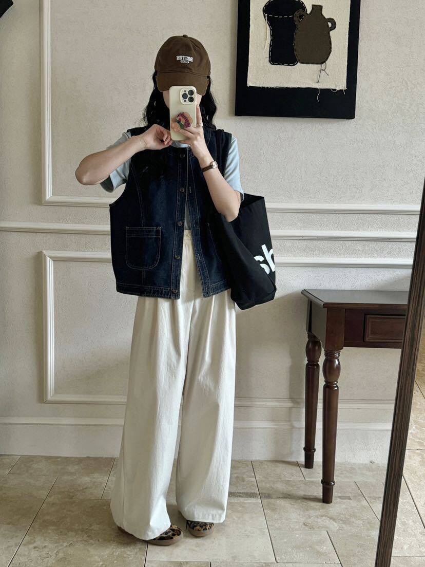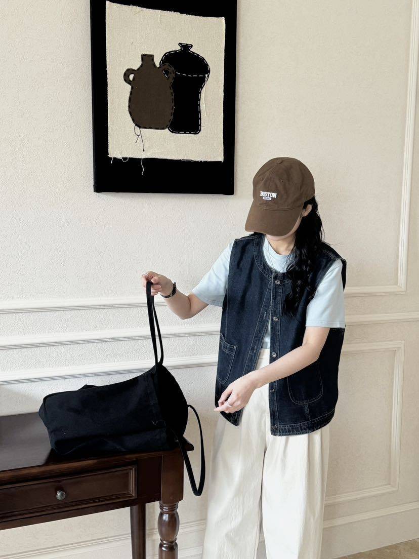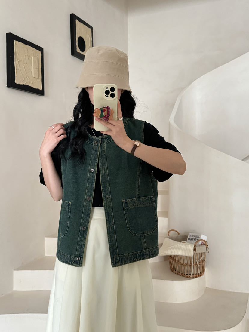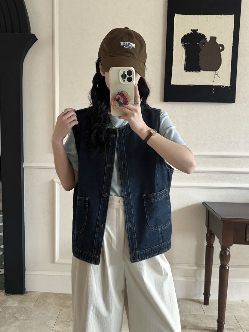 데님 조끼 2025 새로운 간단한 레트로 한국 스타일 라운드 넥 싱글 브레스트 솔리드 컬러 올 매치 느슨한 민소매 여성스토어 가기