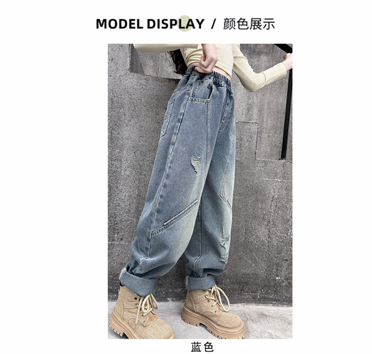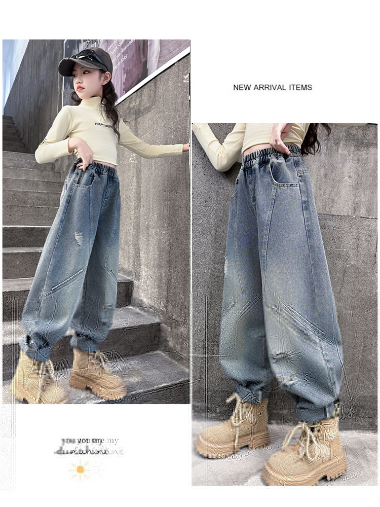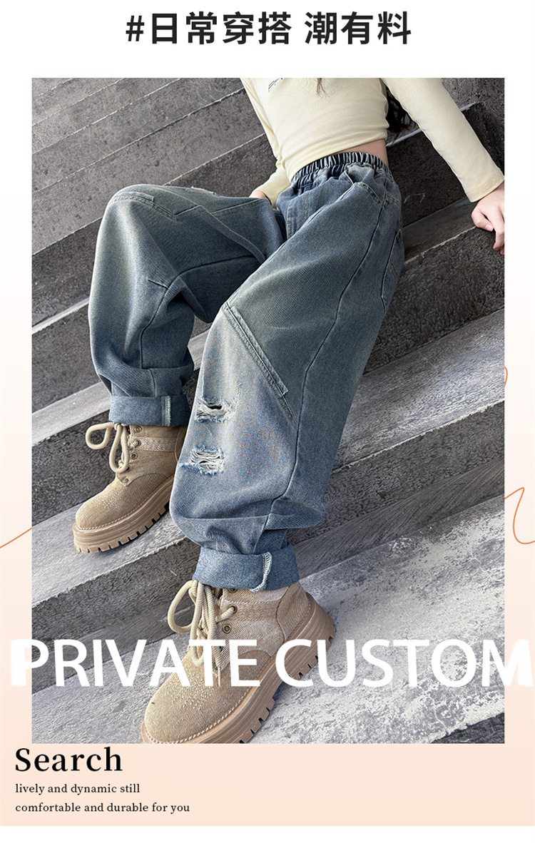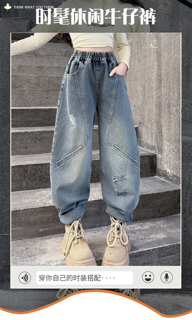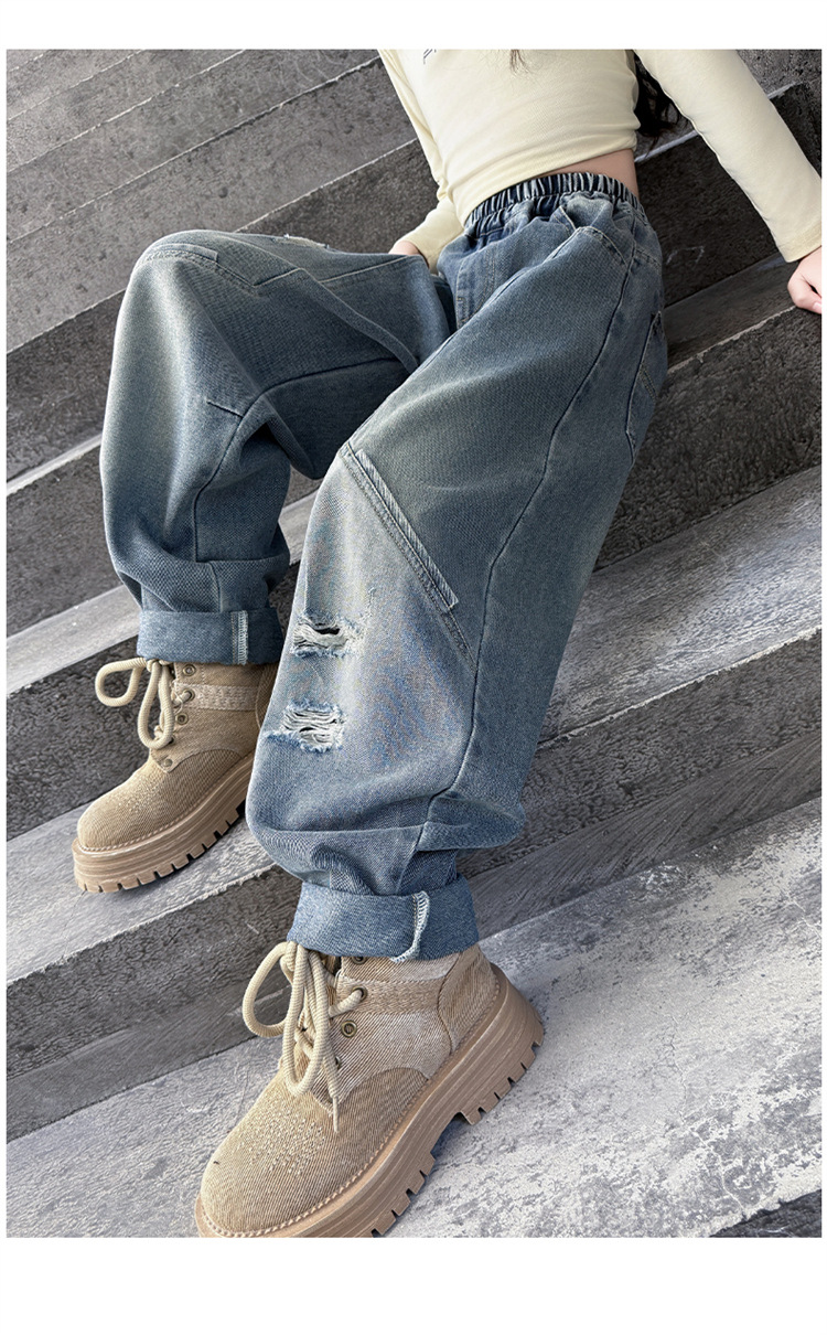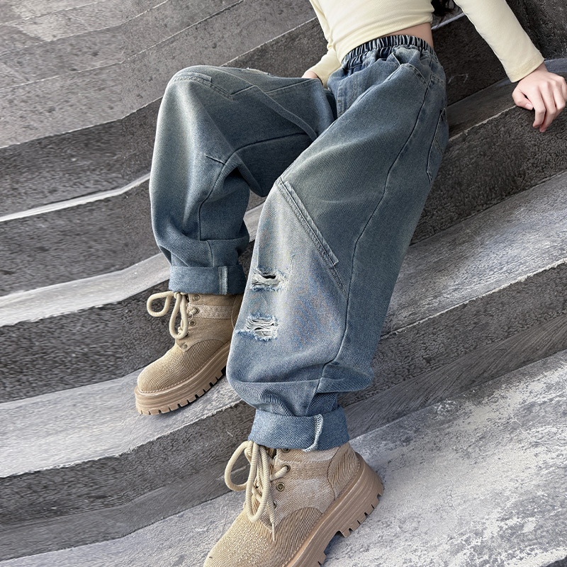 소녀 바지 2025 봄과 가을 새로운 청바지 유행 멋진 독특한 파쇄 마체 바지 소녀의 넓은 다리 바지스토어 가기
