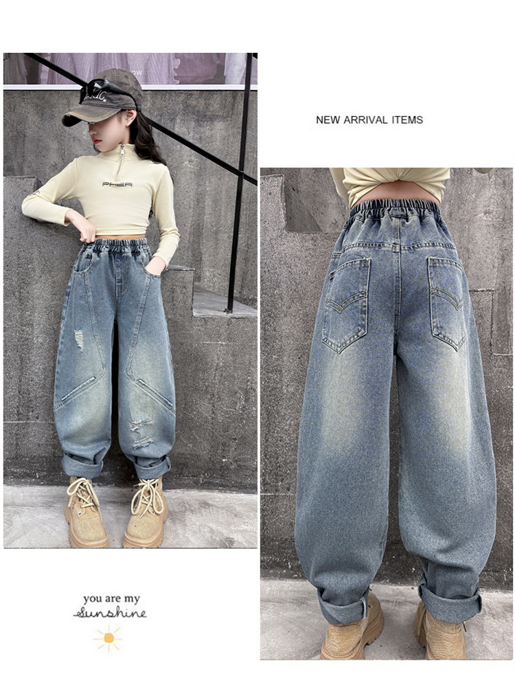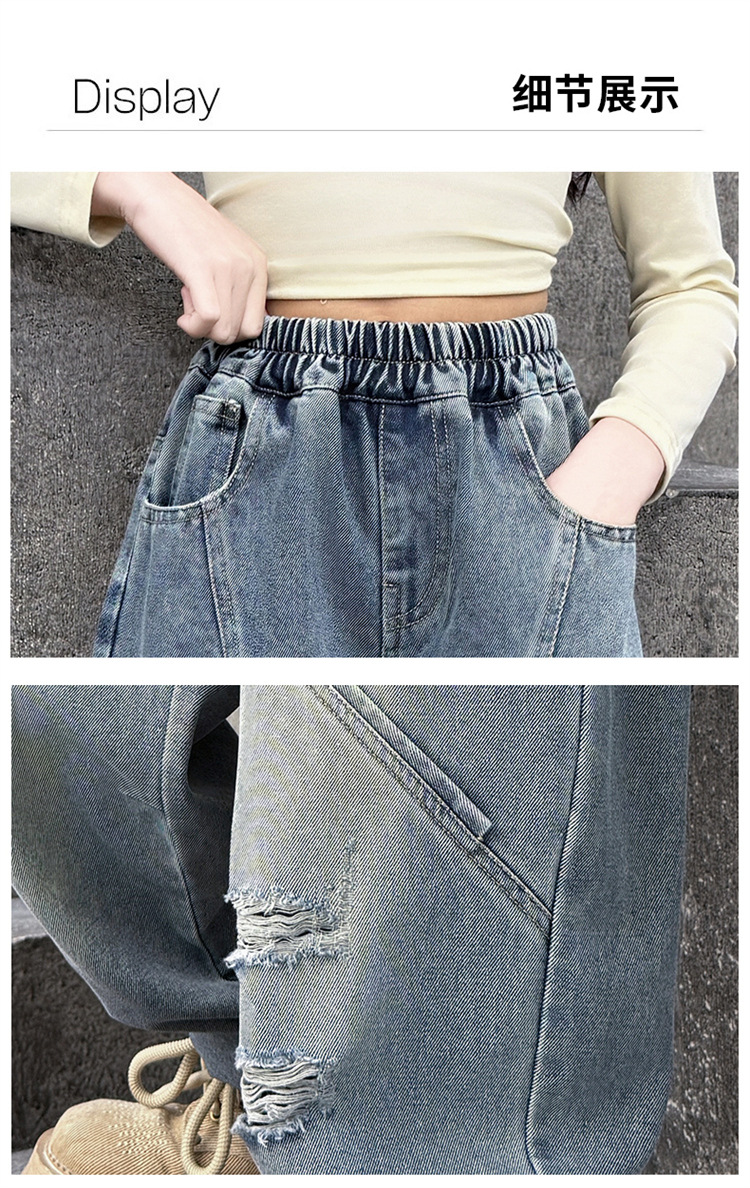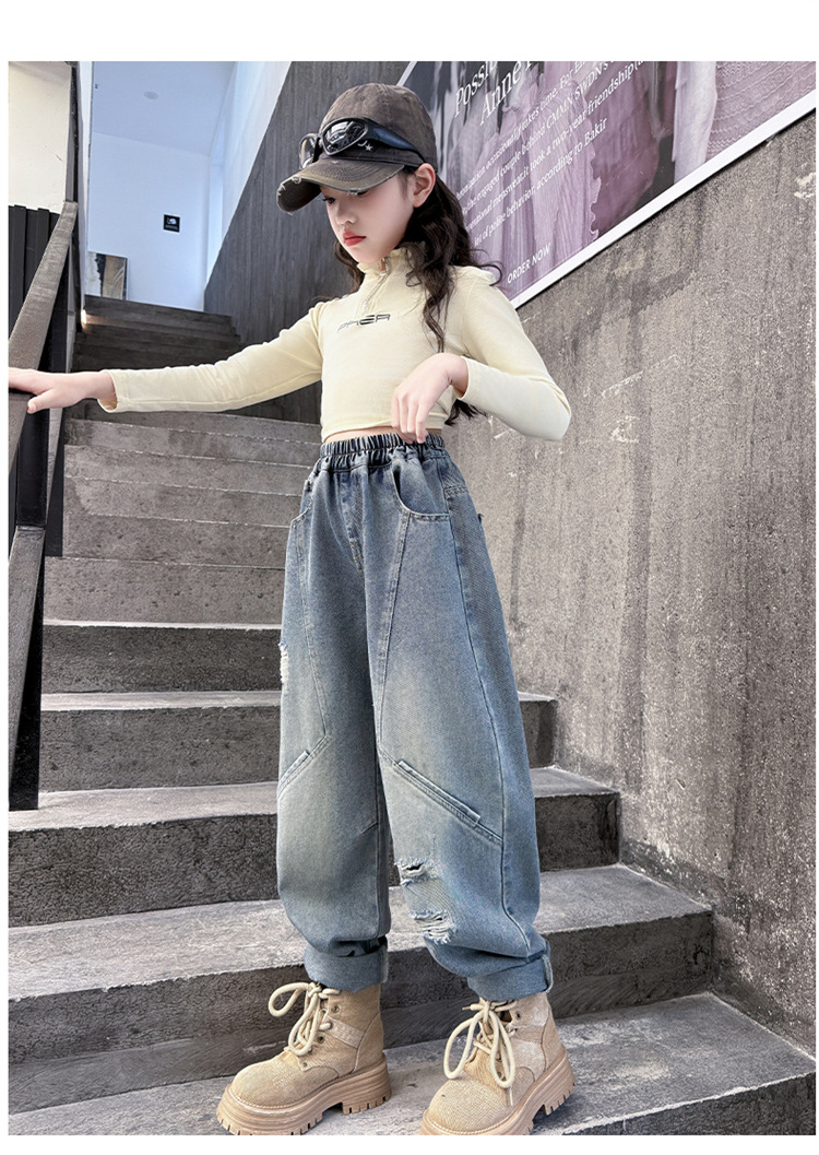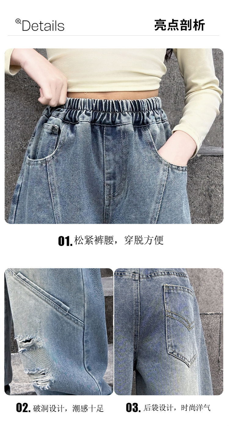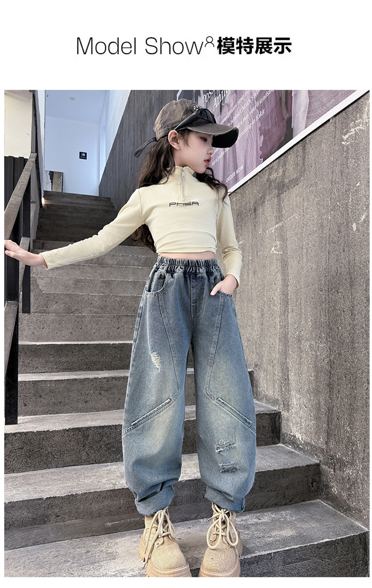 소녀 바지 2025 봄과 가을 새로운 청바지 유행 멋진 독특한 파쇄 마체 바지 소녀의 넓은 다리 바지스토어 가기