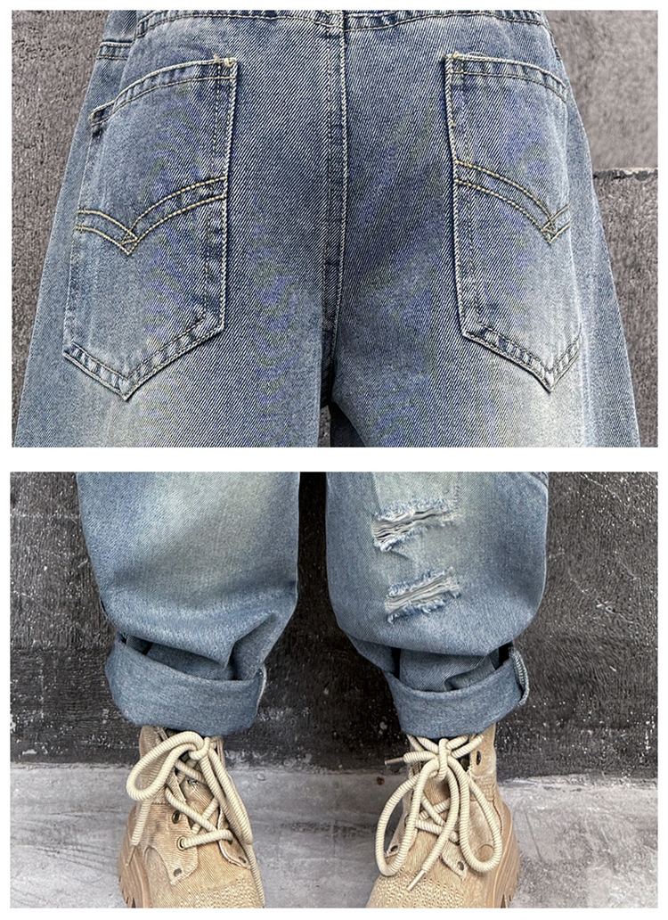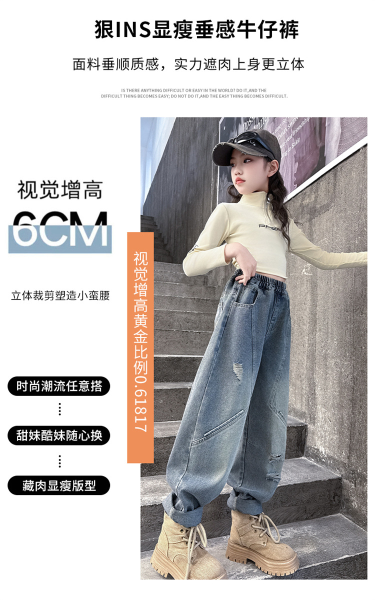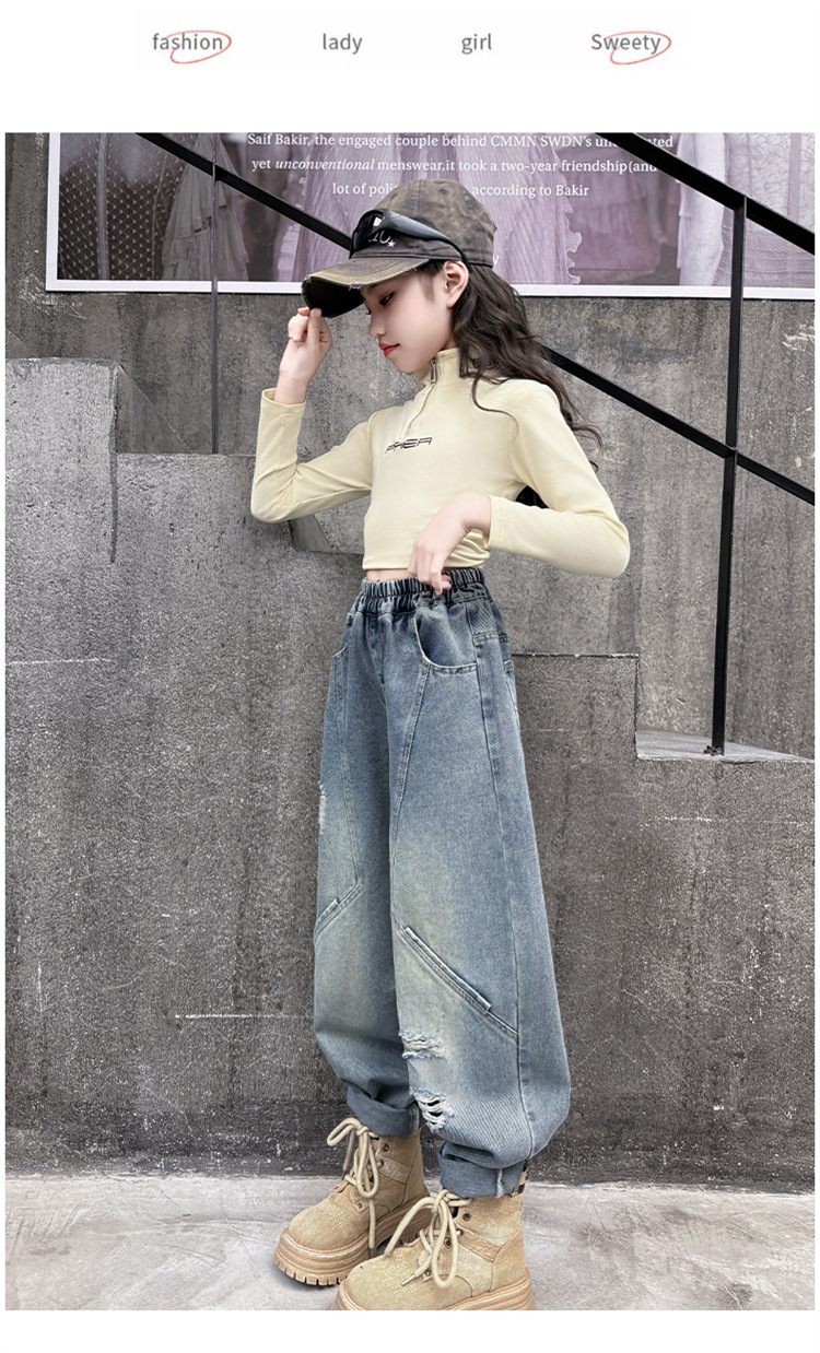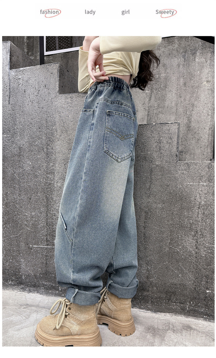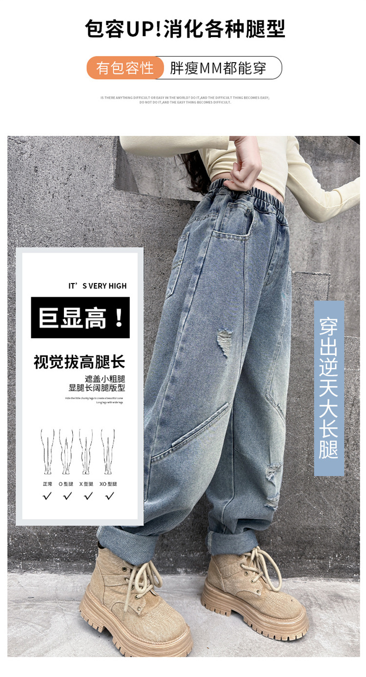 소녀 바지 2025 봄과 가을 새로운 청바지 유행 멋진 독특한 파쇄 마체 바지 소녀의 넓은 다리 바지스토어 가기