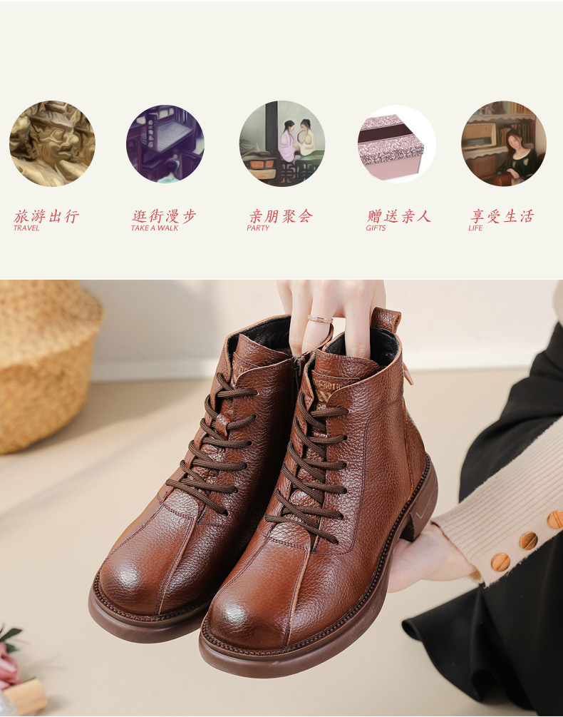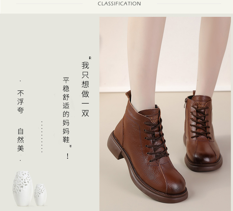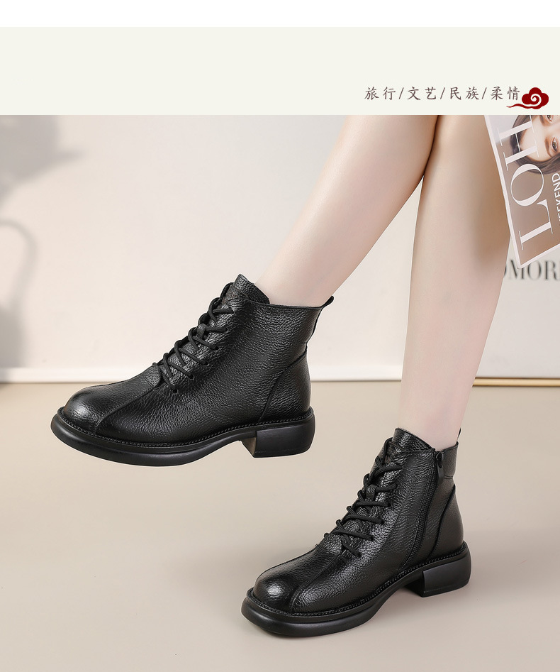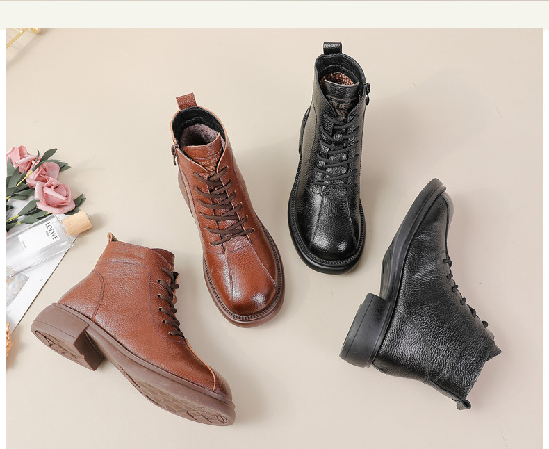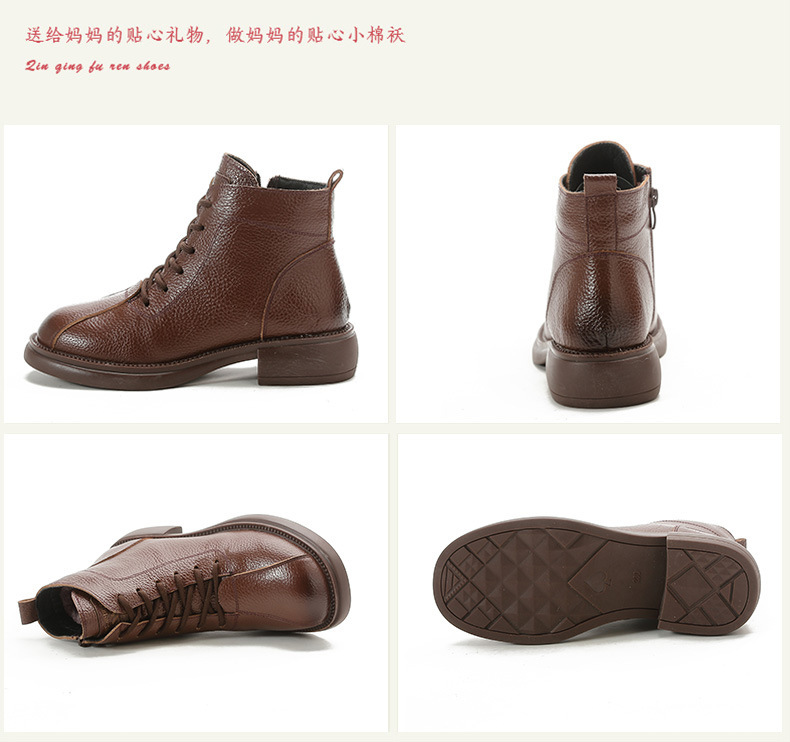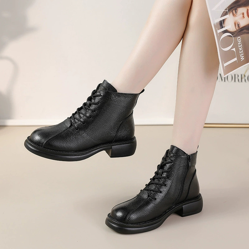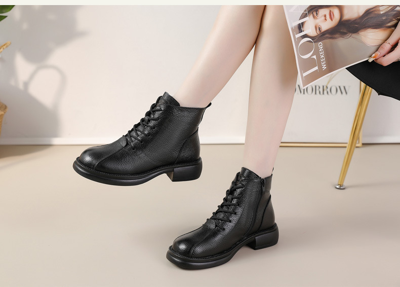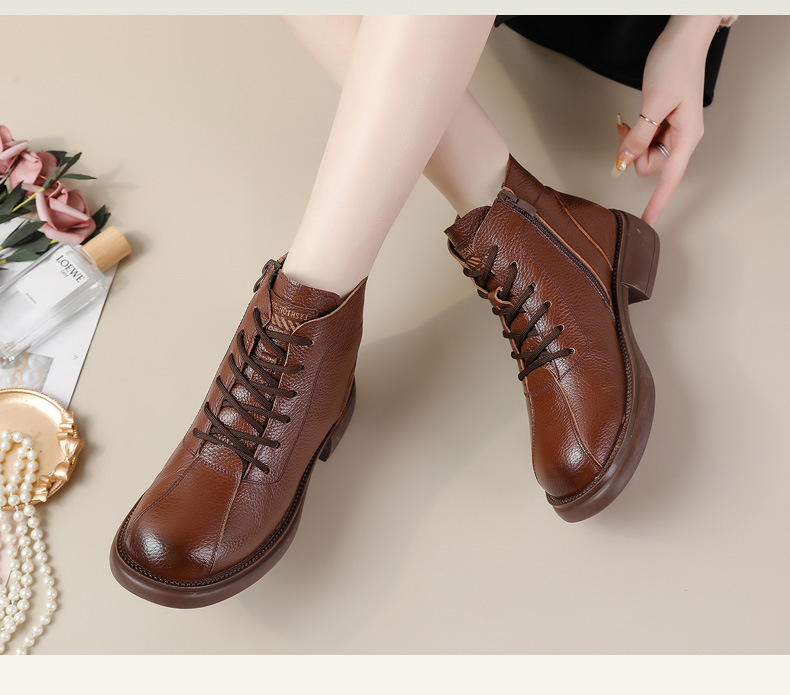 가을 새로운 탑 레이어 Cowhide 미드 힐 소프트 밑창 여성용 발목 부츠 레트로 캐주얼 정품 가죽 마틴 따뜻한 여성용 코튼 신발