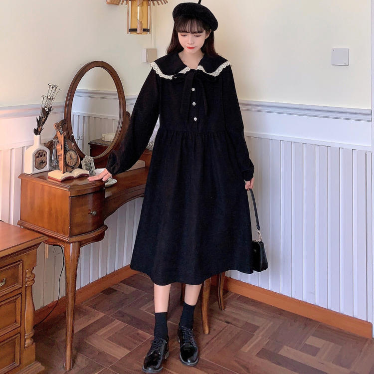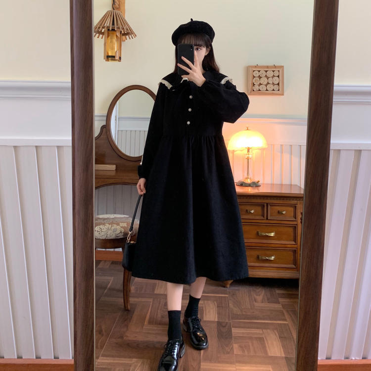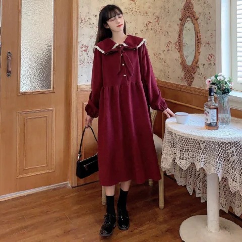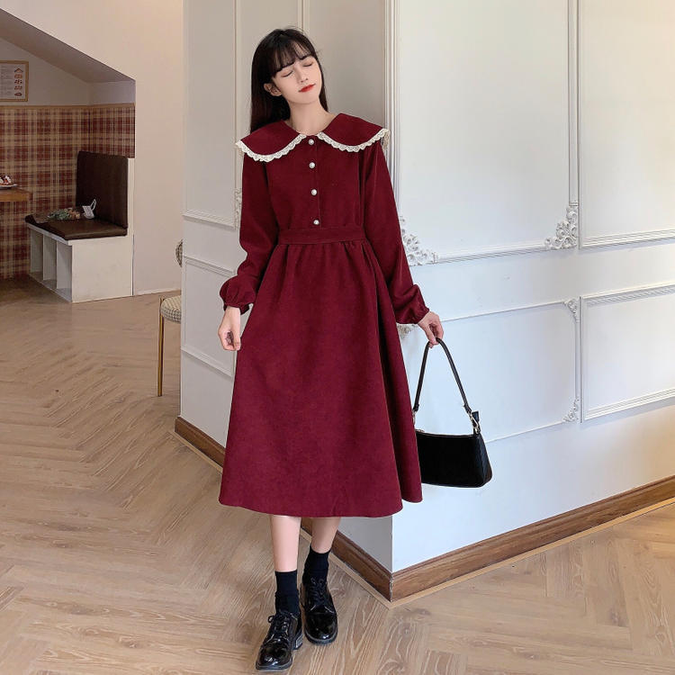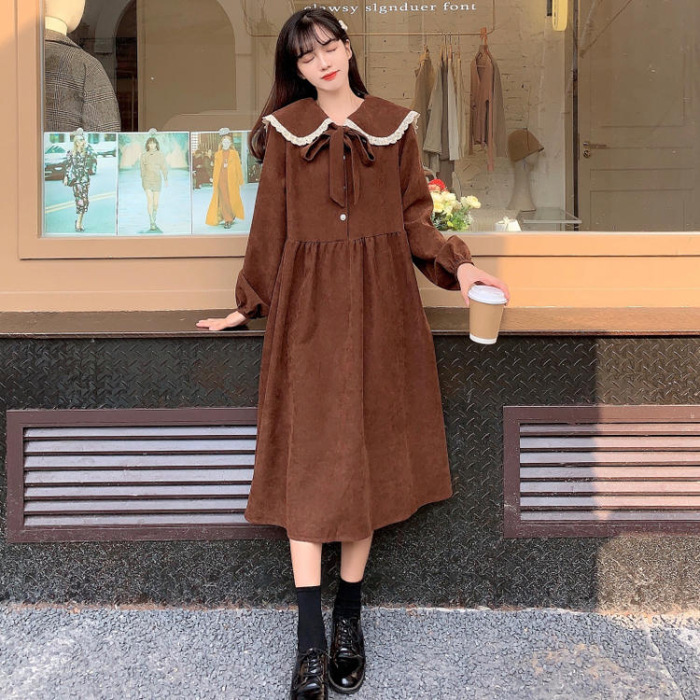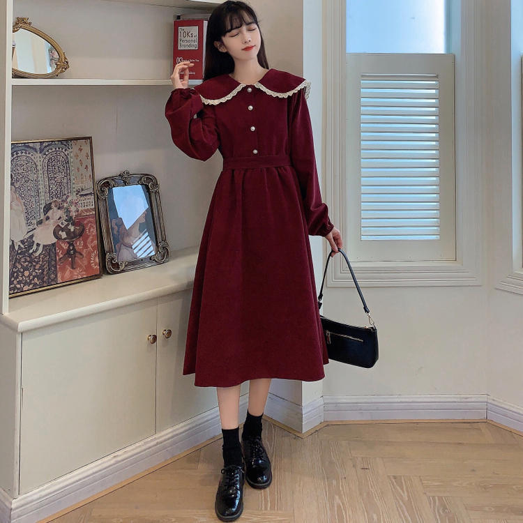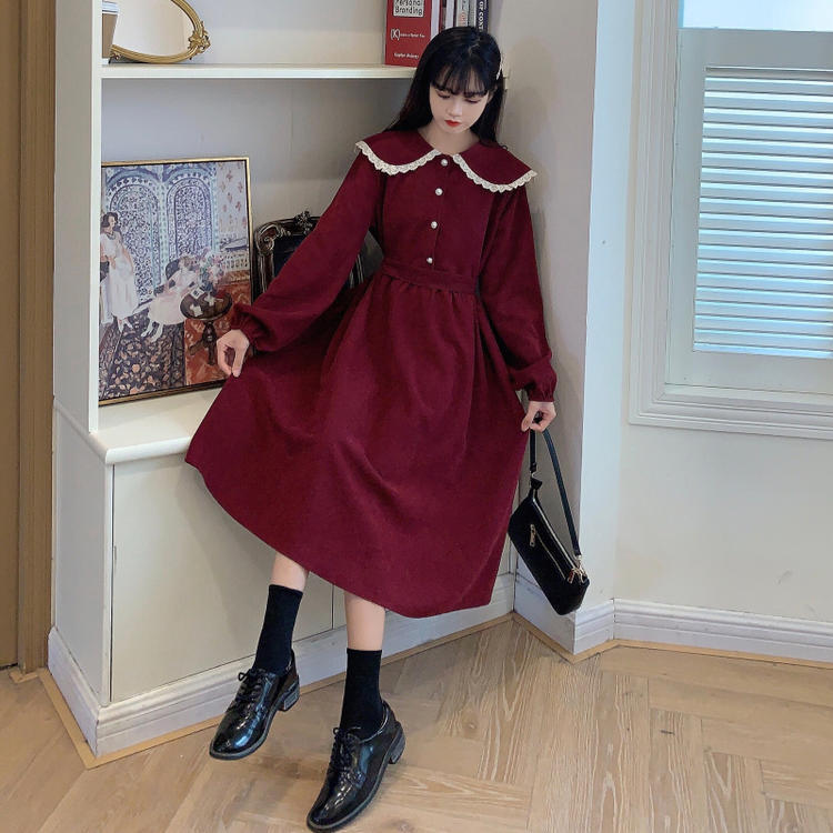 봄과 가을 2025 새로운 달콤한 프랑스 스타일 대학 스타일 코듀로이 타이트 허리 슬리밍 활 긴 소매 원피스 여성 스커트