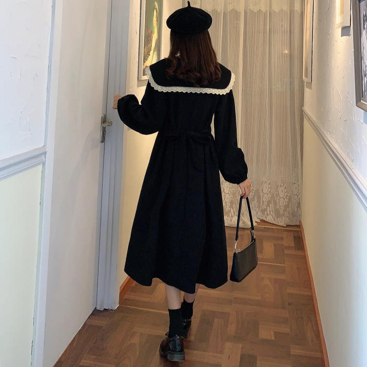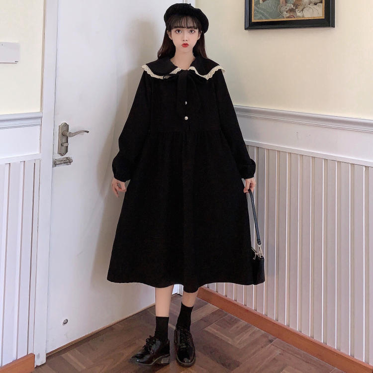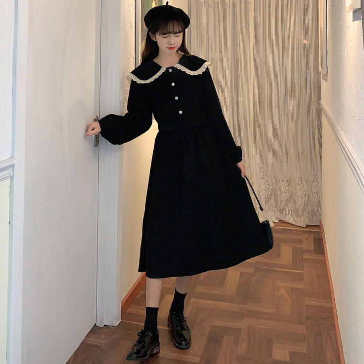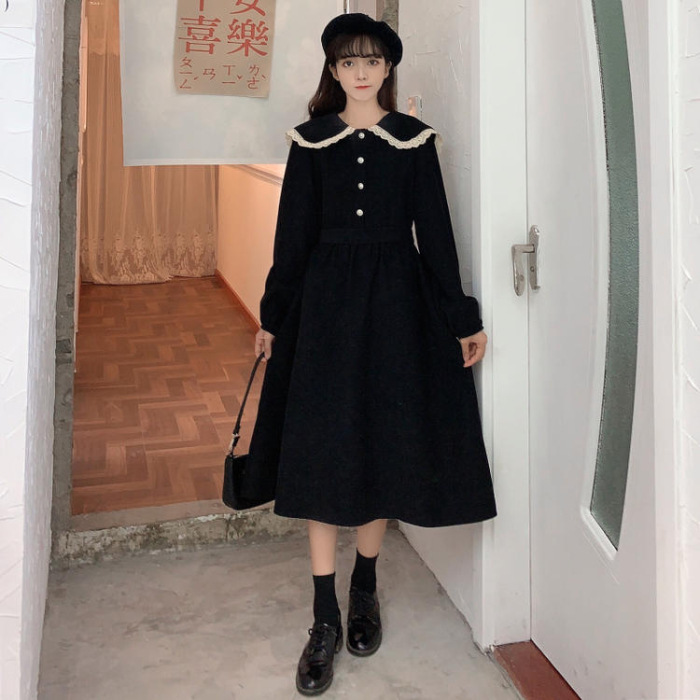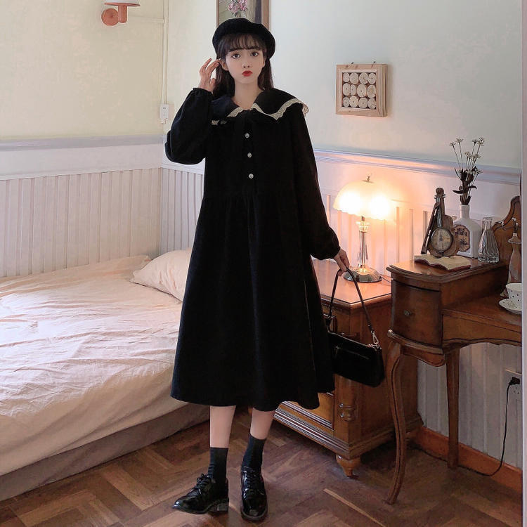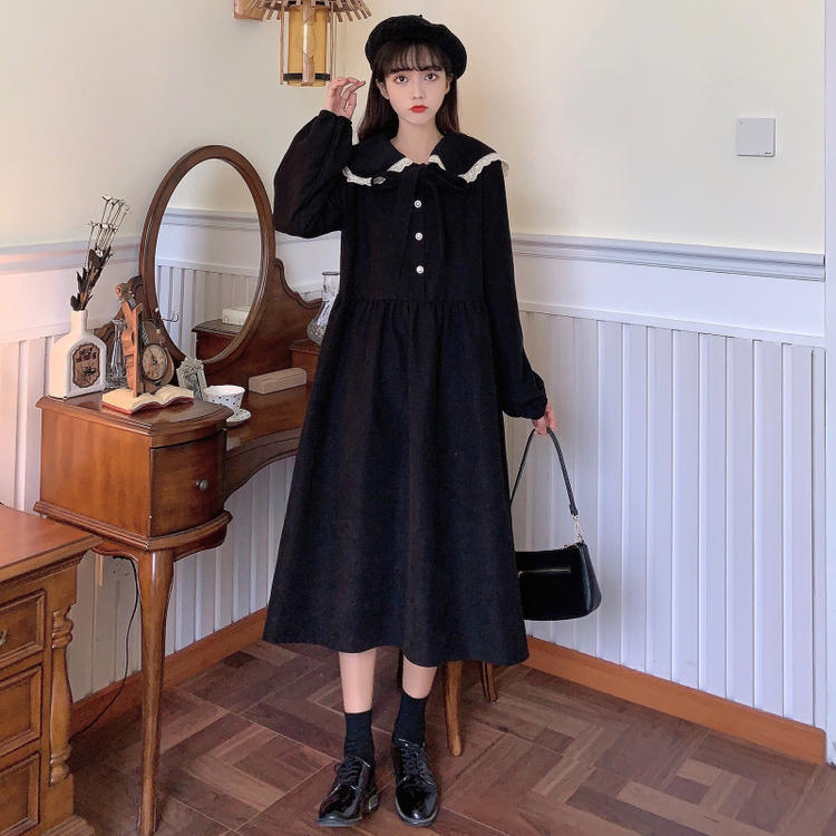 봄과 가을 2025 새로운 달콤한 프랑스 스타일 대학 스타일 코듀로이 타이트 허리 슬리밍 활 긴 소매 원피스 여성 스커트