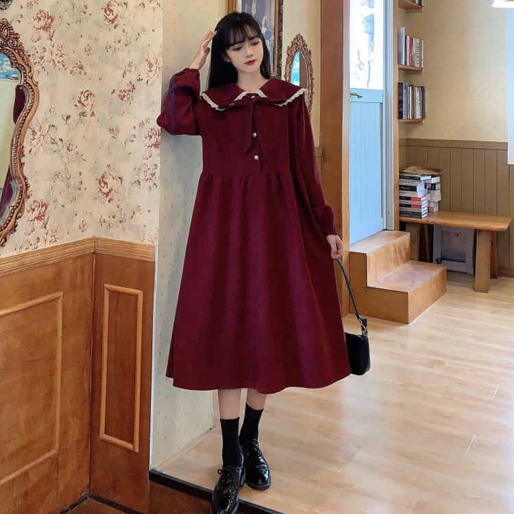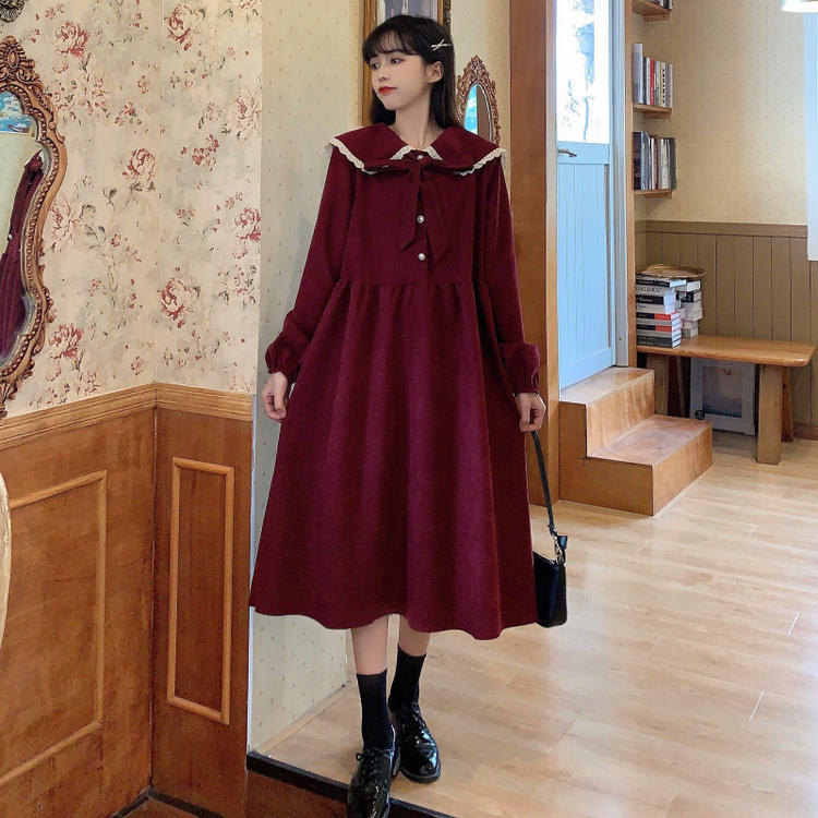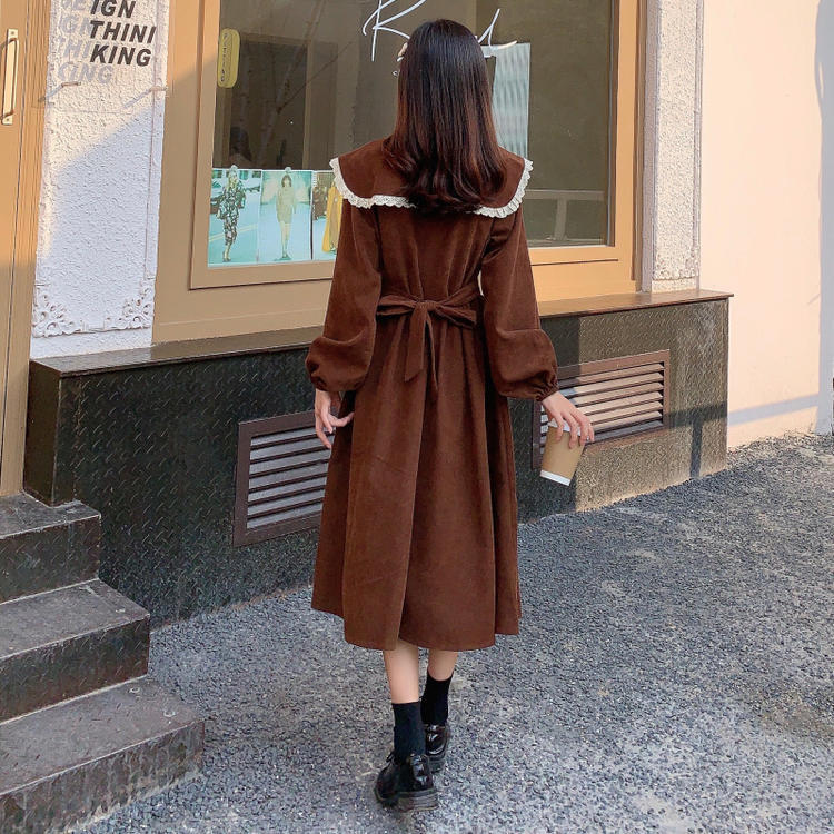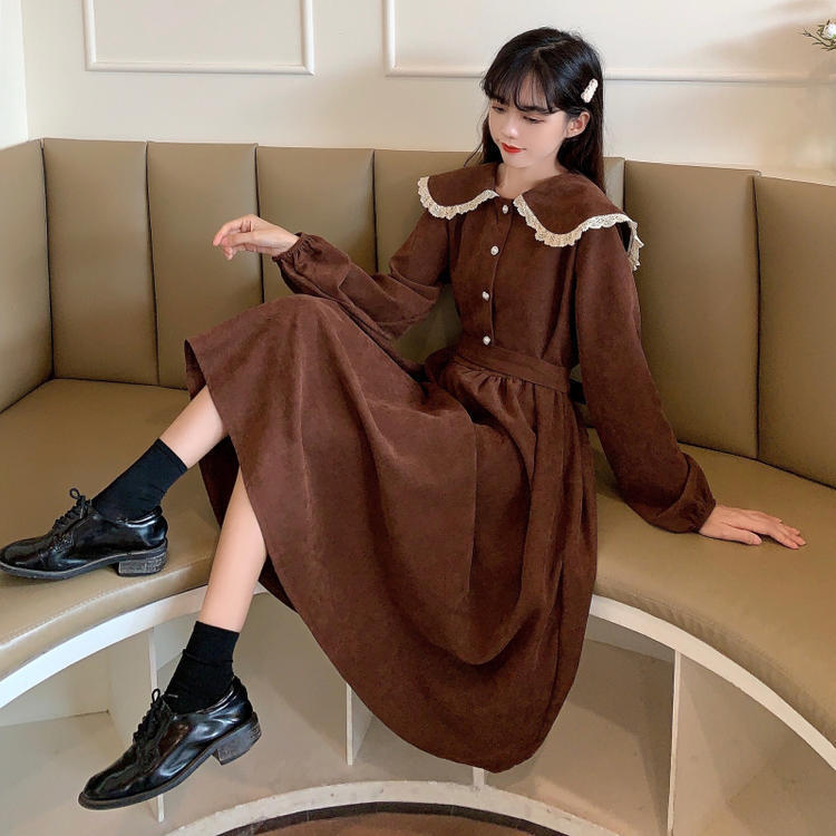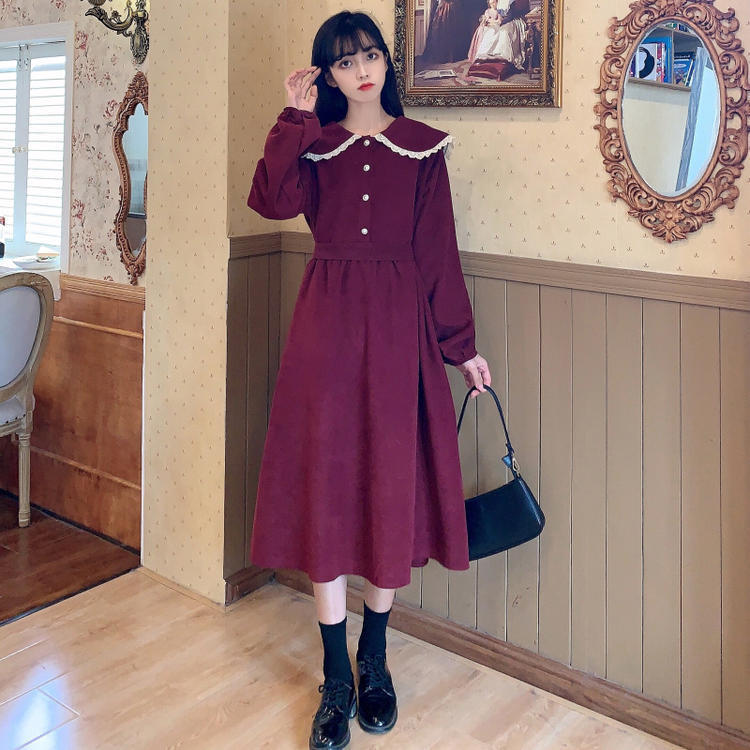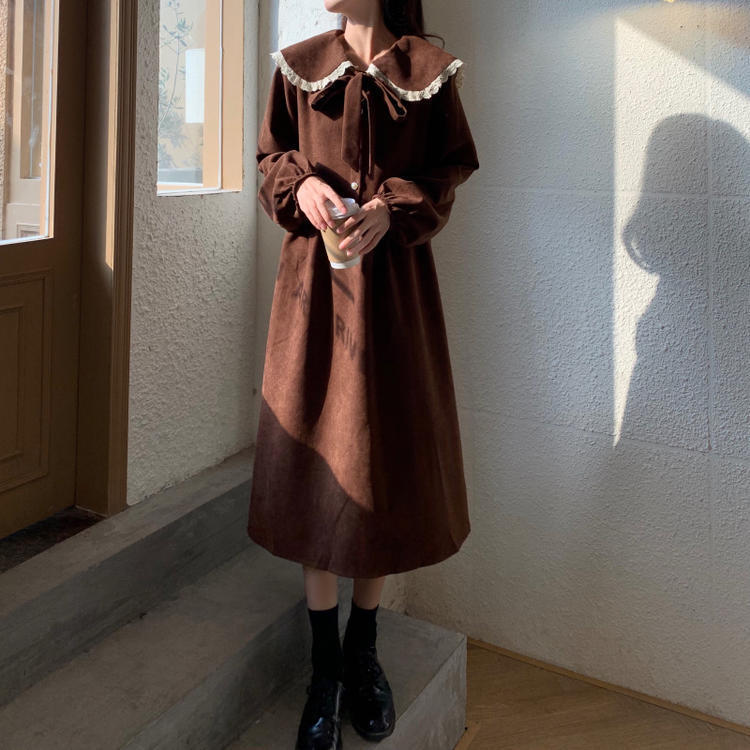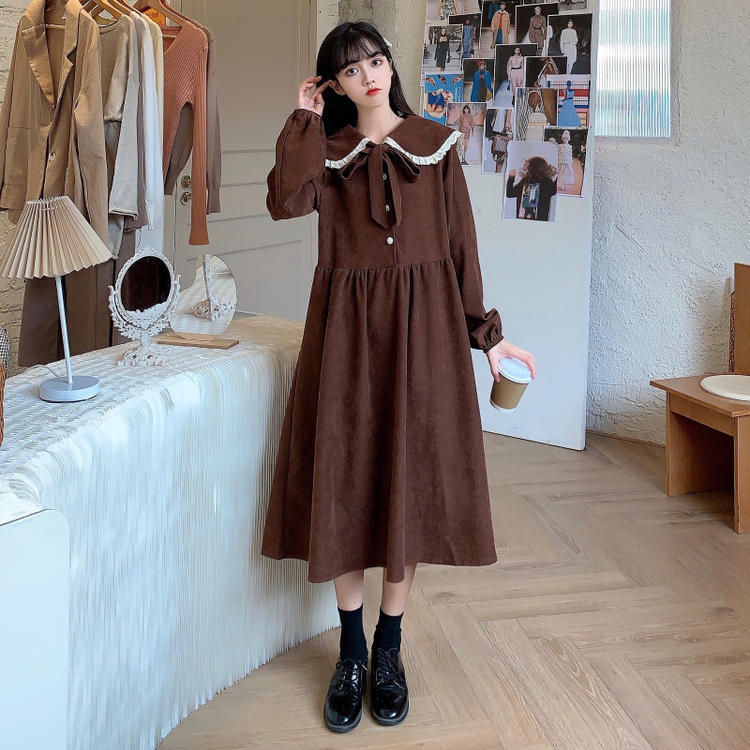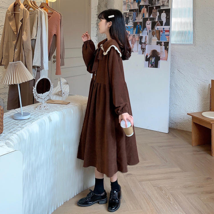 봄과 가을 2025 새로운 달콤한 프랑스 스타일 대학 스타일 코듀로이 타이트 허리 슬리밍 활 긴 소매 원피스 여성 스커트스토어 가기