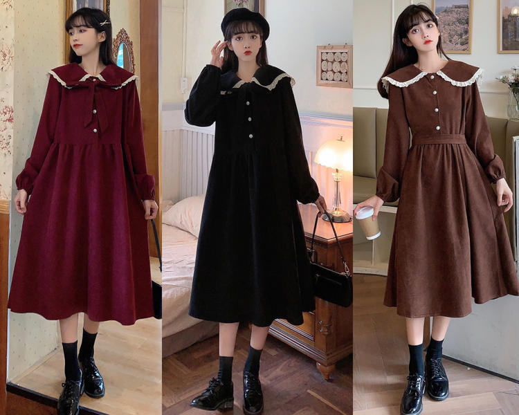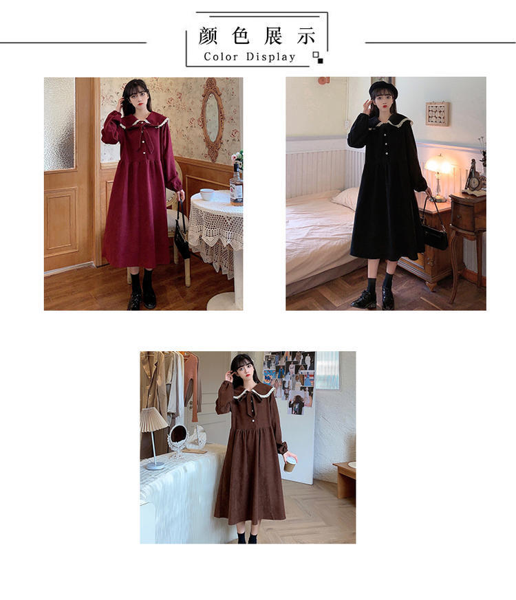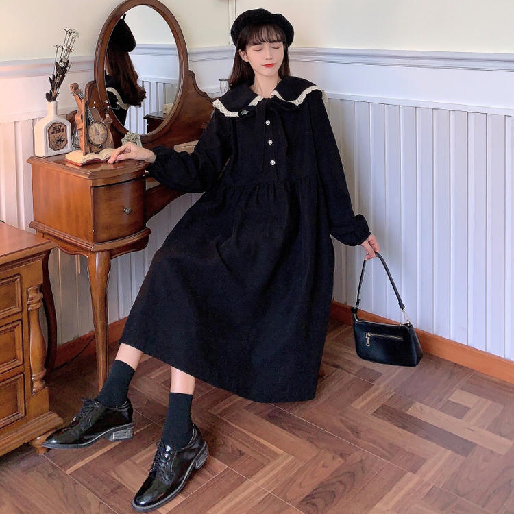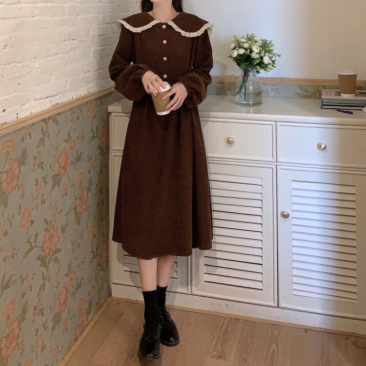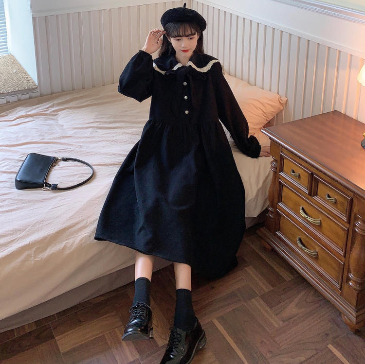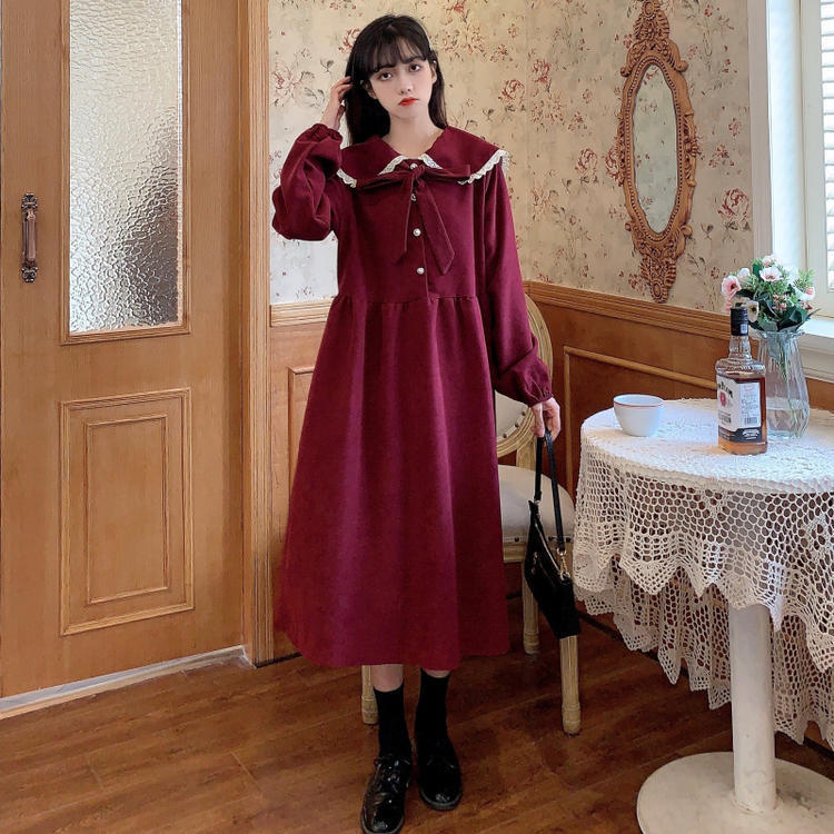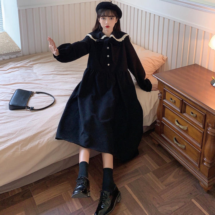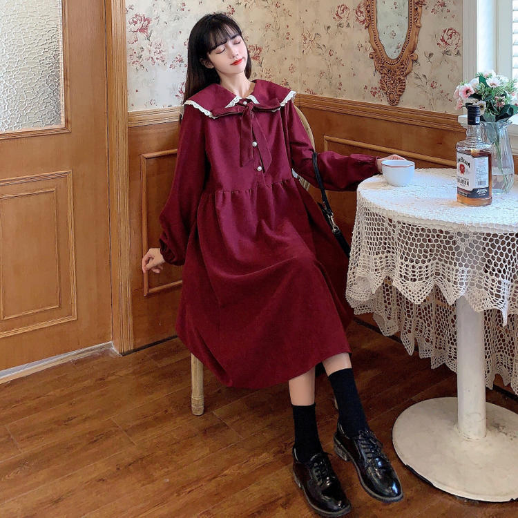 봄과 가을 2025 새로운 달콤한 프랑스 스타일 대학 스타일 코듀로이 타이트 허리 슬리밍 활 긴 소매 원피스 여성 스커트스토어 가기