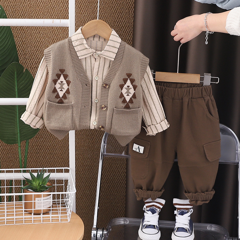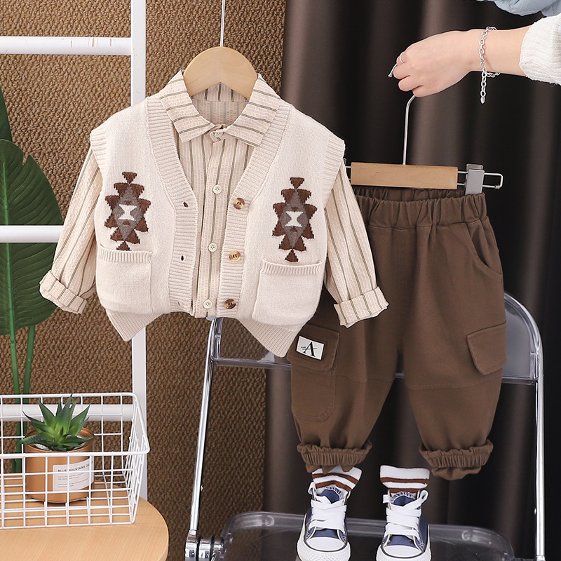 봄 2025 새로운 소년 포켓 스웨터 카디건 긴 소매 3 조각 세트 남성 아기 캐주얼 바지 세트 머리스토어 가기