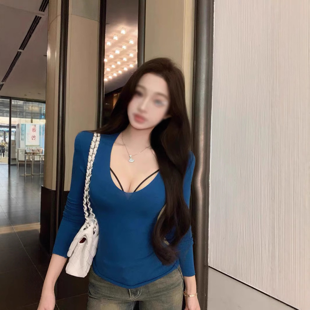 순수한 욕망 스타일 블루 V 넥 긴팔 어깨 티셔츠 여성의 겨울 단단한 허리 슬림-맞는 내부 스트레치 타이트베이스 셔츠 탑스토어 가기