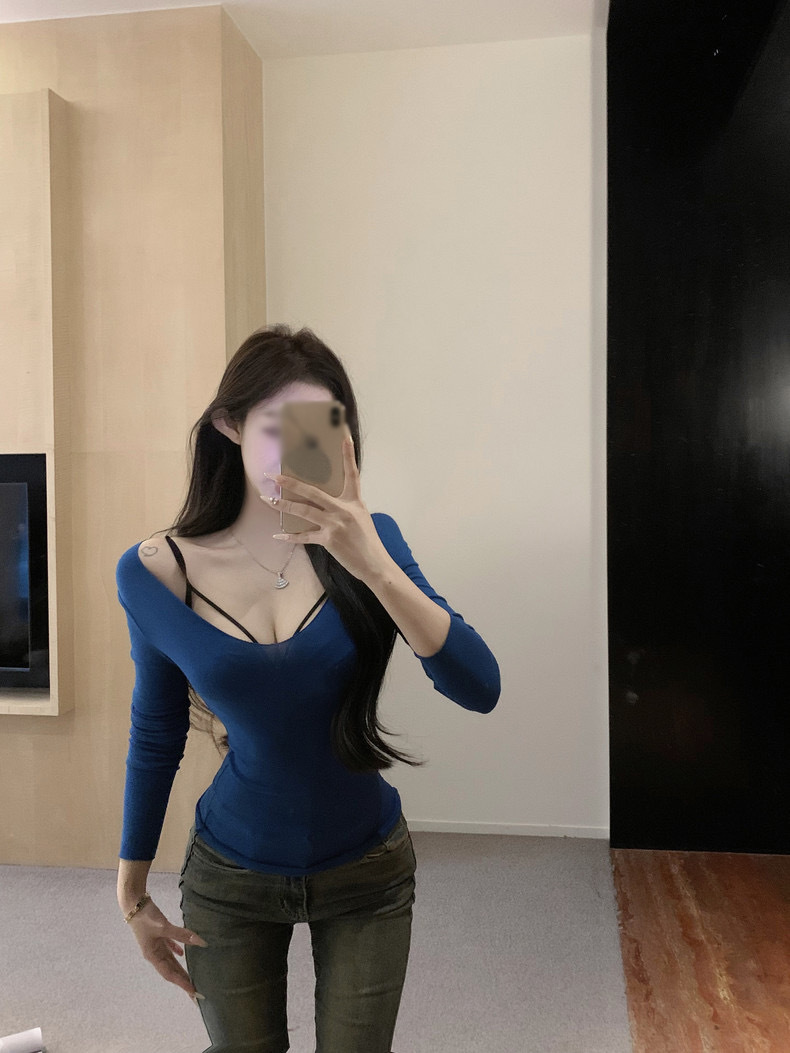 순수한 욕망 스타일 블루 V 넥 긴팔 어깨 티셔츠 여성의 겨울 단단한 허리 슬림-맞는 내부 스트레치 타이트베이스 셔츠 탑