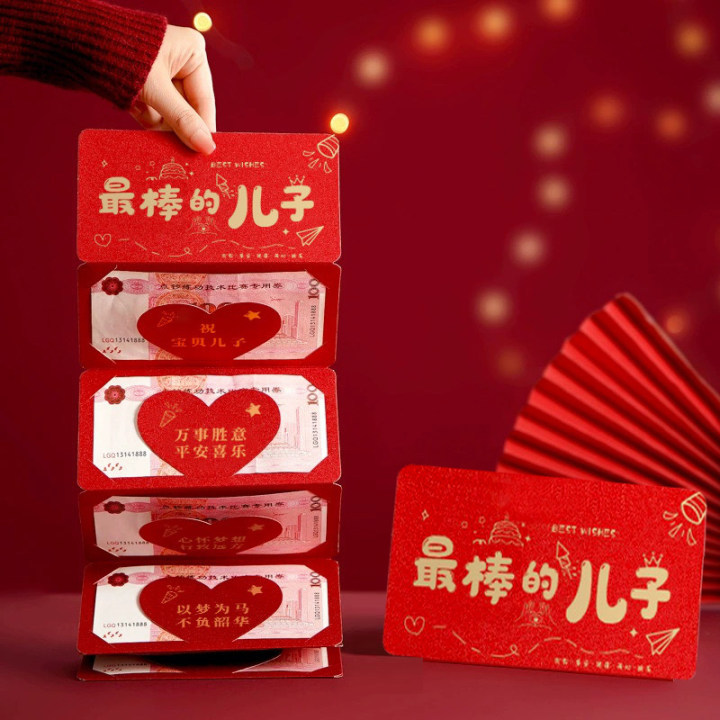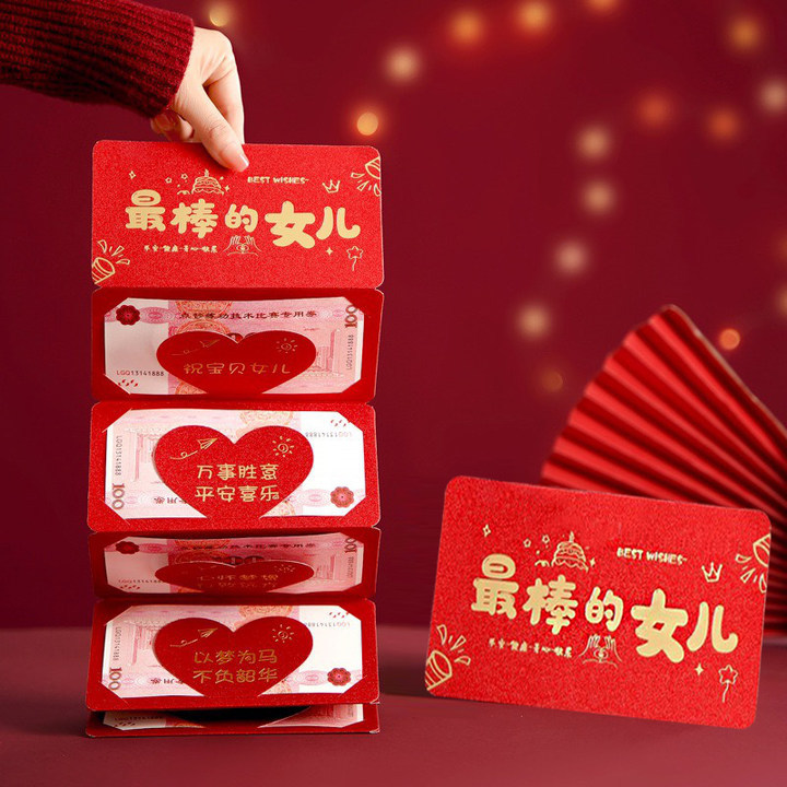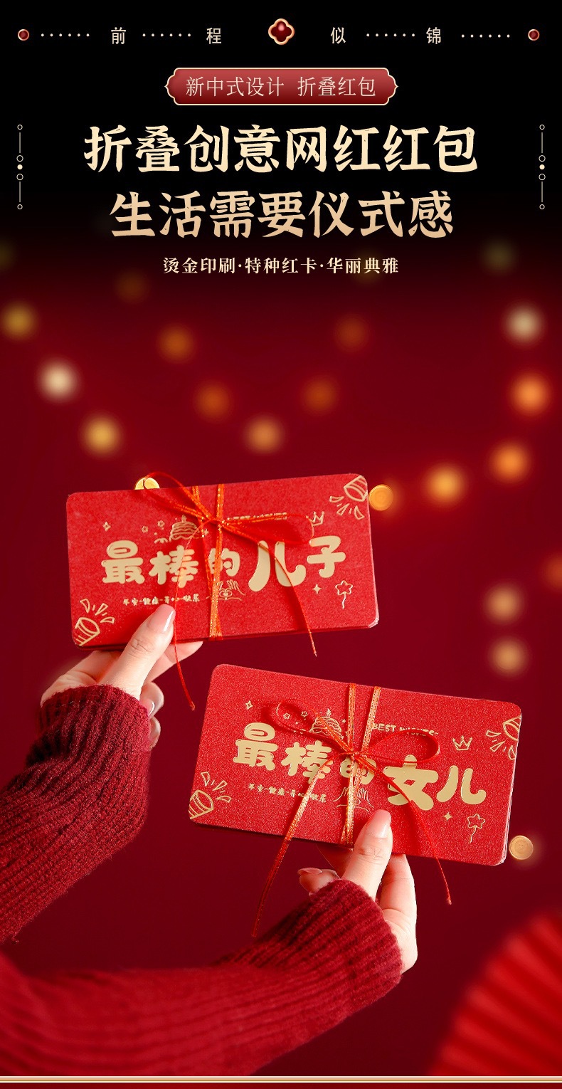 새해의 의식 빨간 봉투 소녀 소년은 아들과 딸에게 새로운 행복 축복 접기와 풀 빨간 봉투스토어 가기