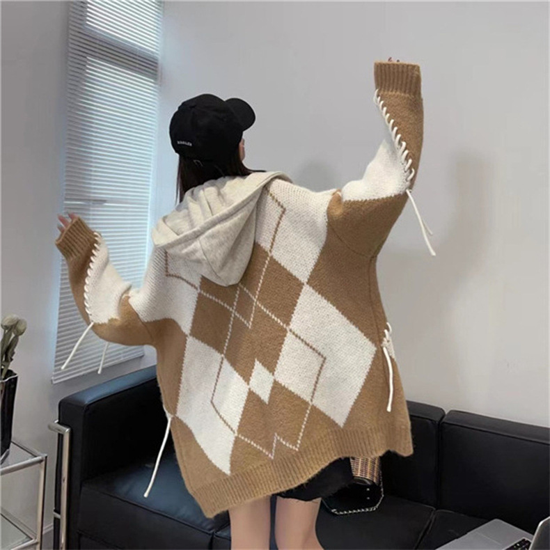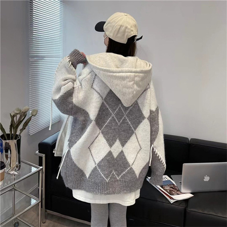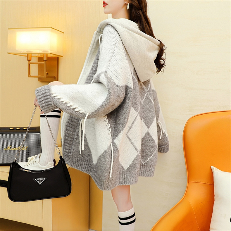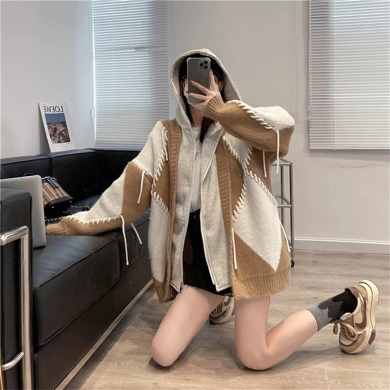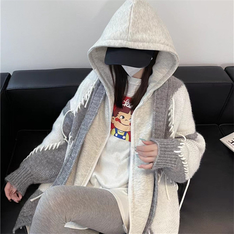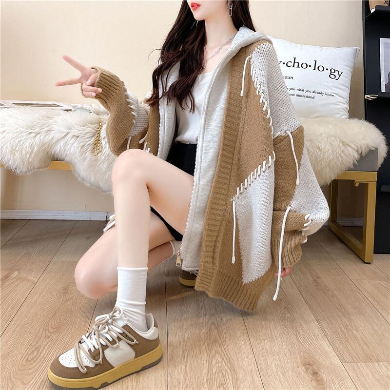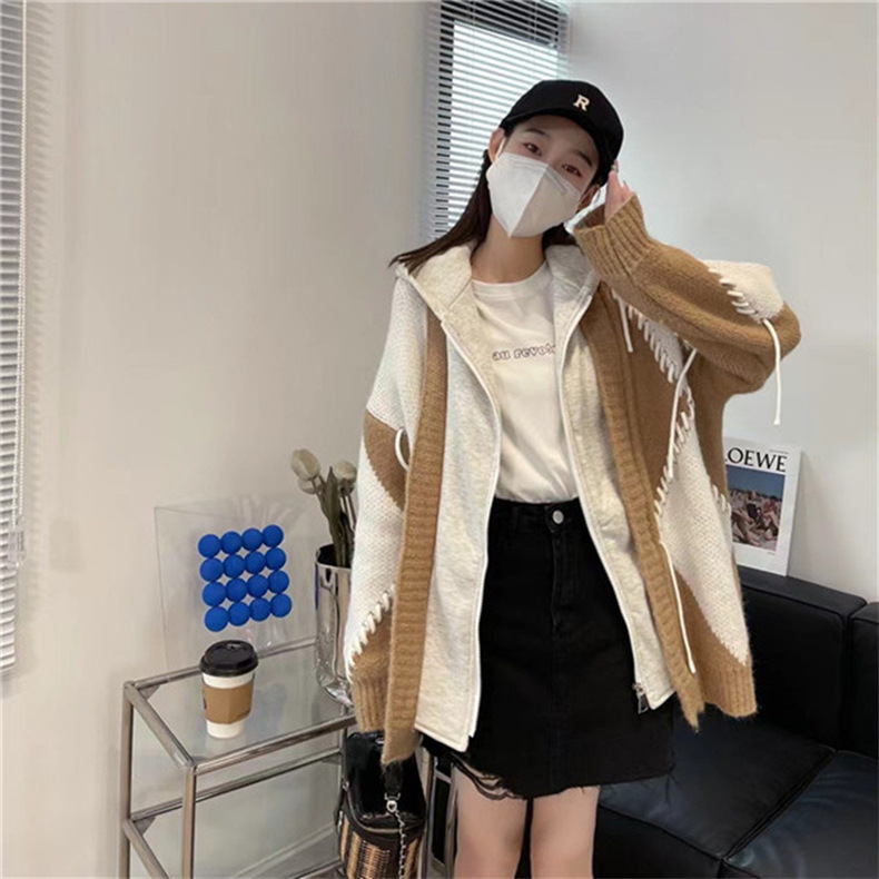 후드 스웨터 여성의 가을과 겨울 두꺼운 니트 자켓 느슨한 한국 스타일 게으른 스타일 바느질 가짜 투피스 스웨터 카디건 트렌디스토어 가기