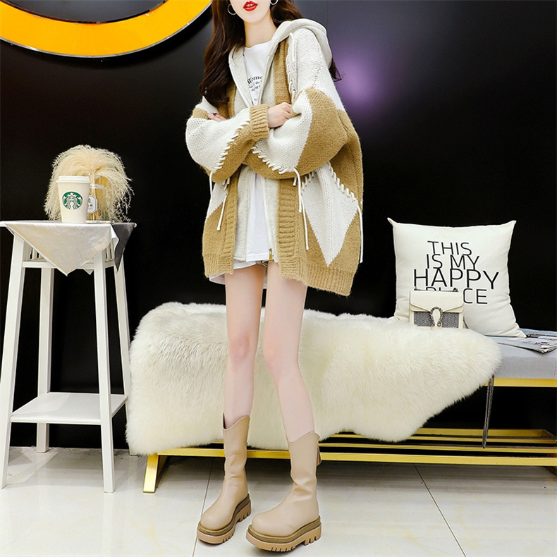 후드 스웨터 여성의 가을과 겨울 두꺼운 니트 자켓 느슨한 한국 스타일 게으른 스타일 바느질 가짜 투피스 스웨터 카디건 트렌디