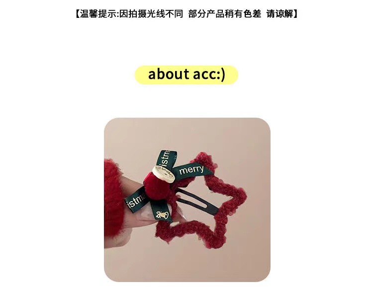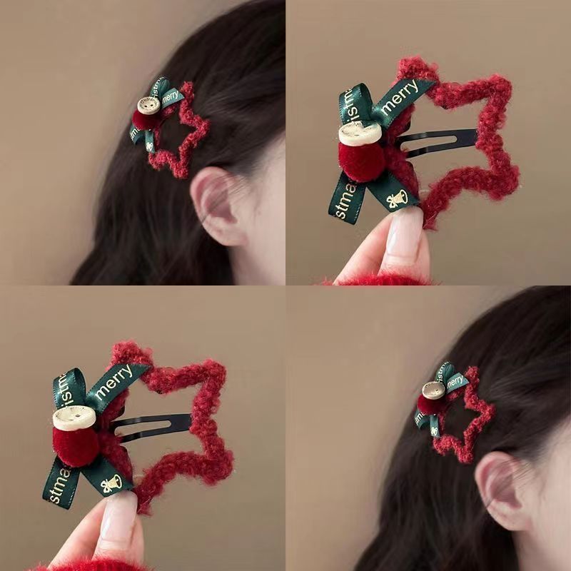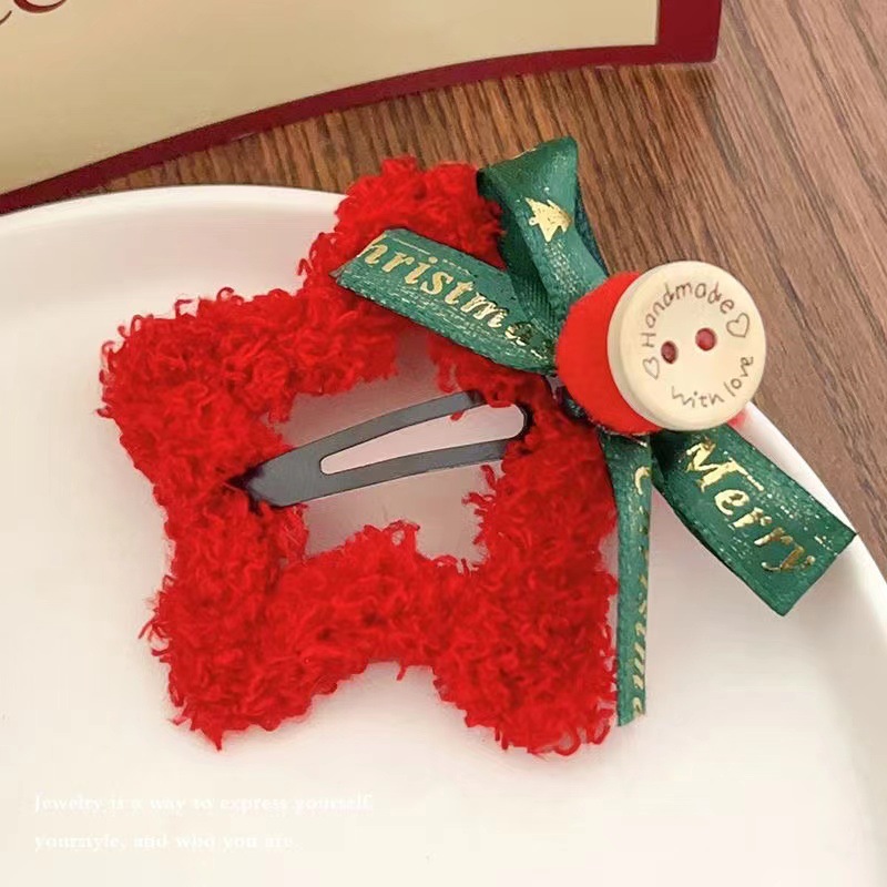 • 빨간색 털실 별 금색 리본 머리핀