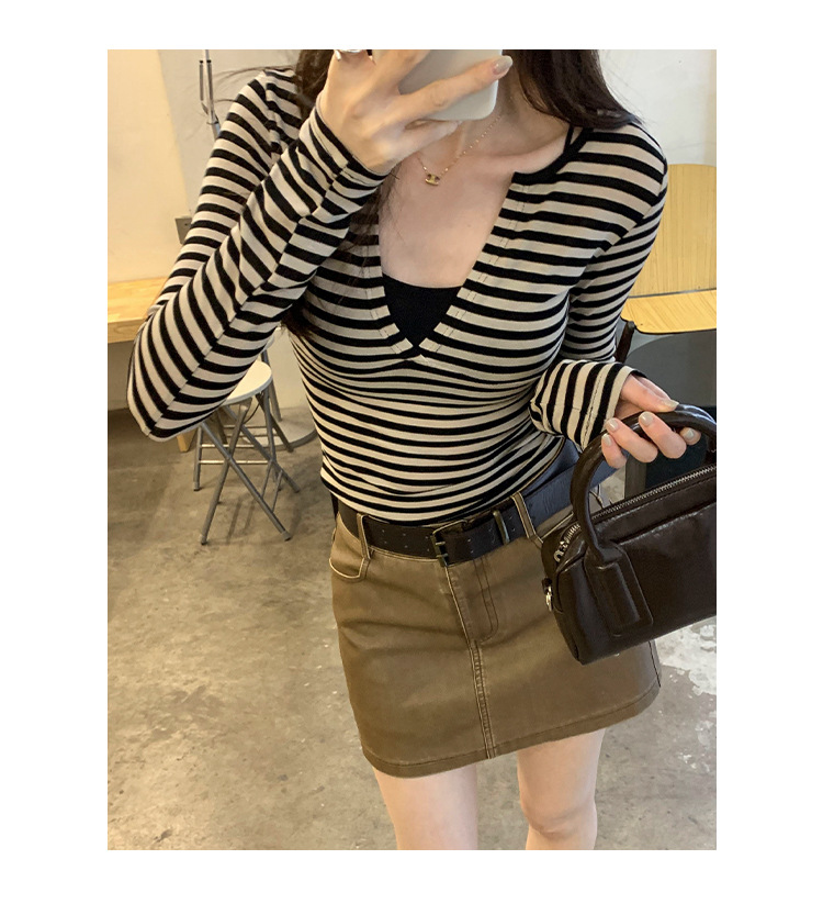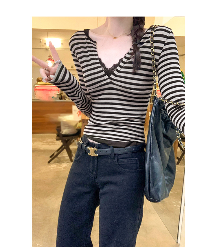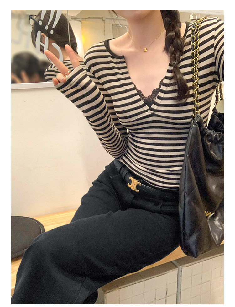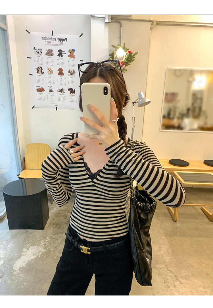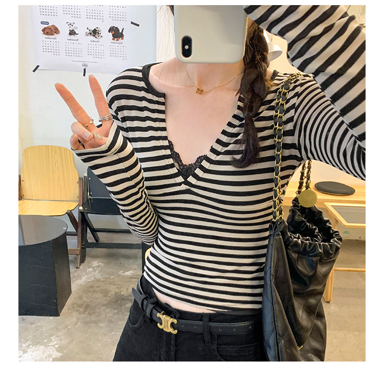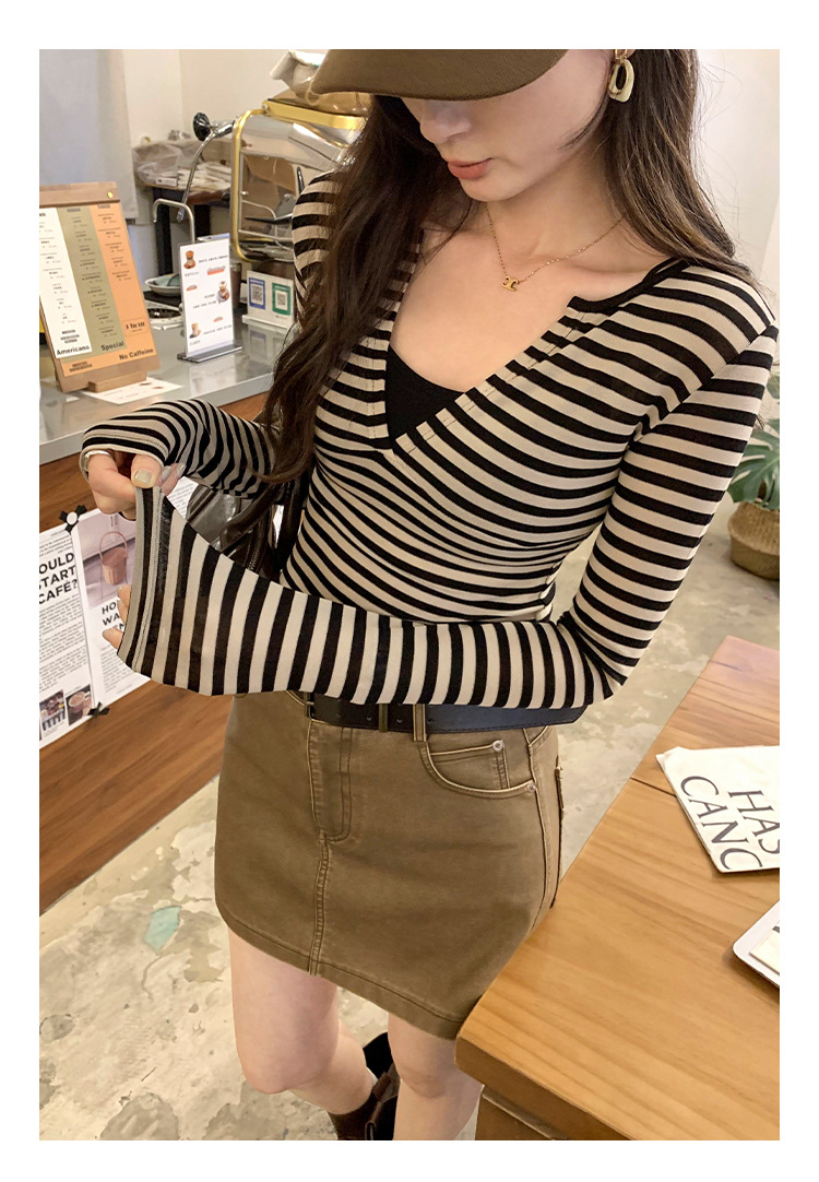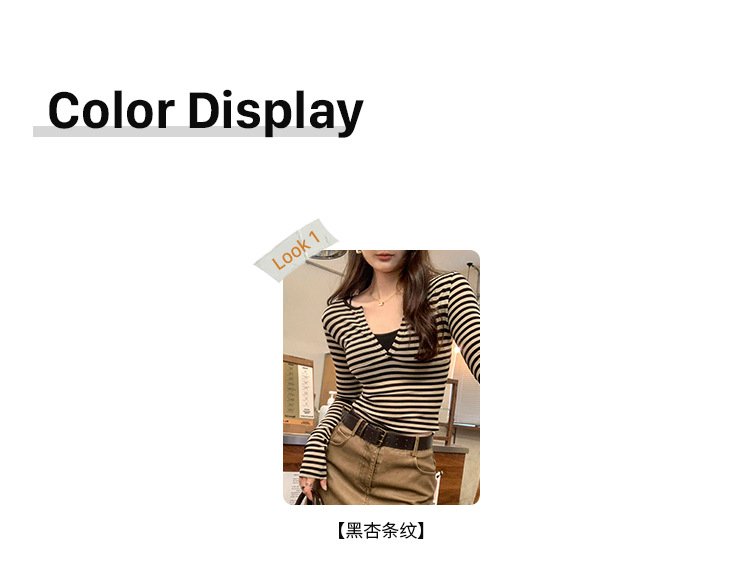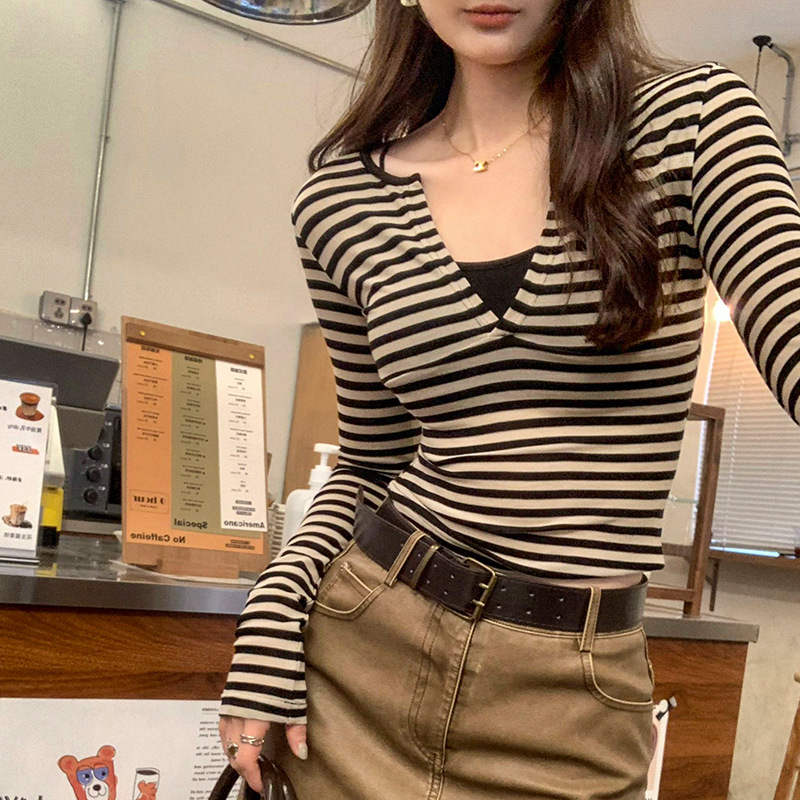 뜨거운 소녀 대비 컬러 스트라이프 V-넥 긴팔 내면베이스 셔츠 여성의 2025 봄 새로운 여성의 긴 소매 티셔츠 탑 트렌디스토어 가기