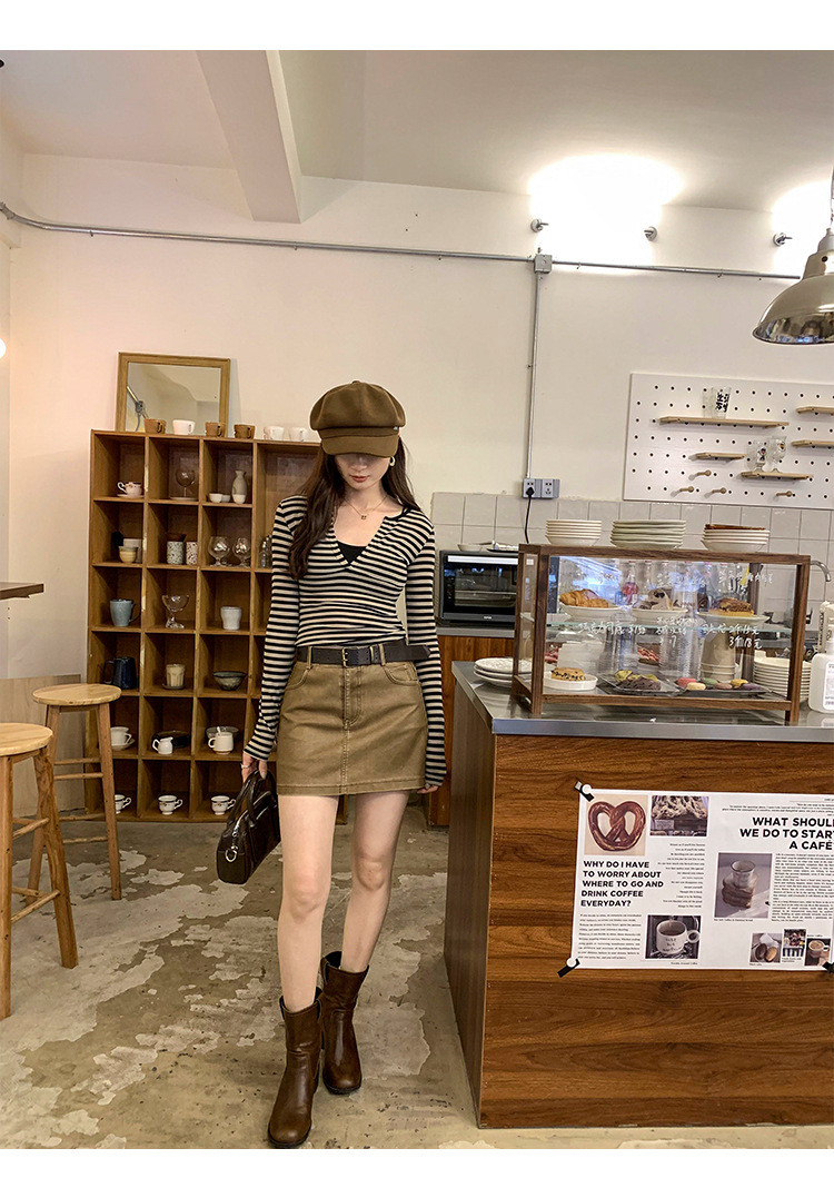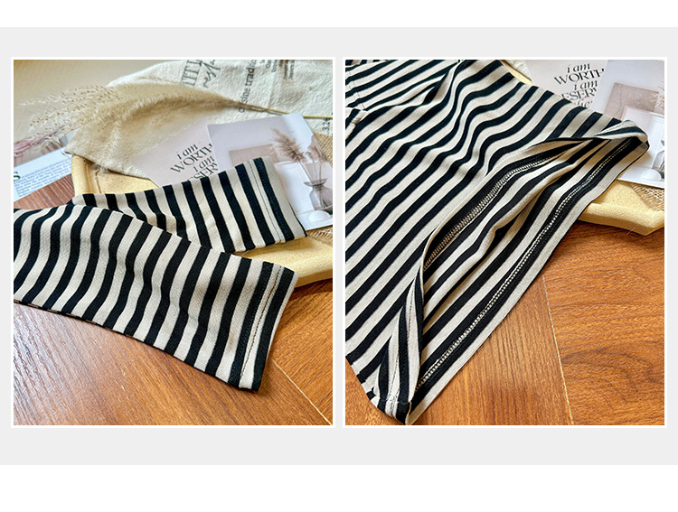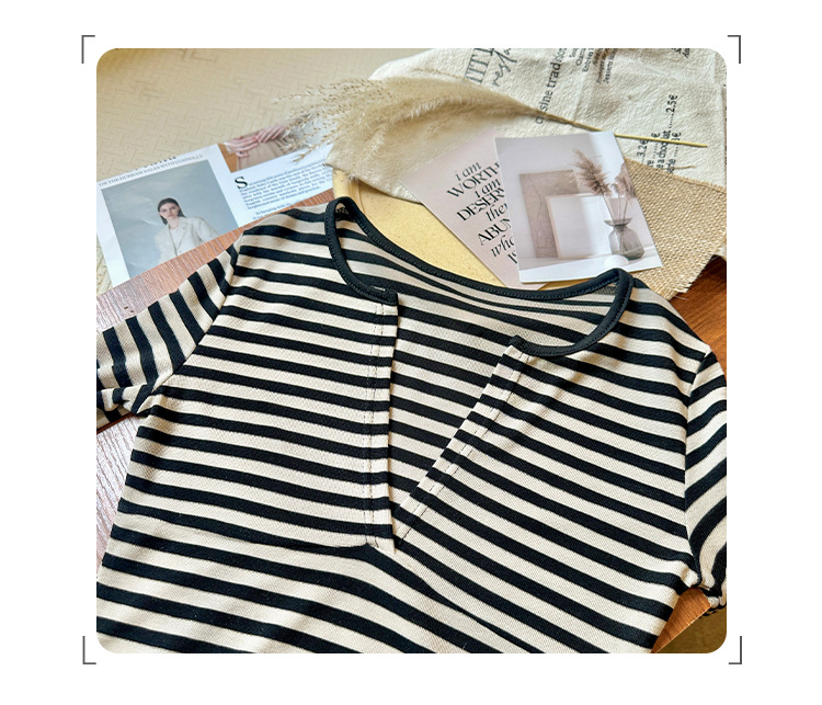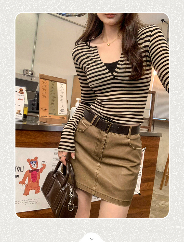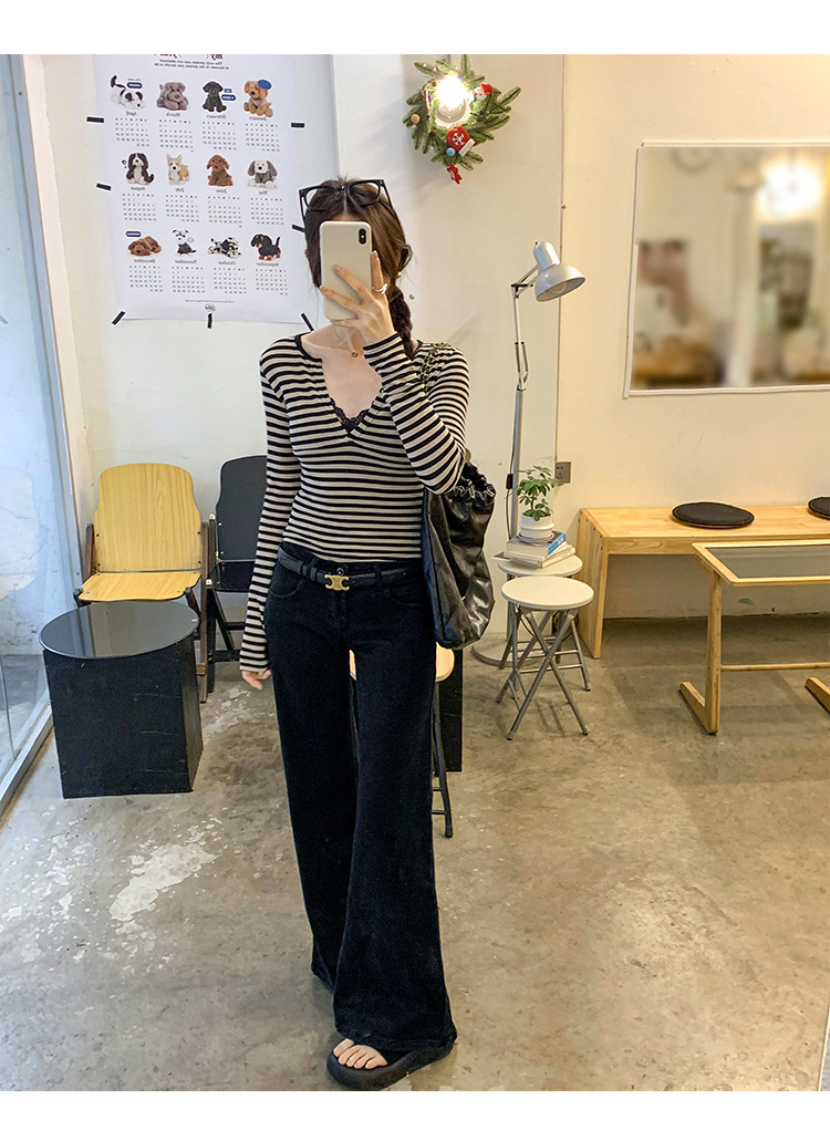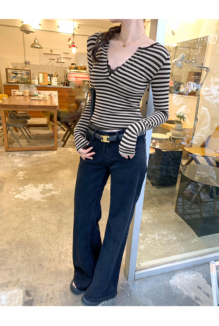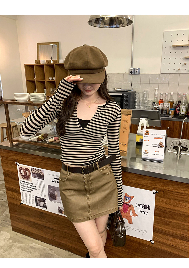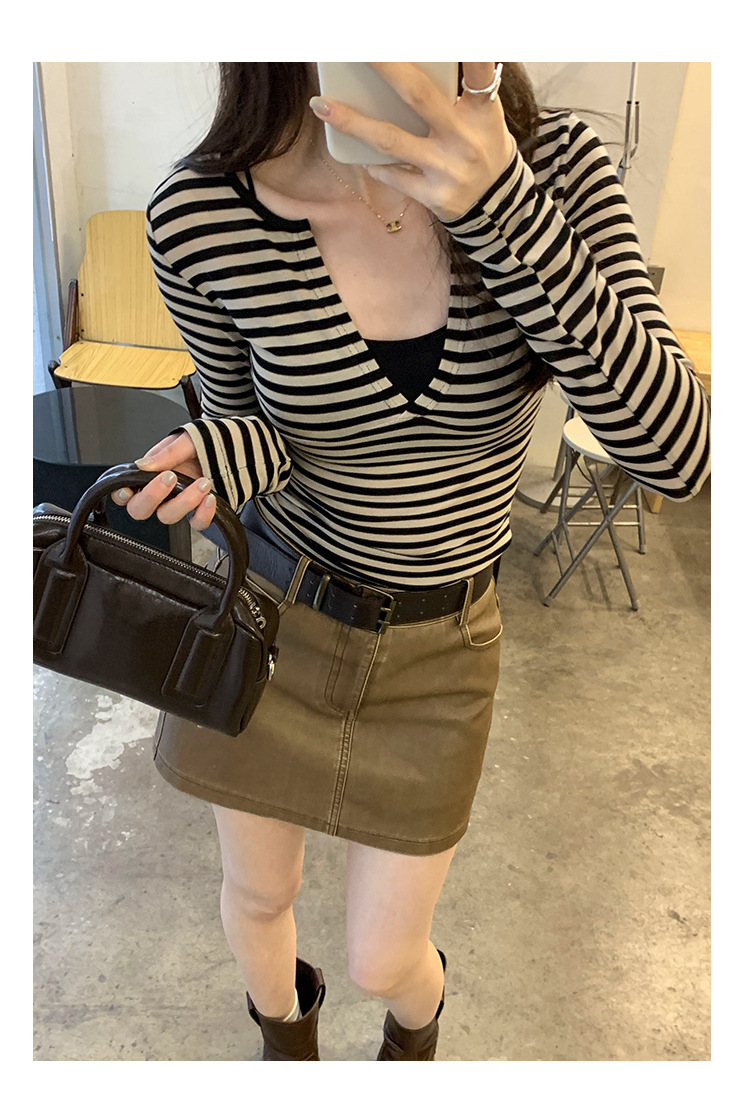 뜨거운 소녀 대비 컬러 스트라이프 V-넥 긴팔 내면베이스 셔츠 여성의 2025 봄 새로운 여성의 긴 소매 티셔츠 탑 트렌디스토어 가기
