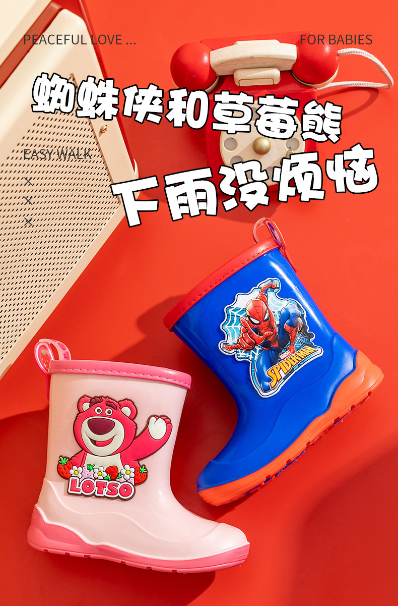 디즈니 어린이 장화 사계절 아기 장화 미끄럼 방지 유치원 귀여운 만화 딸기 곰 스파이더 맨 워터 슈즈