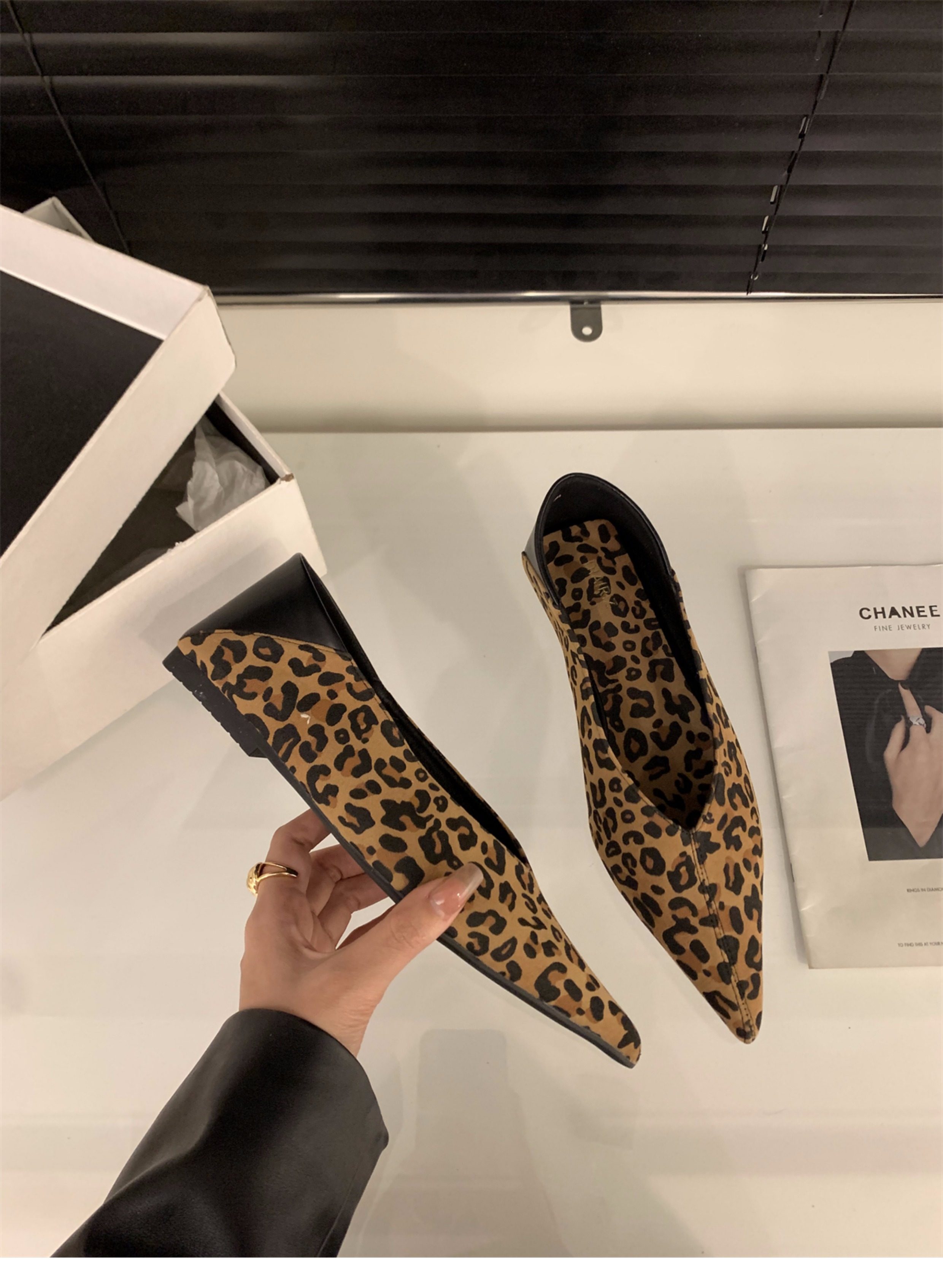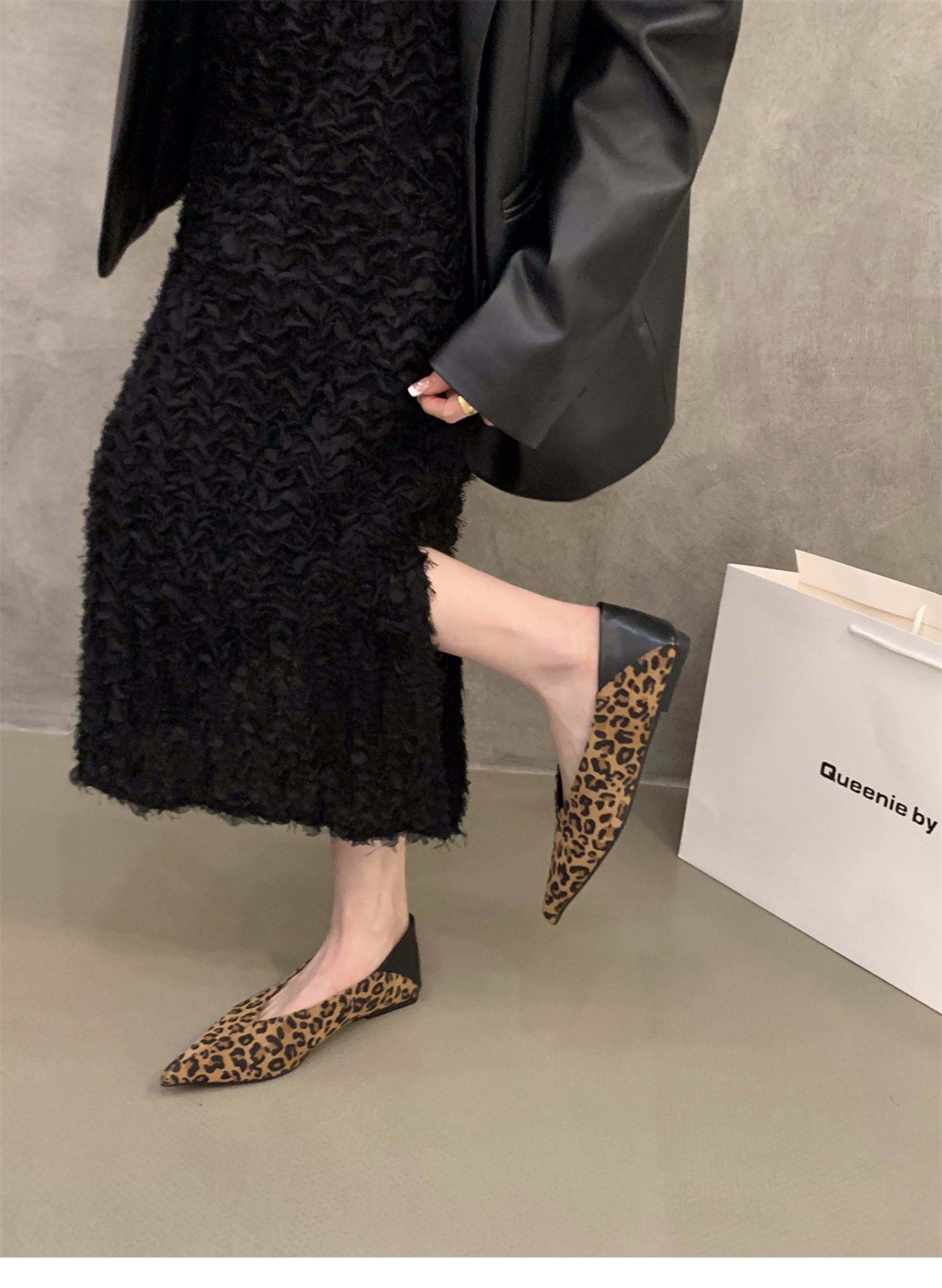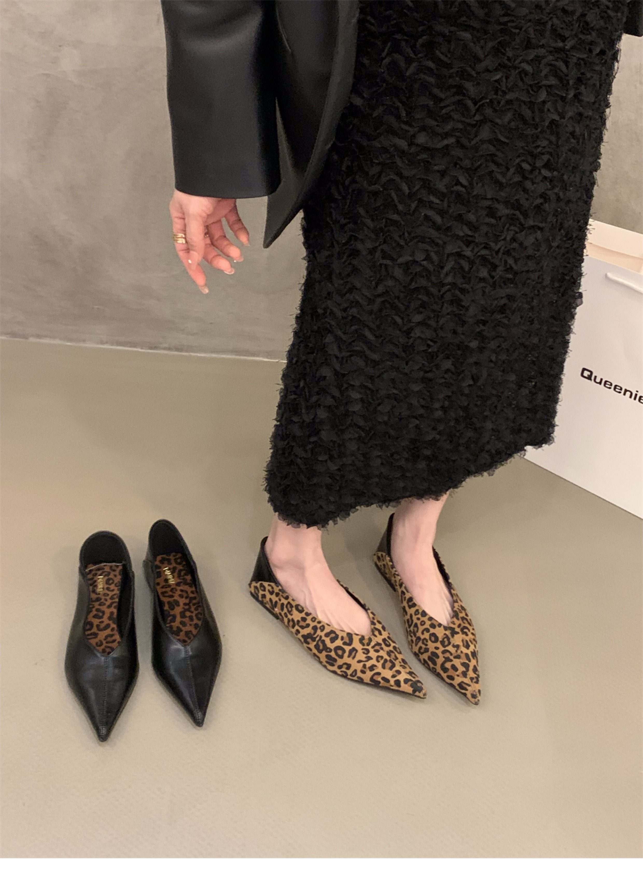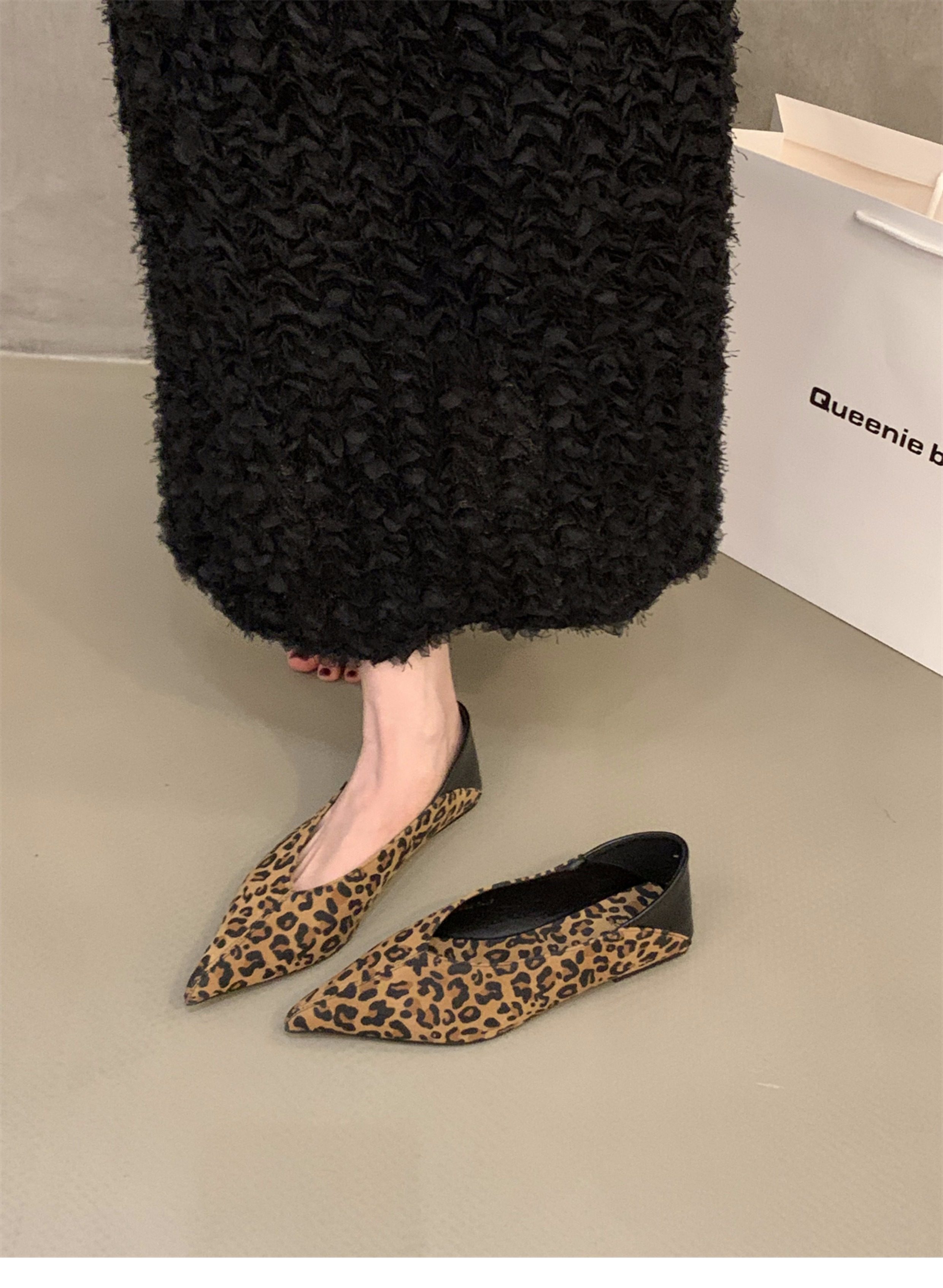 플랫 블랙 포인팅 발가락 신발 여성 신발 2025 새로운 봄 빈티지 스웨이드 프랑스 레오파드 무늬 얕은 입 신발스토어 가기