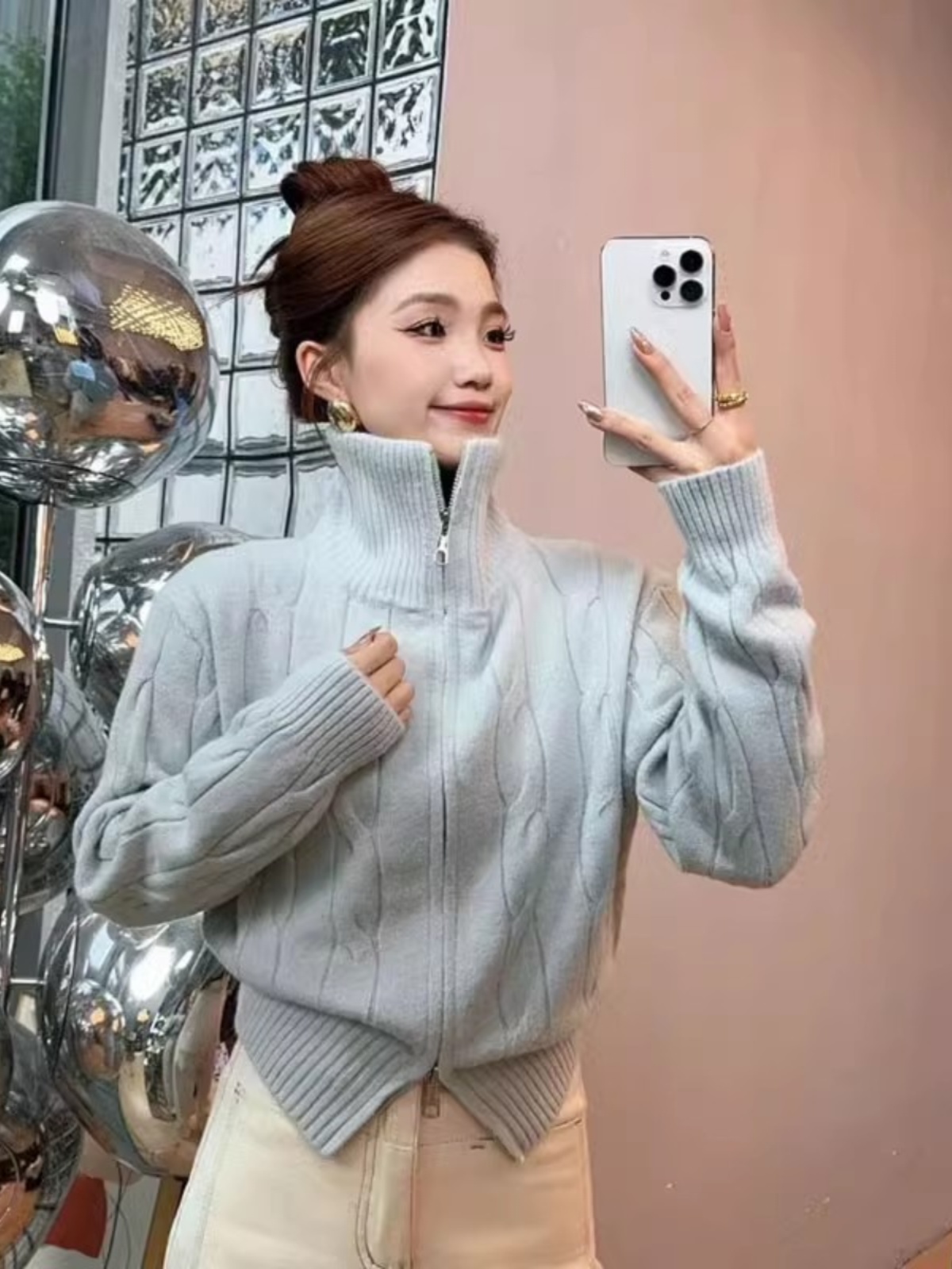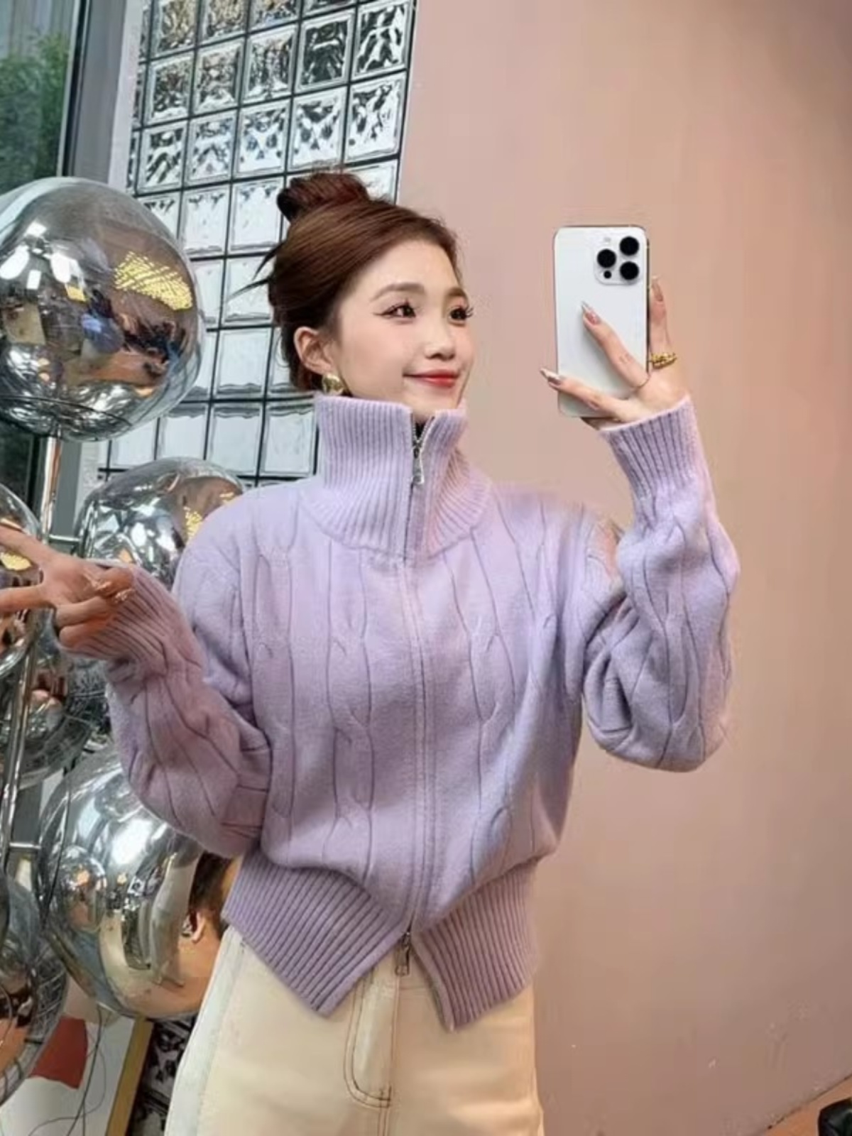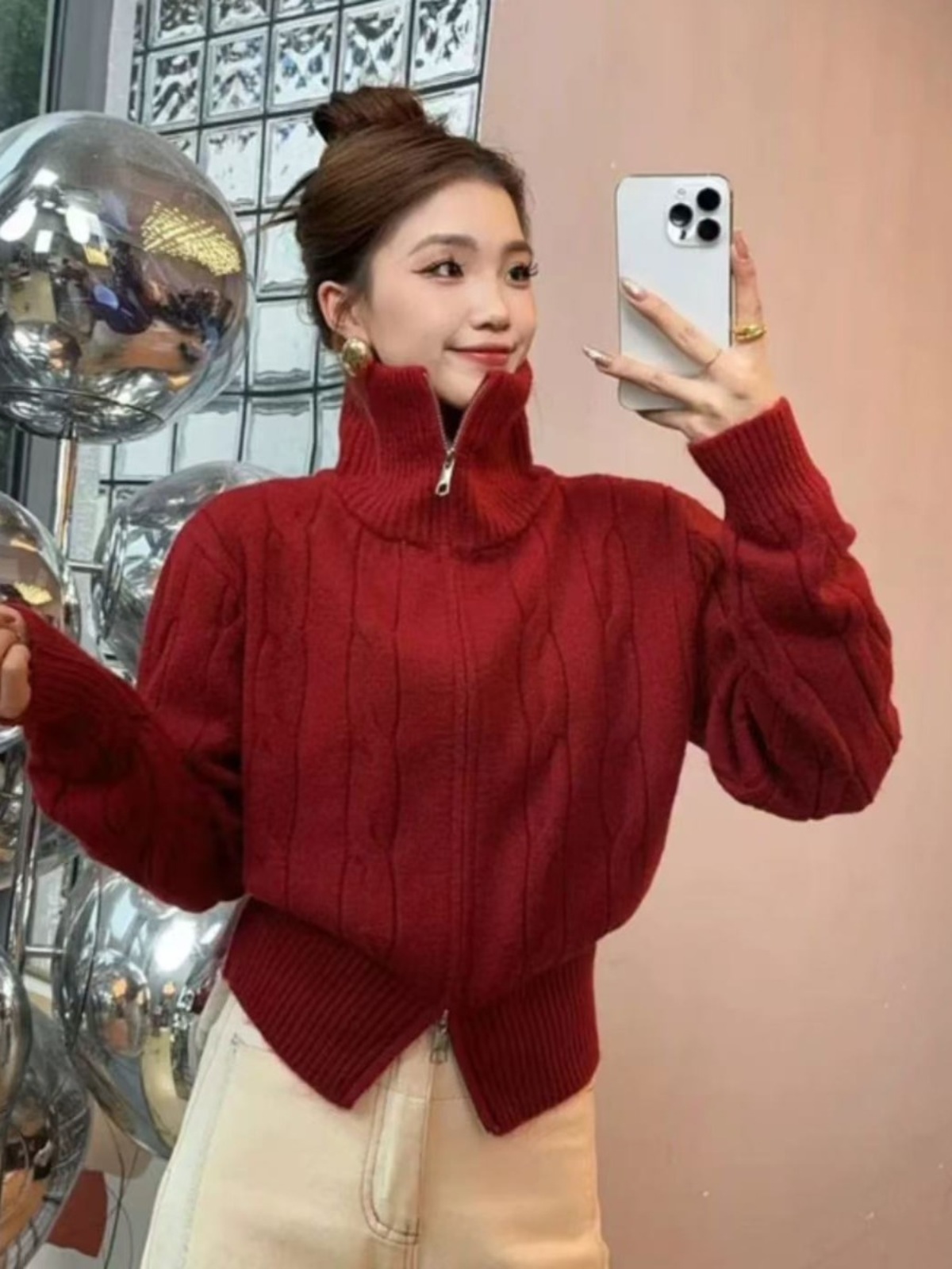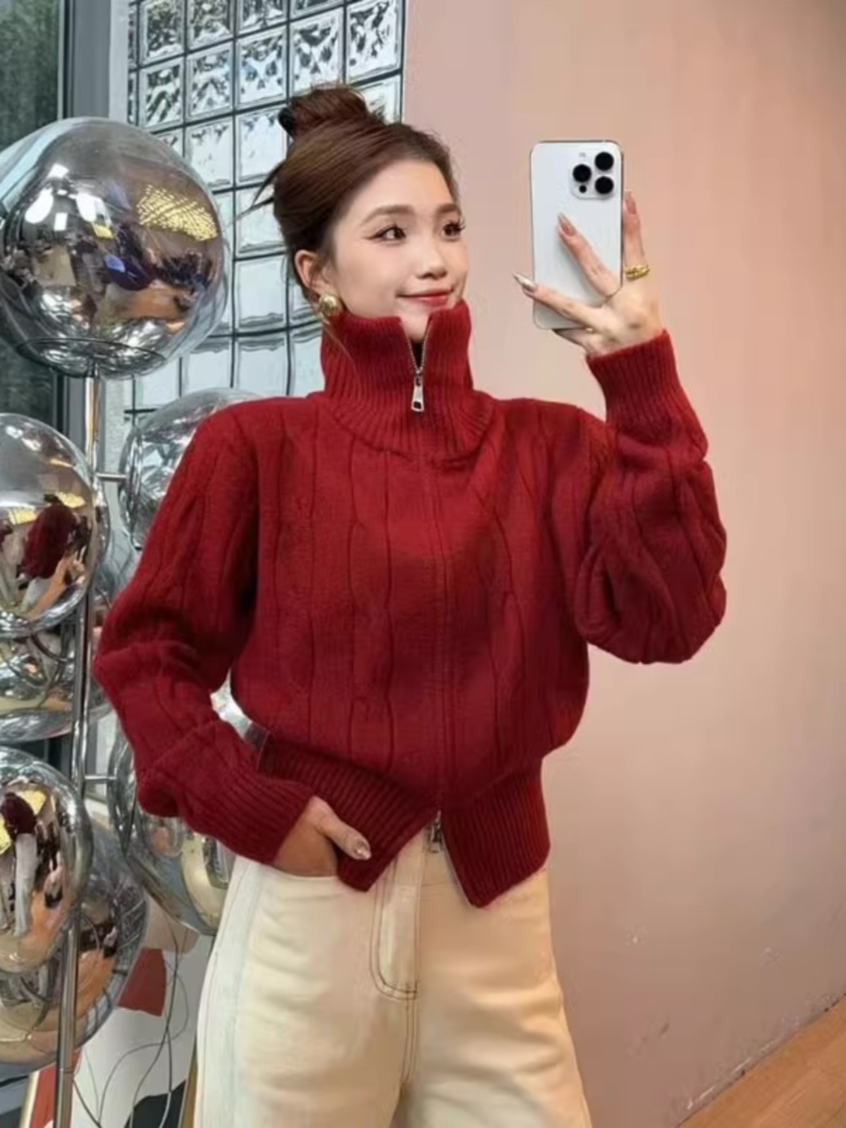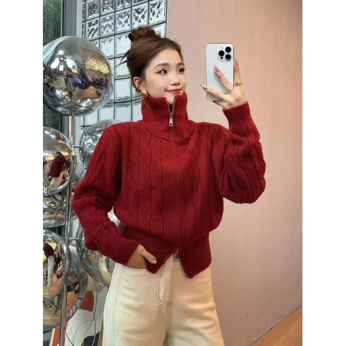 새해 크리스마스 더블 지퍼 터틀넥 레드 스웨터 여성의 가을과 겨울 두꺼운 게으른 스타일 니트 카디건스토어 가기