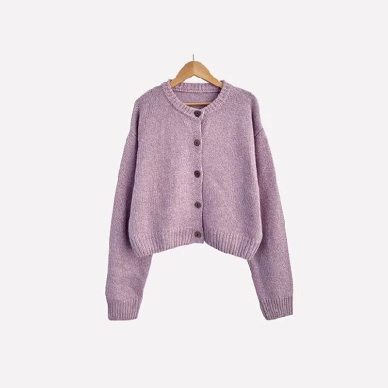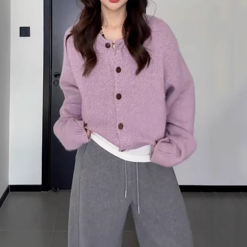 한국 스타일 부드러운 스타일 보라색 둥근 목 니트 카디건 여성의 가을과 겨울 새로운 게으른 스타일 스웨터 코트 센스 탑스토어 가기