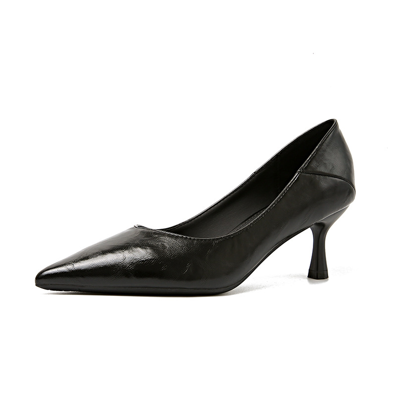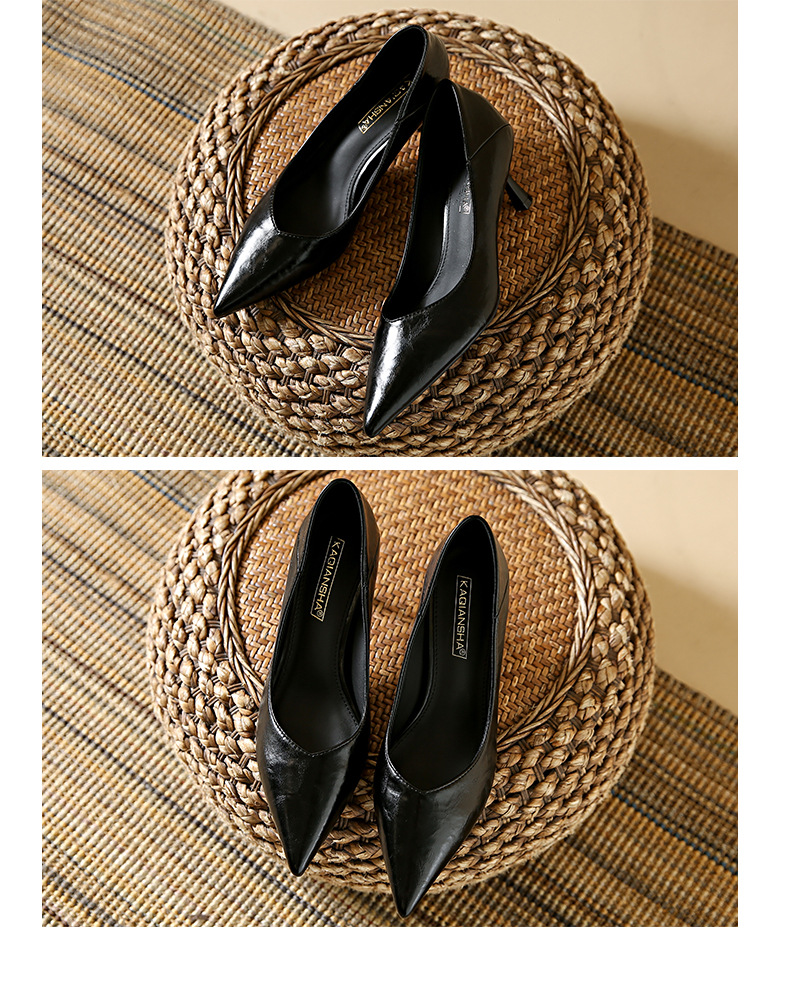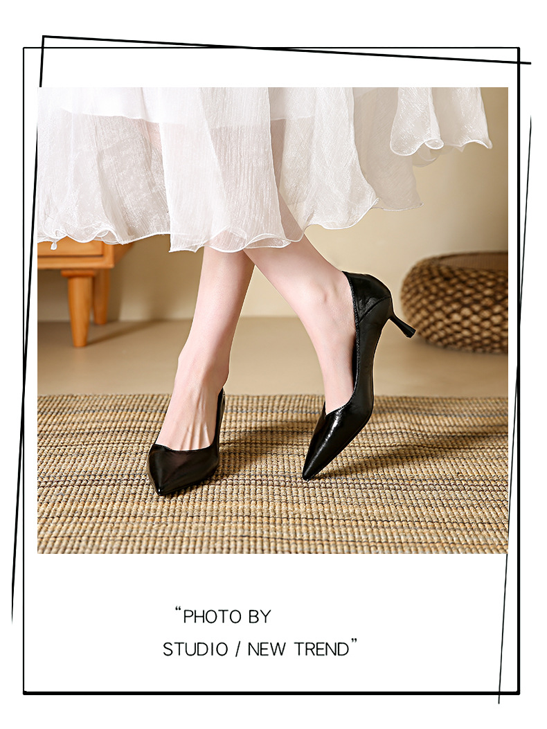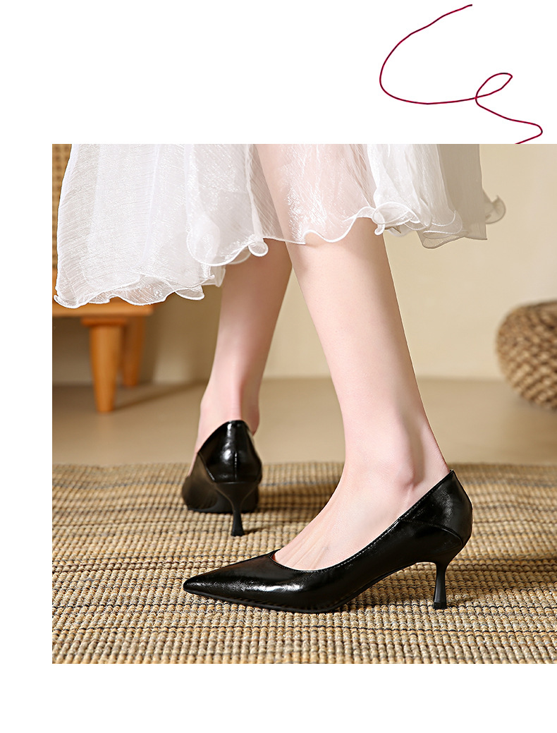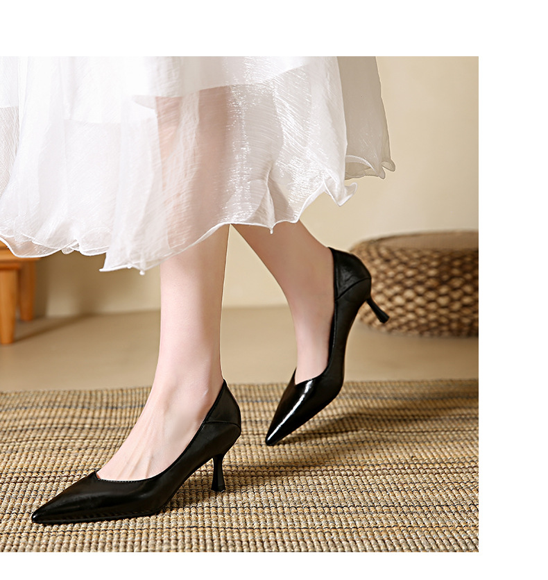 2025년 봄 신상 여성용 얇은 굽 하이힐, 출퇴근 및 업무용 블랙 소프트 가죽 구두, 고급스러운 뾰족코 디자인스토어 가기