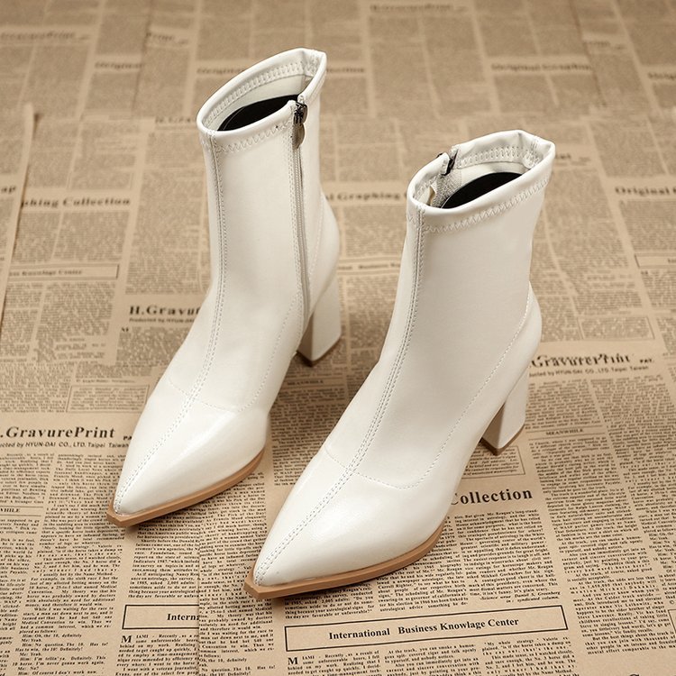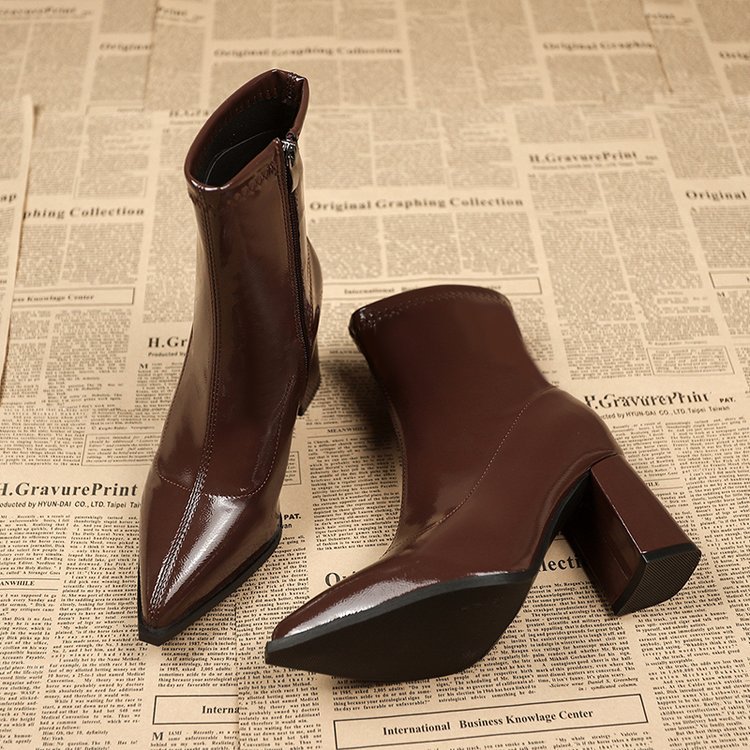 국경 간 플러스 사이즈 2024 새로운 뾰족한 두꺼운 힐 짧은 부츠 여성의 가을 및 겨울 하이힐 작은 프랑스 발목 부츠 재고스토어 가기