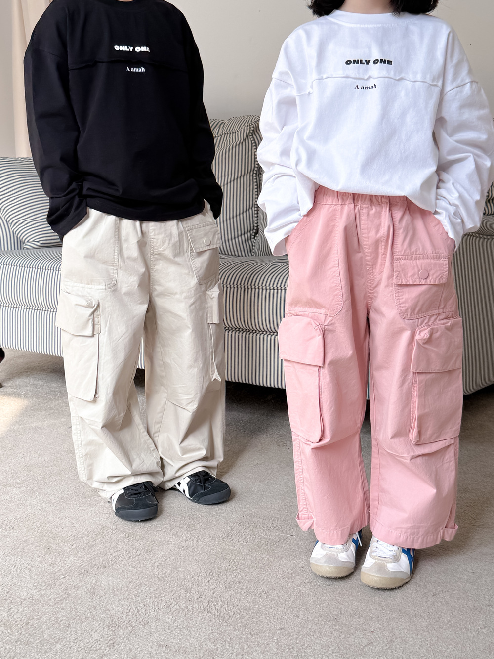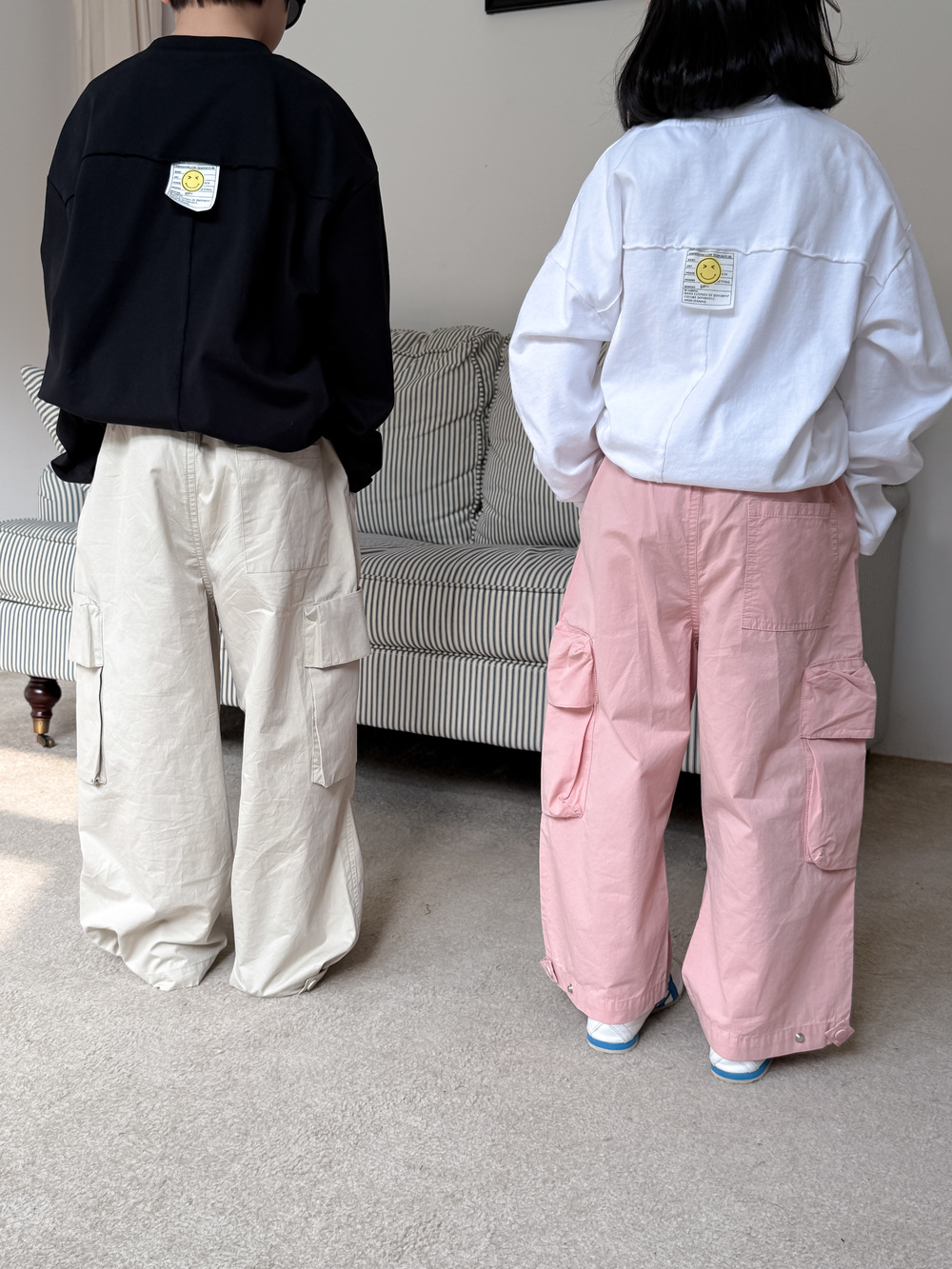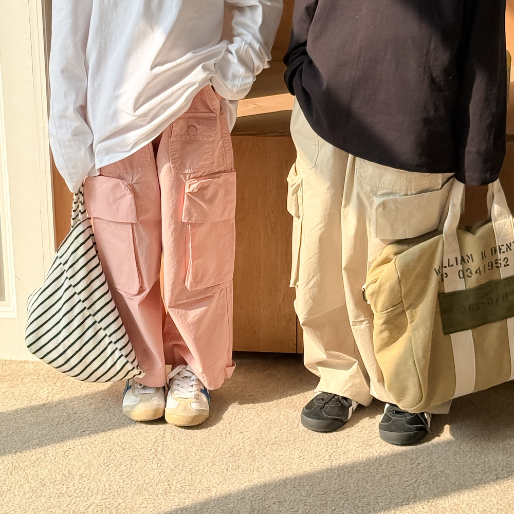 어린이 바지 2025 봄 소년과 소녀 한국식 단색 캐주얼 작업 스트레이트 바지 어린이 느슨한 대형 포켓 와이드 레그 바지스토어 가기