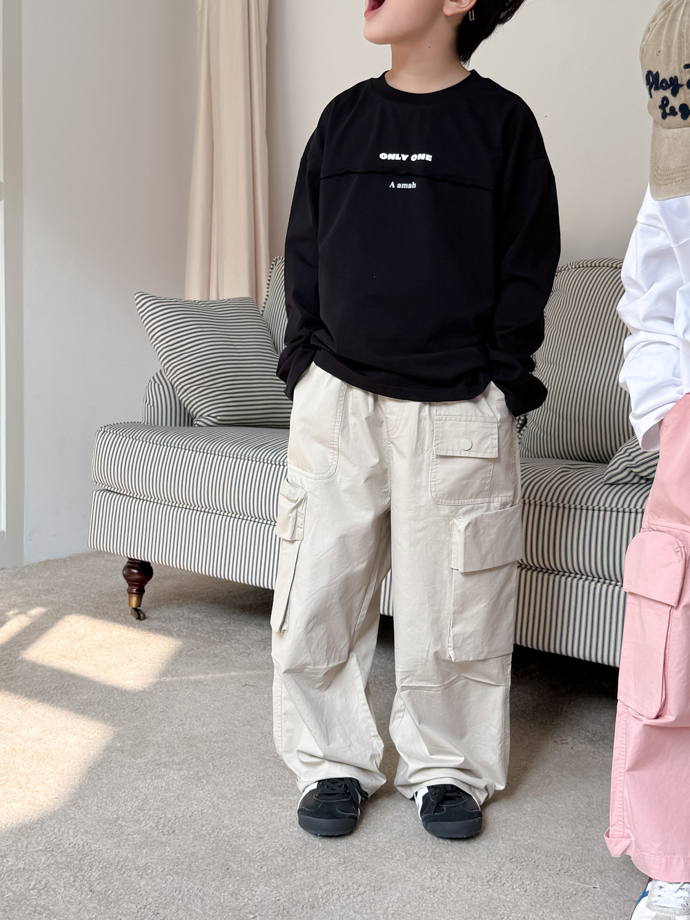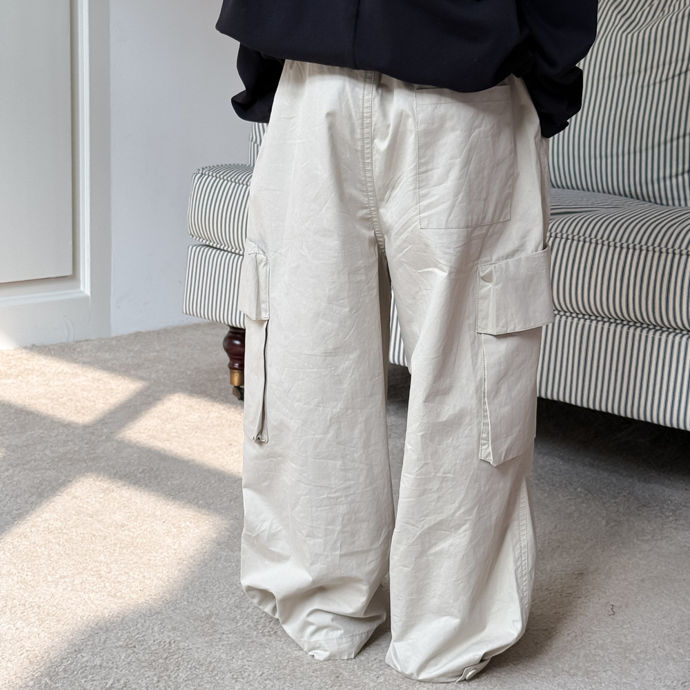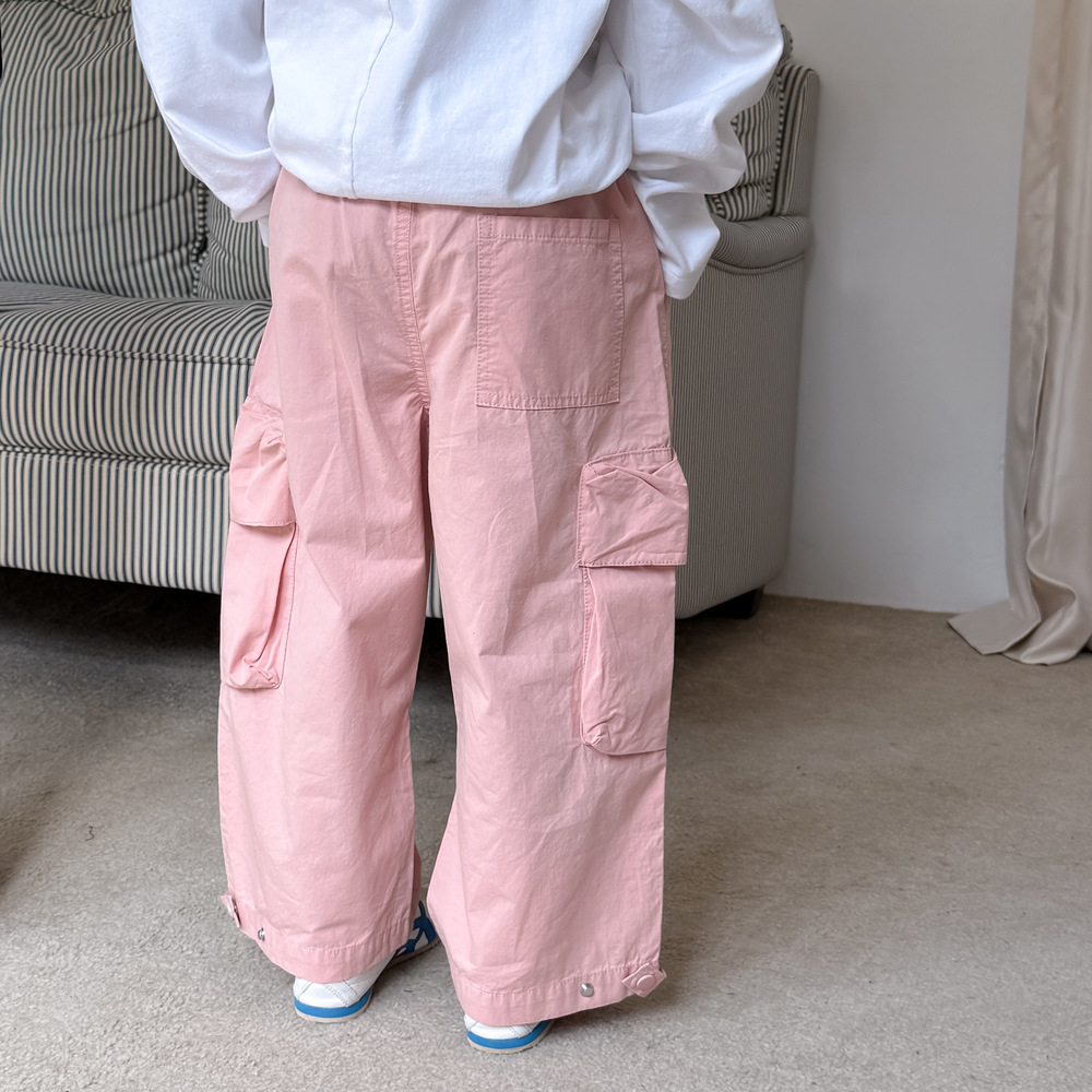 어린이 바지 2025 봄 소년과 소녀 한국식 단색 캐주얼 작업 스트레이트 바지 어린이 느슨한 대형 포켓 와이드 레그 바지
