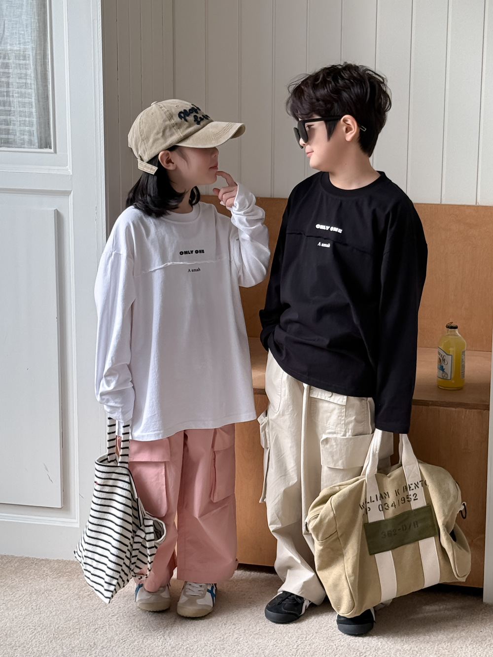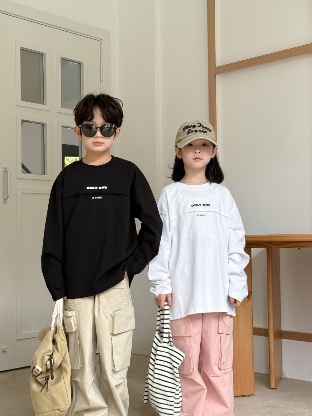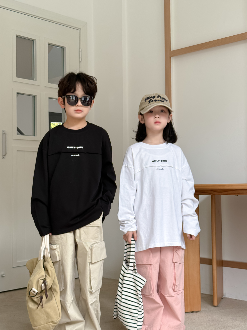 어린이 바지 2025 봄 소년과 소녀 한국식 단색 캐주얼 작업 스트레이트 바지 어린이 느슨한 대형 포켓 와이드 레그 바지