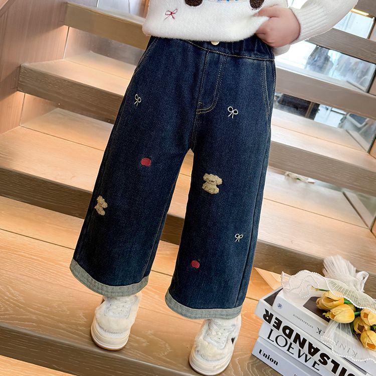 女童加绒裤子秋冬款2024新款儿童装宽松牛仔裤宝宝冬季直筒阔腿裤