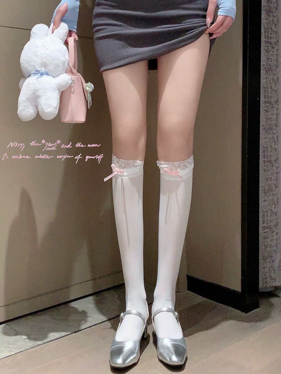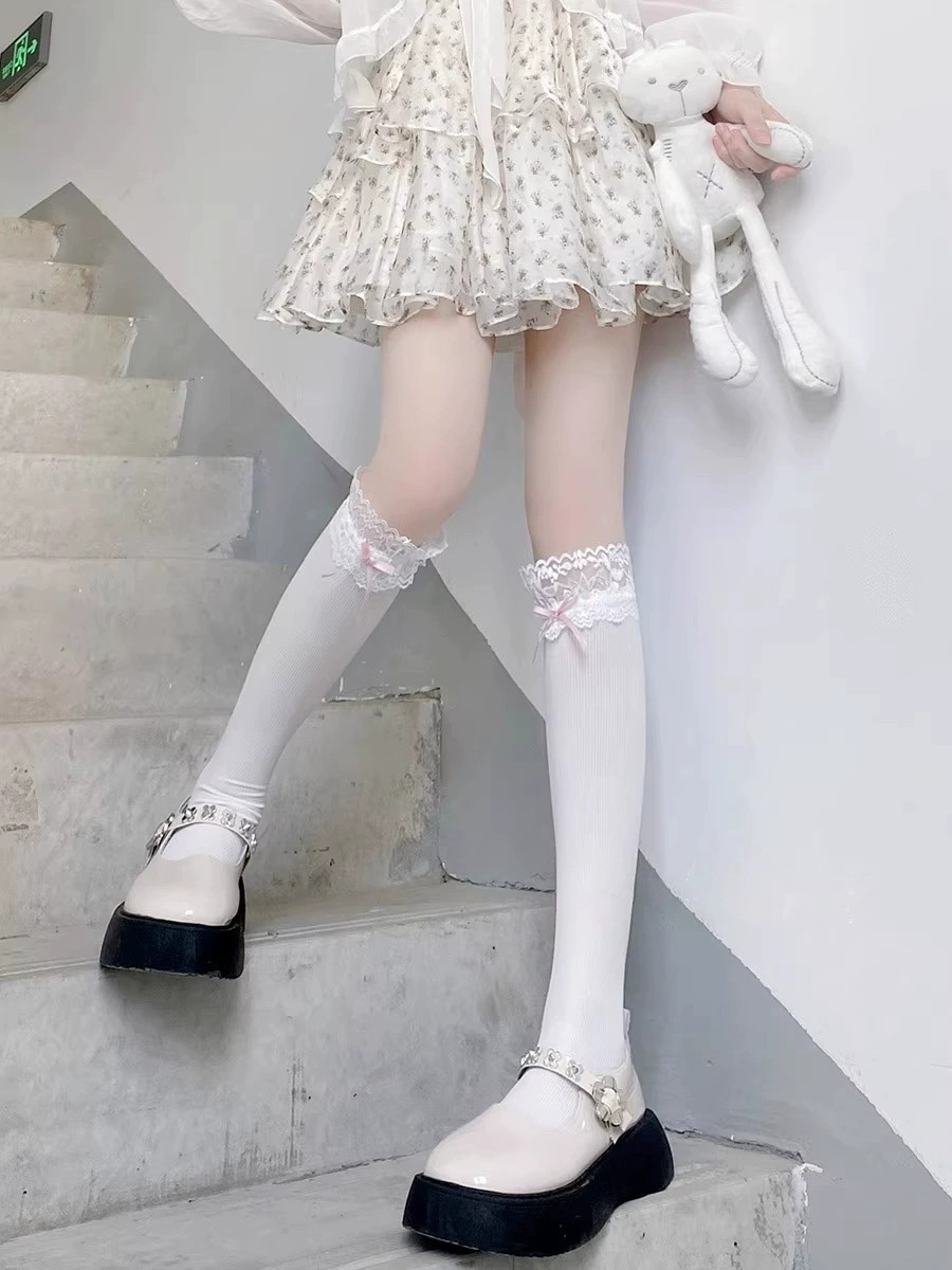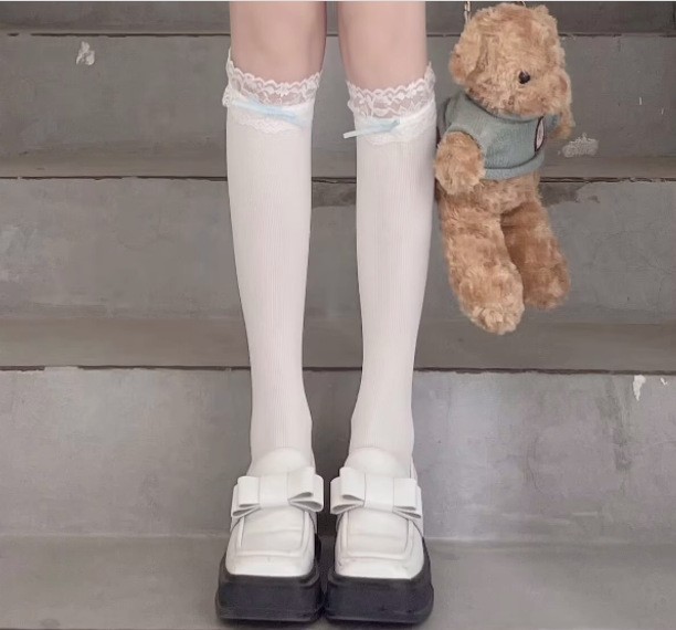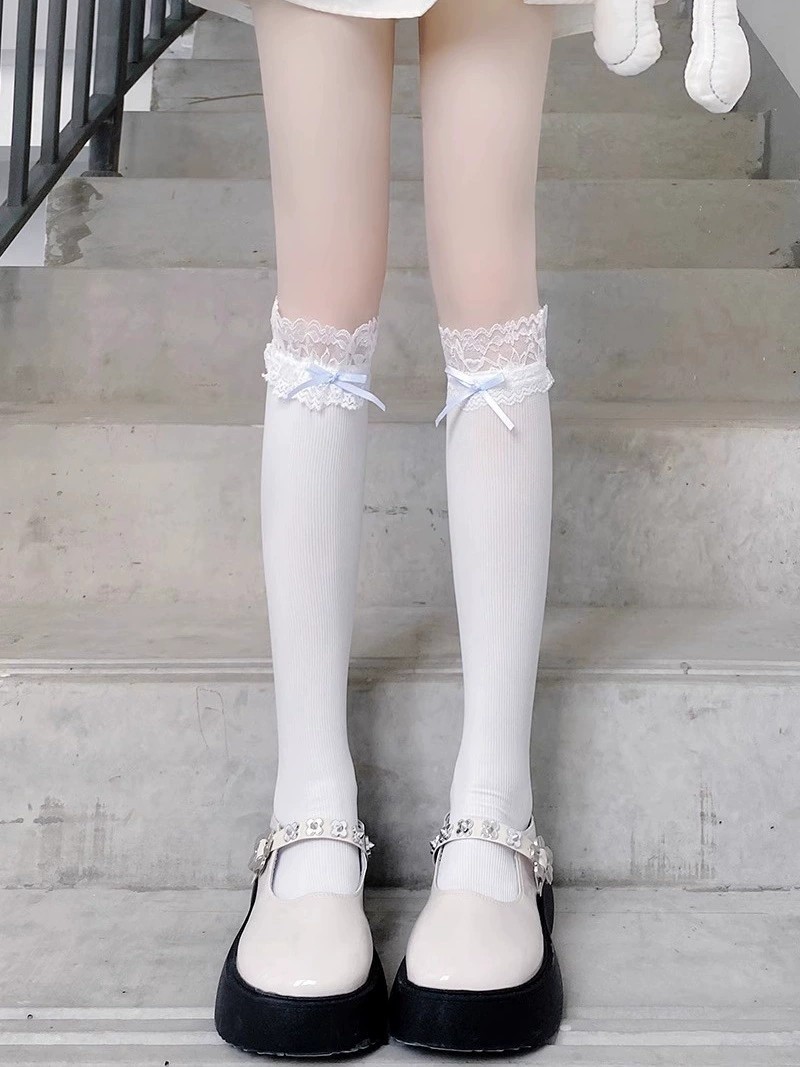 여름 귀여운 화이트 파우더 활 대학 스타일 종아리 양말 jk 소녀 벨벳 바느질 긴 레이스 양말스토어 가기