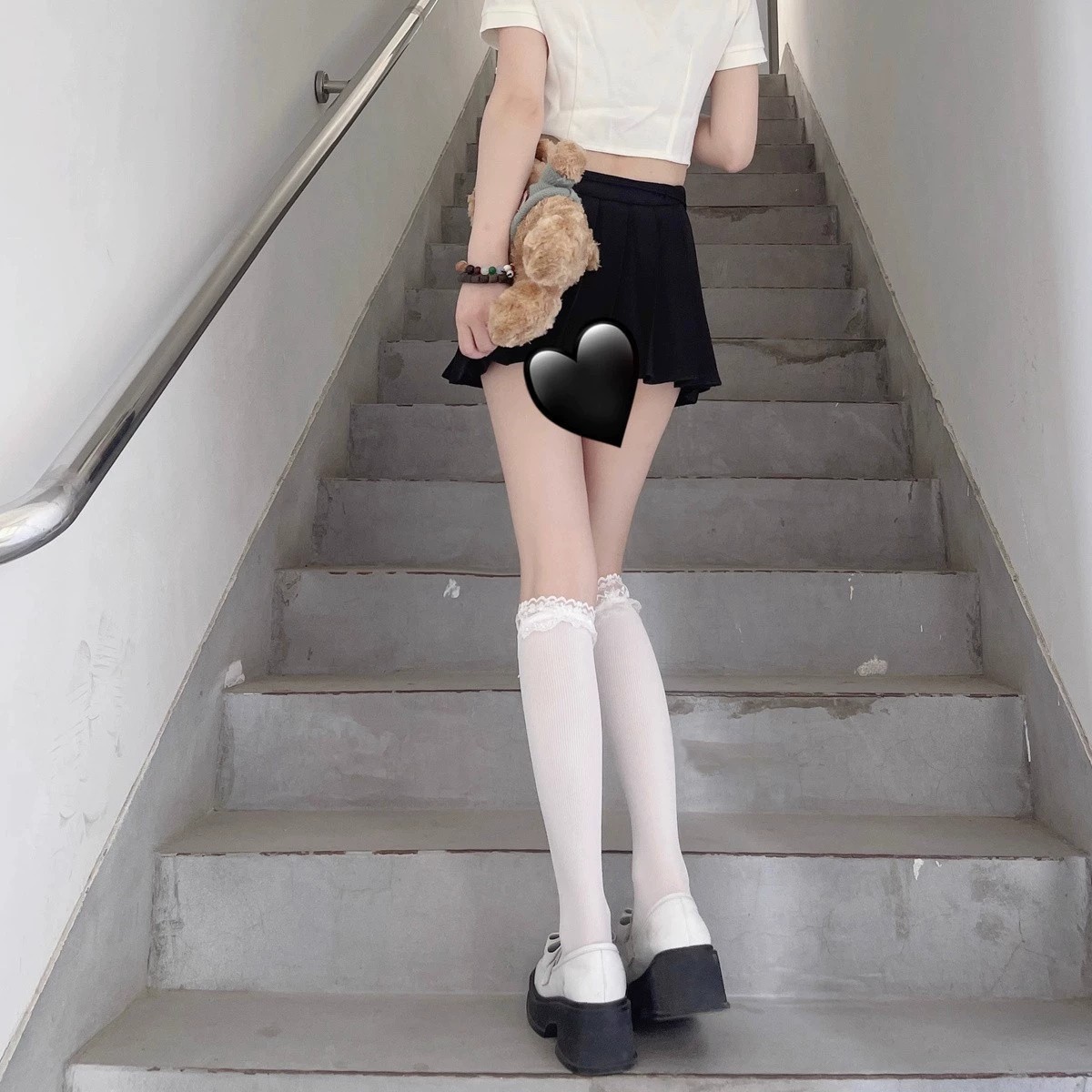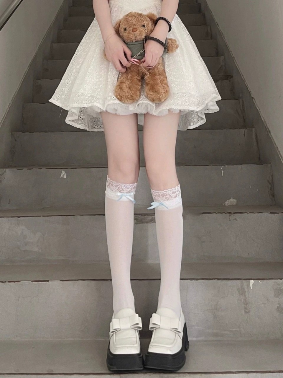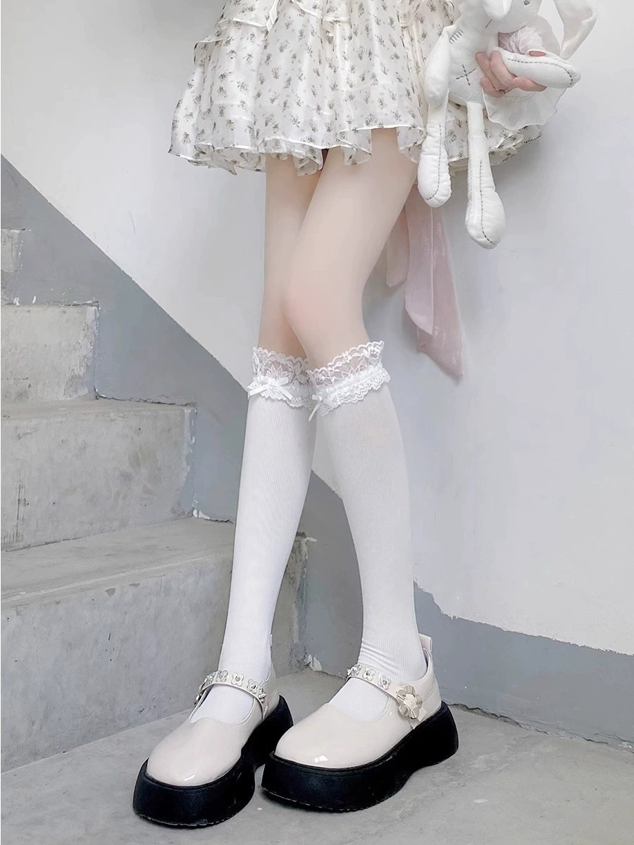 여름 귀여운 화이트 파우더 활 대학 스타일 종아리 양말 jk 소녀 벨벳 바느질 긴 레이스 양말스토어 가기