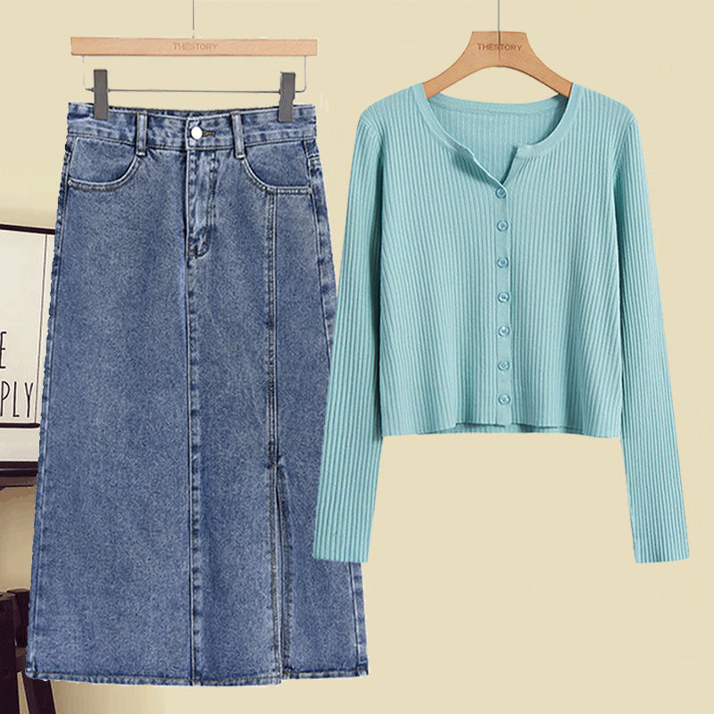 • 그린 탑 + 데님 스커트 [투피스 세트]
