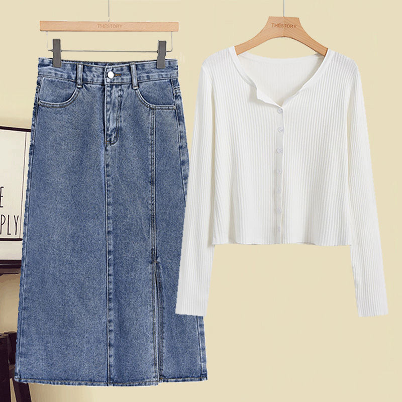 • 화이트 탑 + 데님 스커트 [투피스 세트]