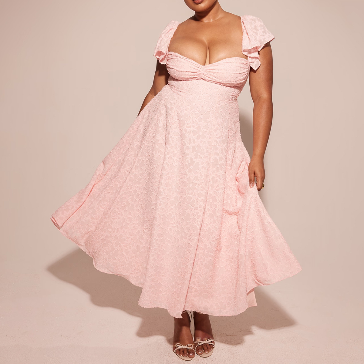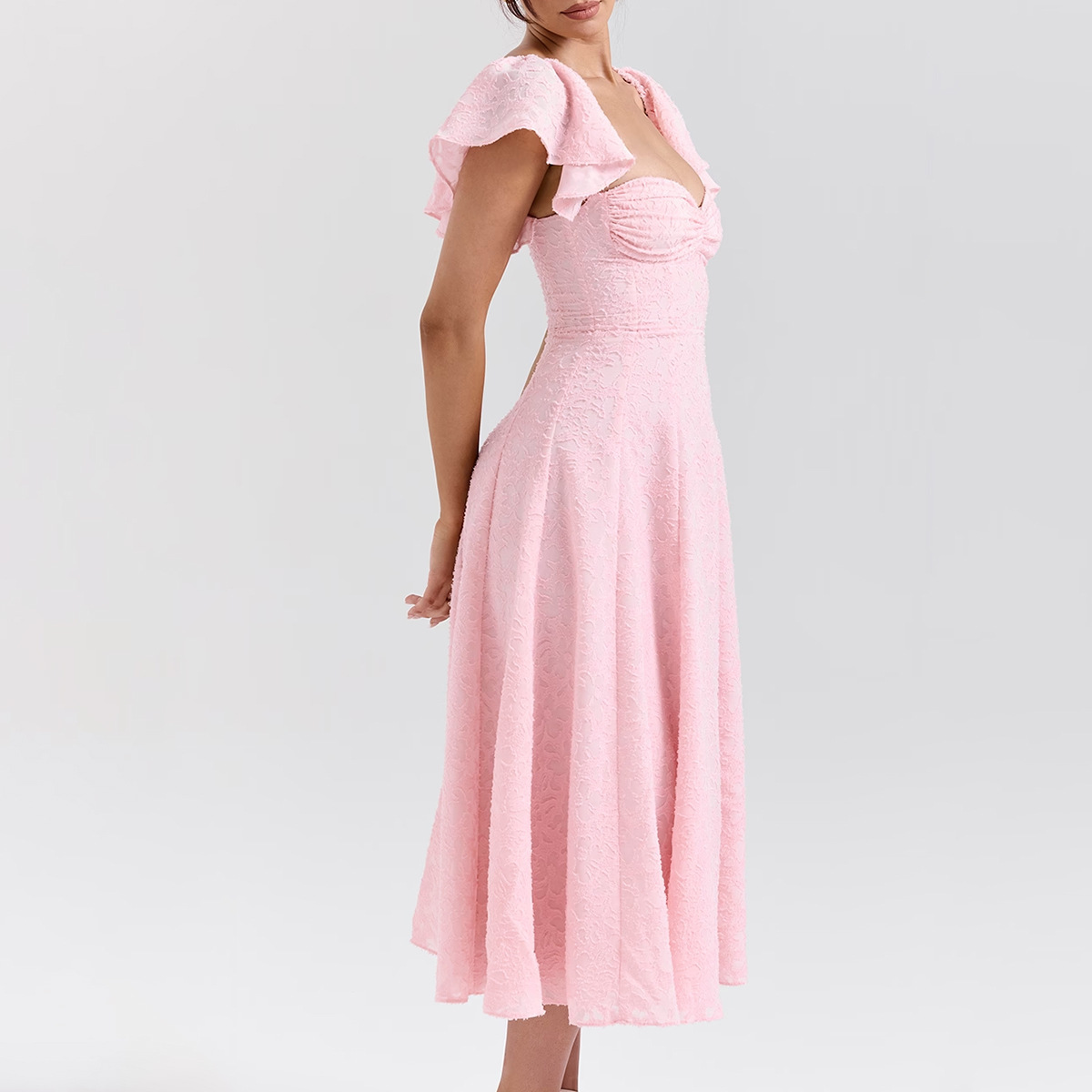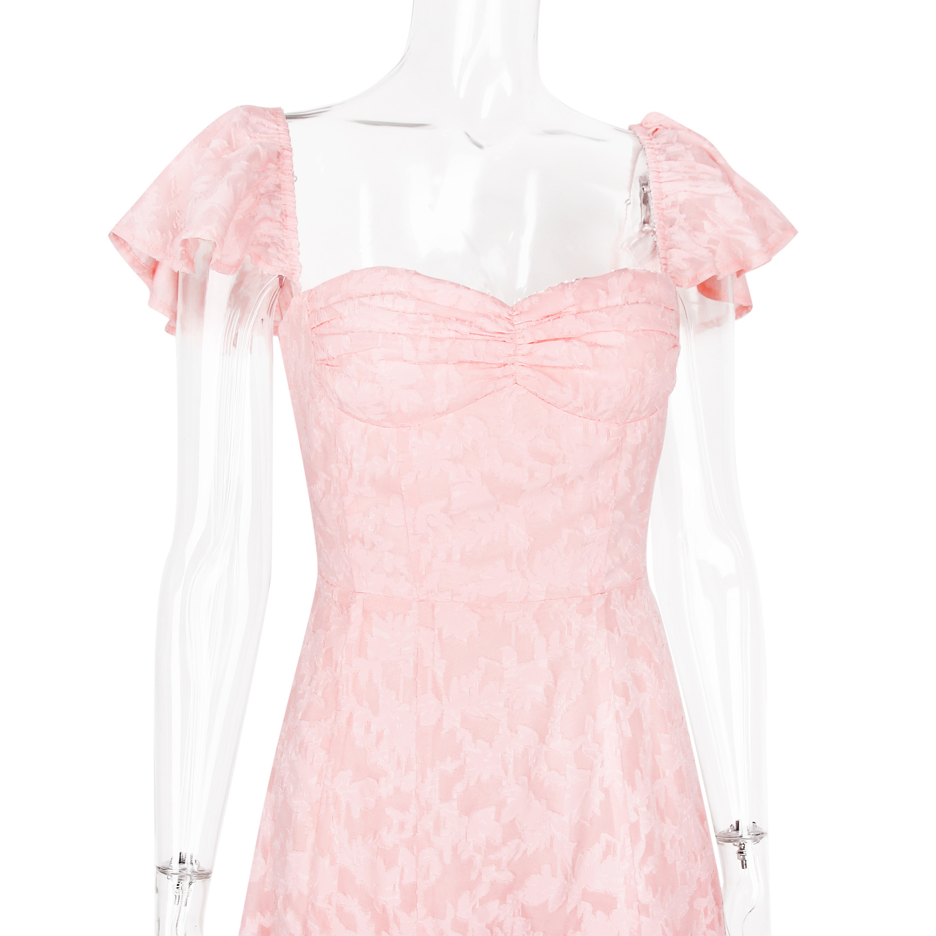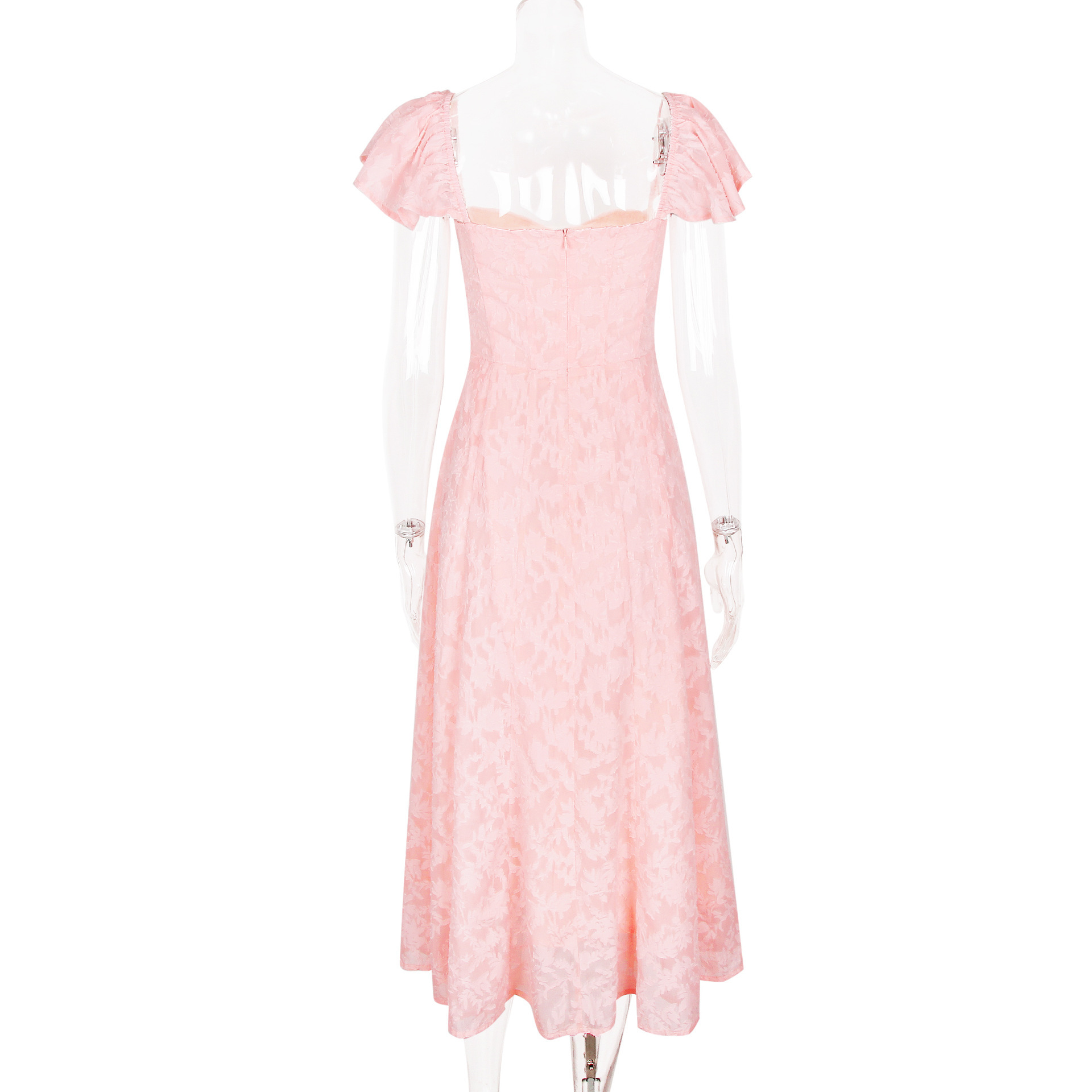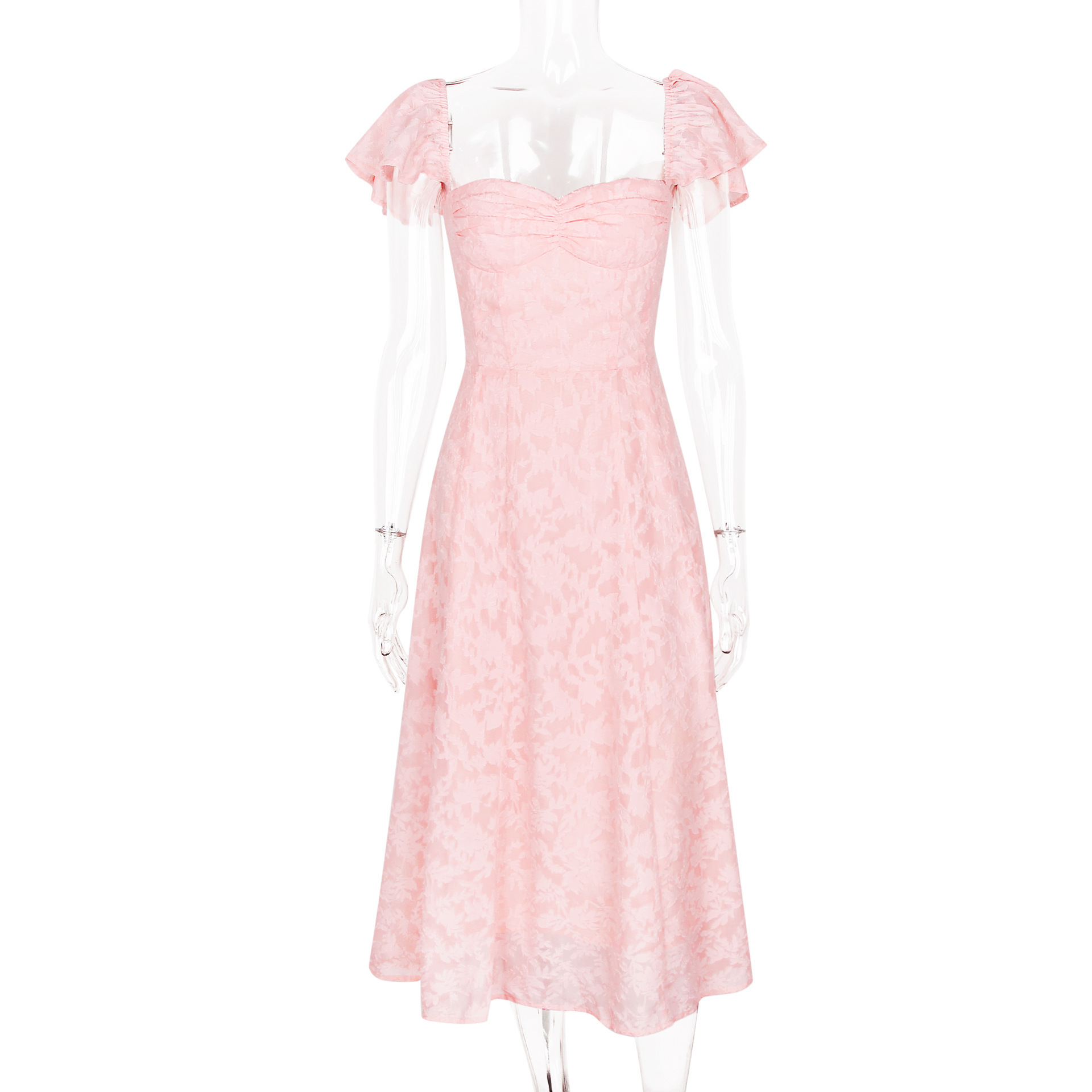 여성용 하이 엔드웨어 뉴 핑크 섹시 스퀘어 칼라 타이트 허리 백리스 미디 원피스 프랑스 원피스 스위트